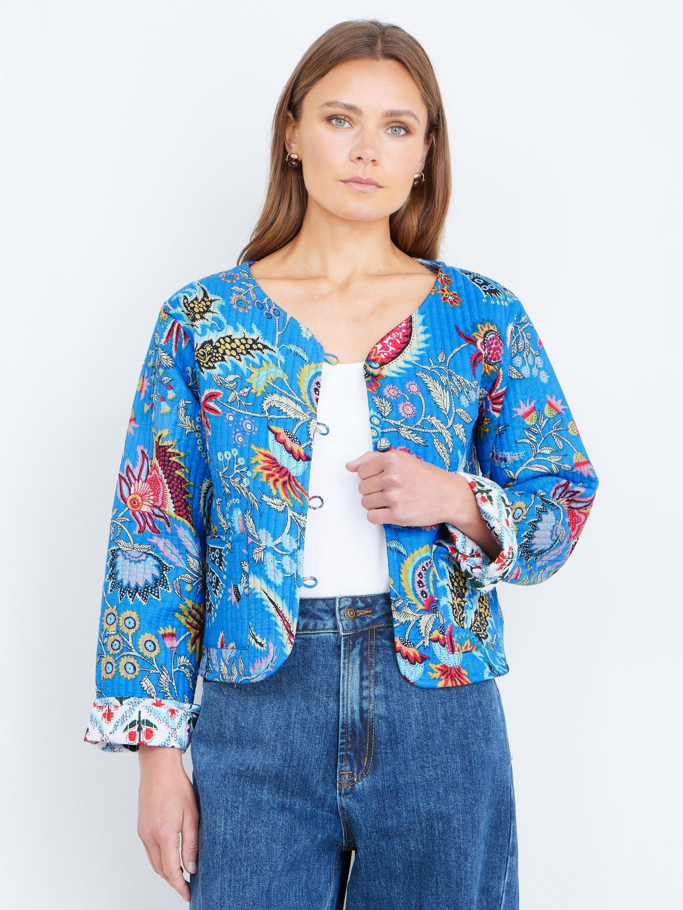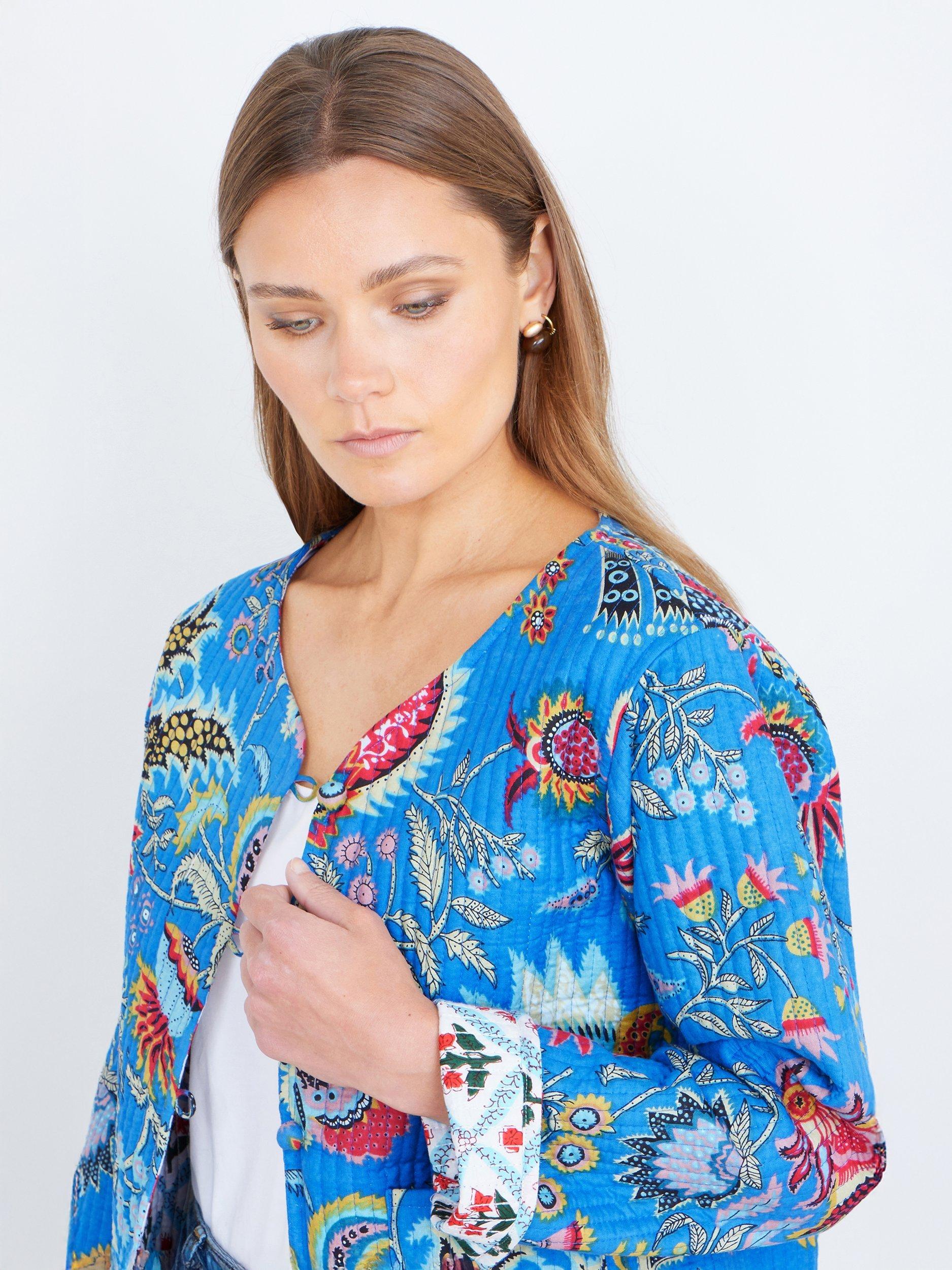 This vibrant jacket features an eye-catching bohemian floral print, bringing a lively burst of colour to any outfit. Made from soft, breathable cotton, it offers a comfortable, lightweight feel perfect for layering. Its cleverly designed reversible construction gives you two looks in one—switch between the bold outer pattern and the contrasting inner print for effortless styling versatility. With its relaxed fit, rounded neckline, and rolled cuffs that reveal the alternate design, this jacket adds an artisanal, travel-inspired touch to your wardrobe.