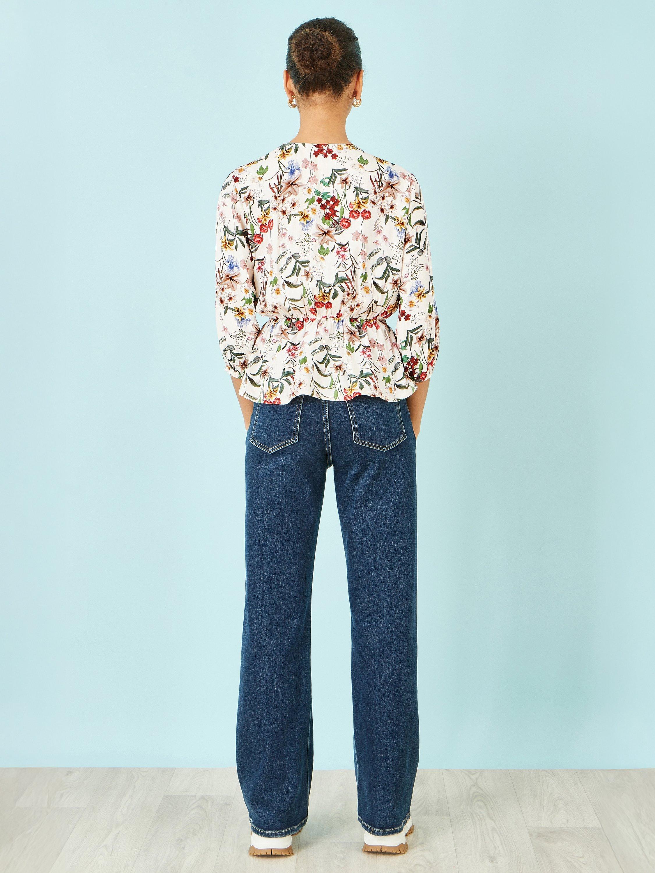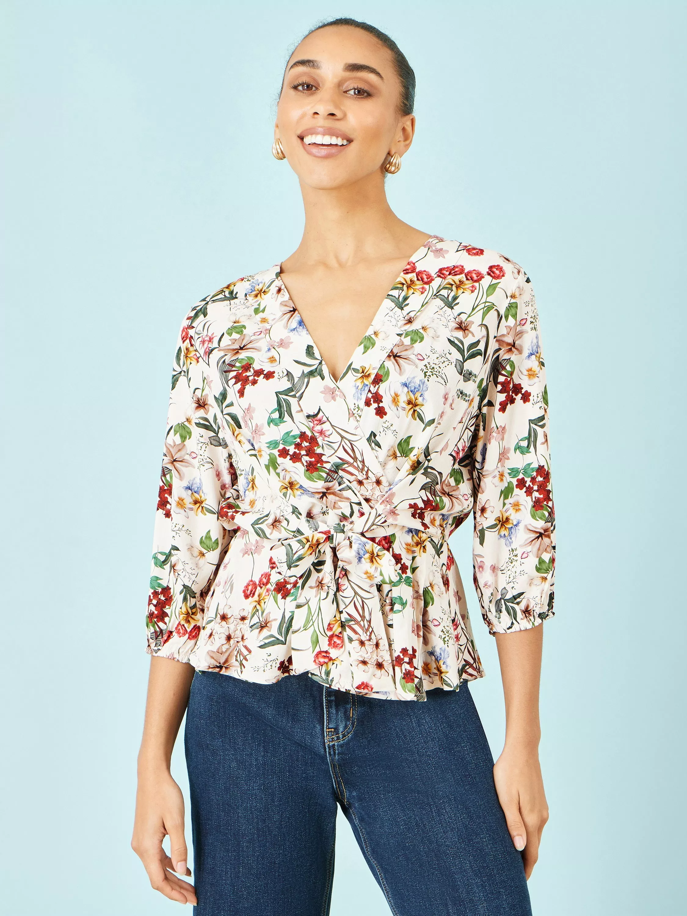 A wrap top from Yumi. Featuring a V-neck and three-quarter length sleeves, it will brighten your wardrobe with its pretty floral print. A wear-everywhere essential.
