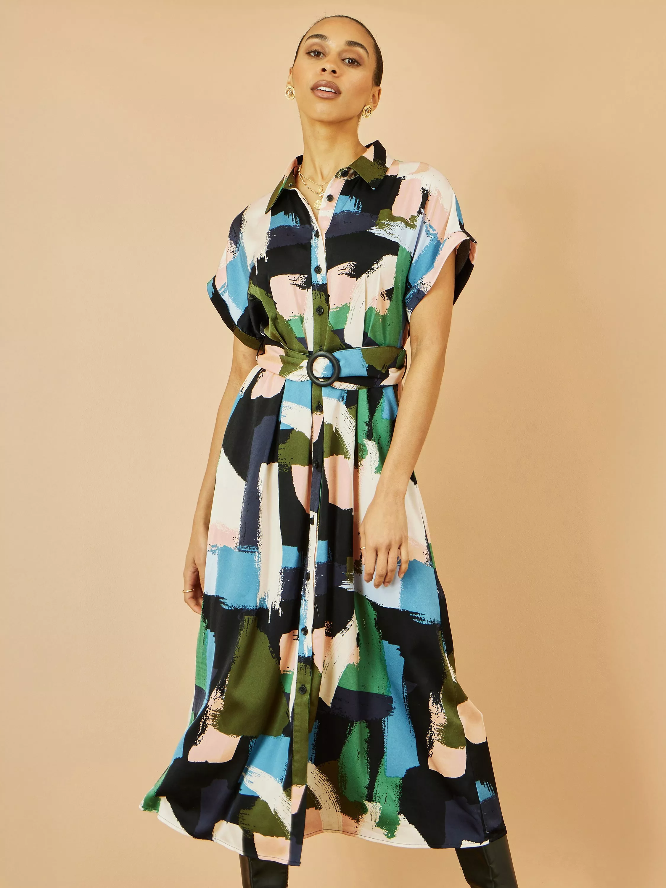 This bold and beautiful belted dress is perfect for office to weekend attire. The big brushstroke print is unique and gives a standout look. The drop sleeve shape with button-down fastening gives this shirt dress its relaxed yet chic vibes. Wear with trainers for an easy fit or pair with boots in the cooler weather.