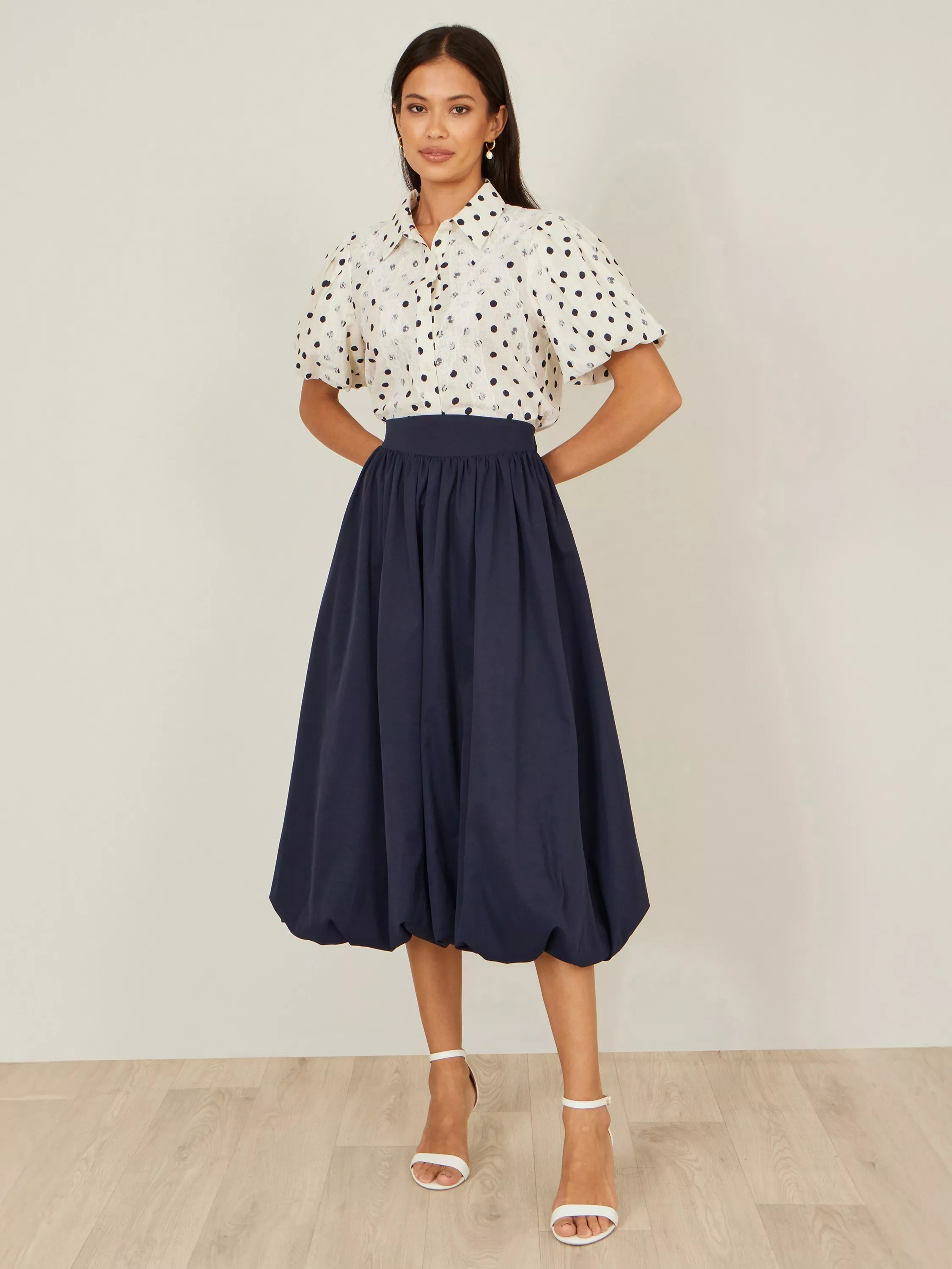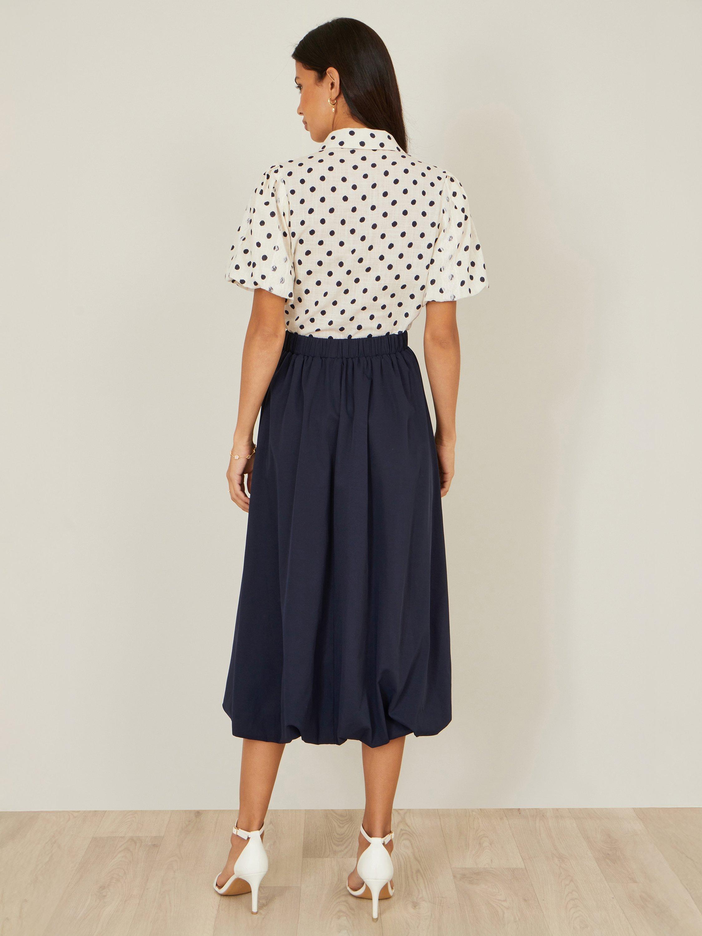 Super cute and perfect for styling for casual day looks or something a little fancier. With a midi length and bubble style tucked hemline, this skirt will be something you wear again and again. The satin fabric is chic and feels luxe for any fit. Wear with a blouse or knitwear, sequins or plain T-shirts.