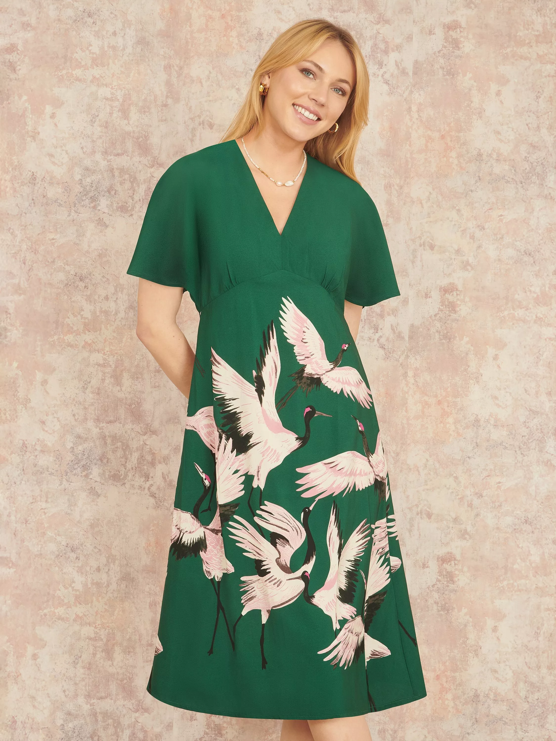 What could be better than a new take on a classic shape? One with a decadent Crane print, lovingly designed in house. The supersoft lightweight recycled fabric of this midi dress drapes over the knee in a relaxed shape, balanced by flared sleeves and a pretty V-neckline. Don't be surprised if you turn heads.