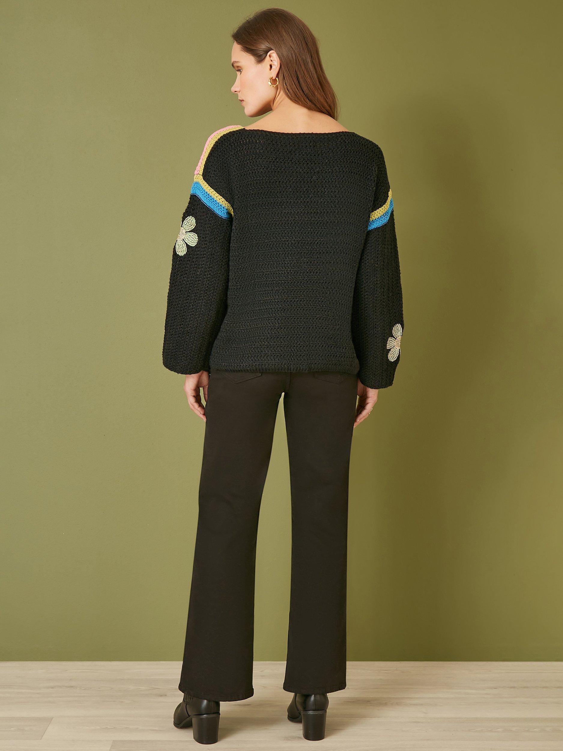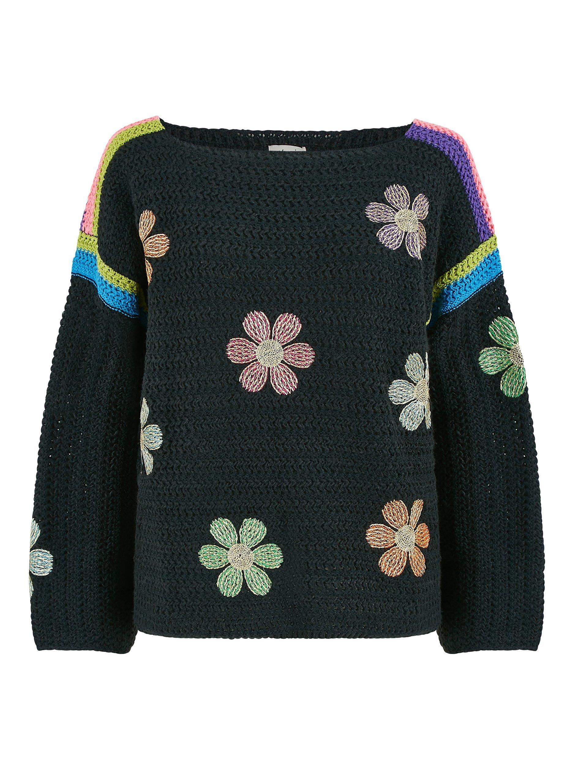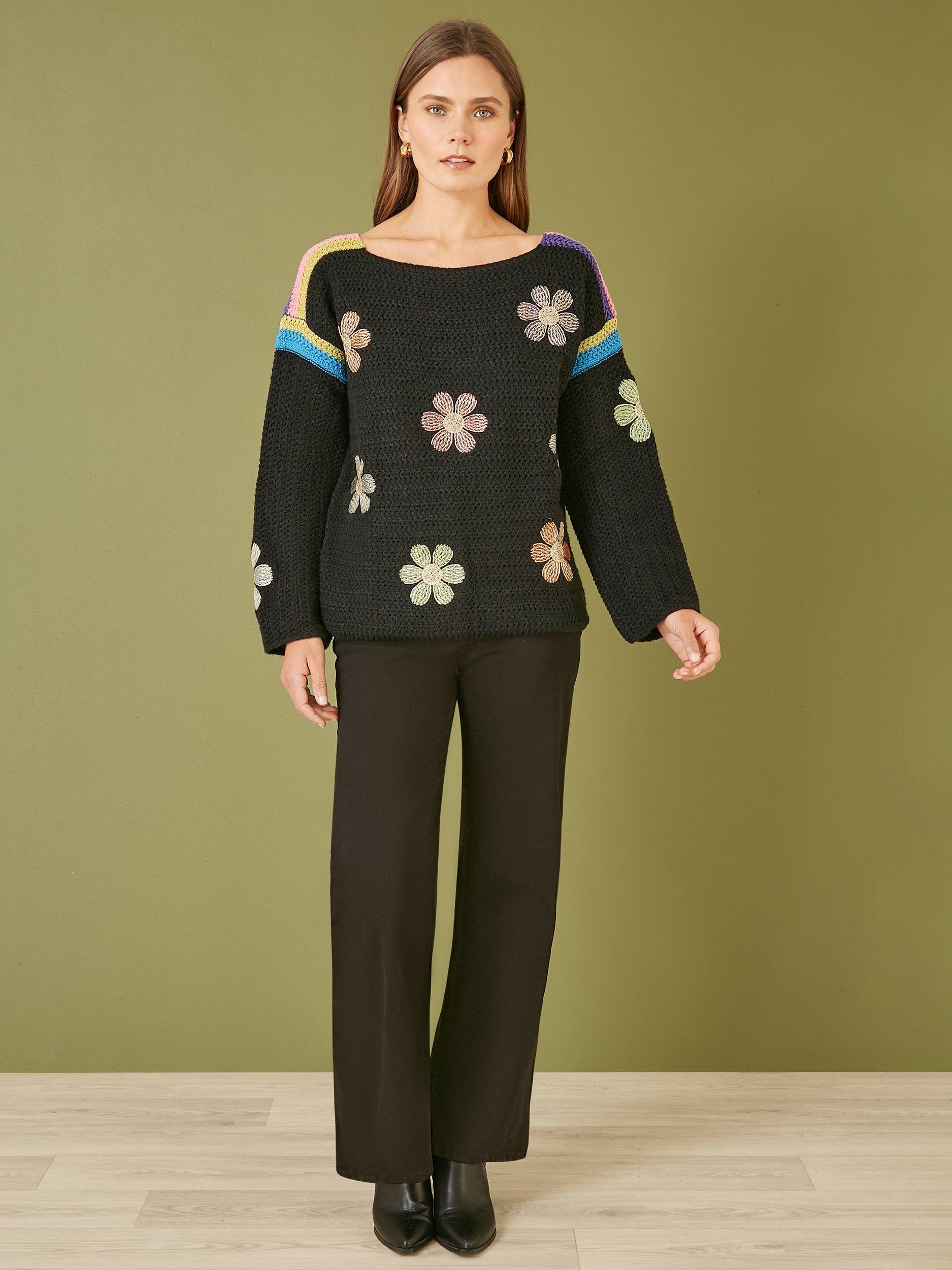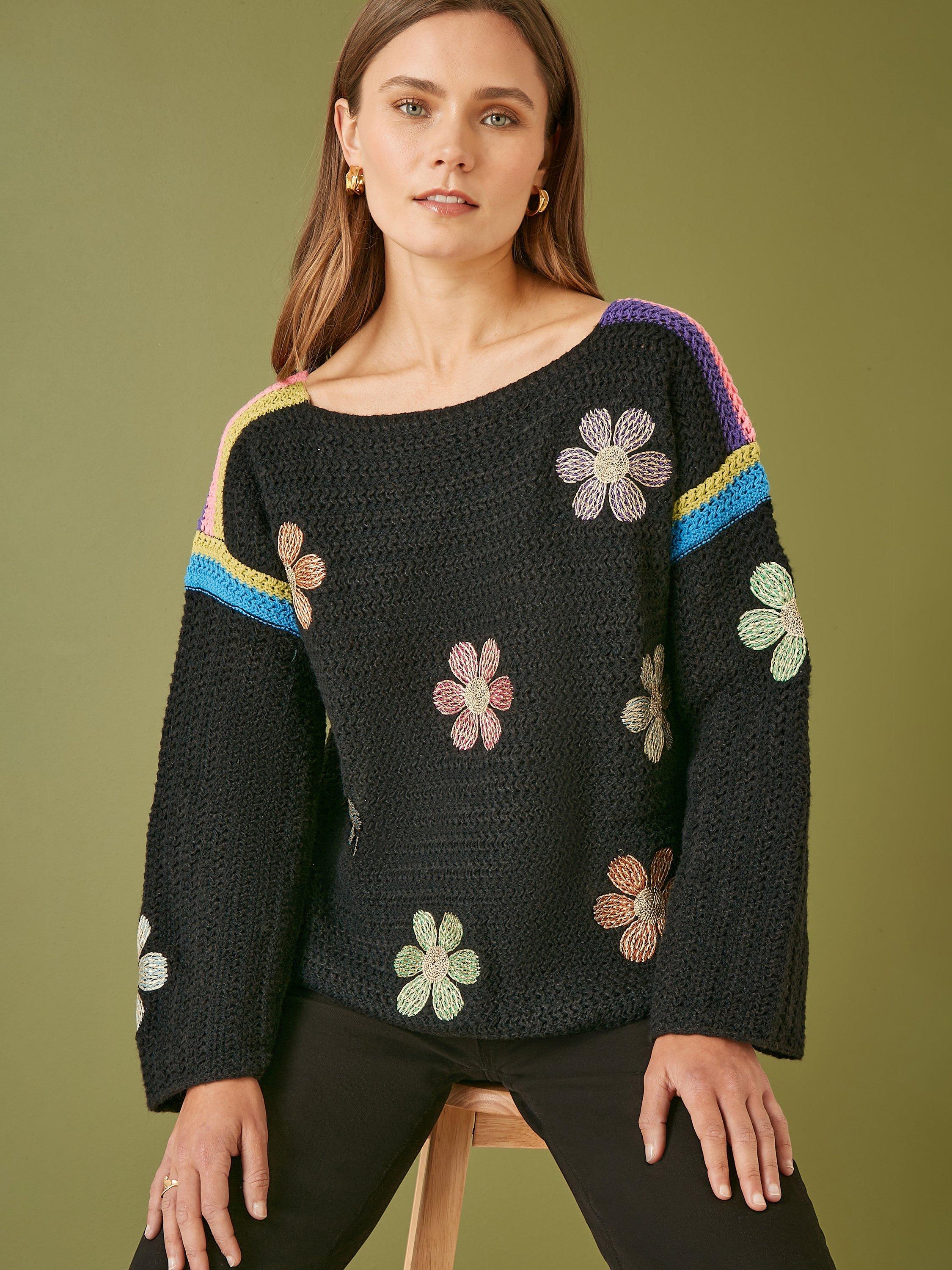 Flower power for the summer - in a crochet knit, with oversized flowers that are in lovely shades of pastel. With stripes on the shoulders to add another pop of colour, and a lovely relaxed fit. Wear with wide leg trouser and trainers for a super adorable fit.