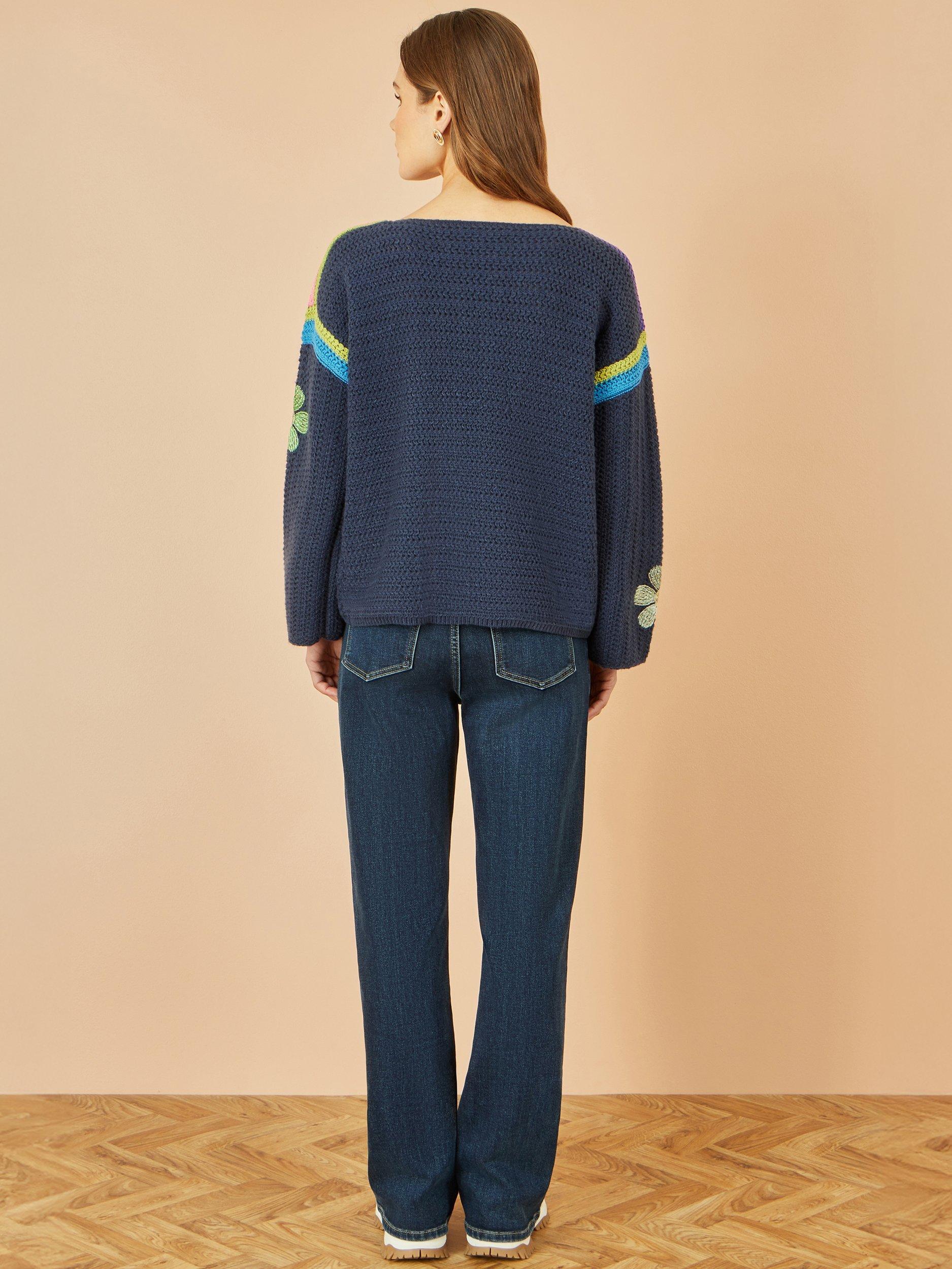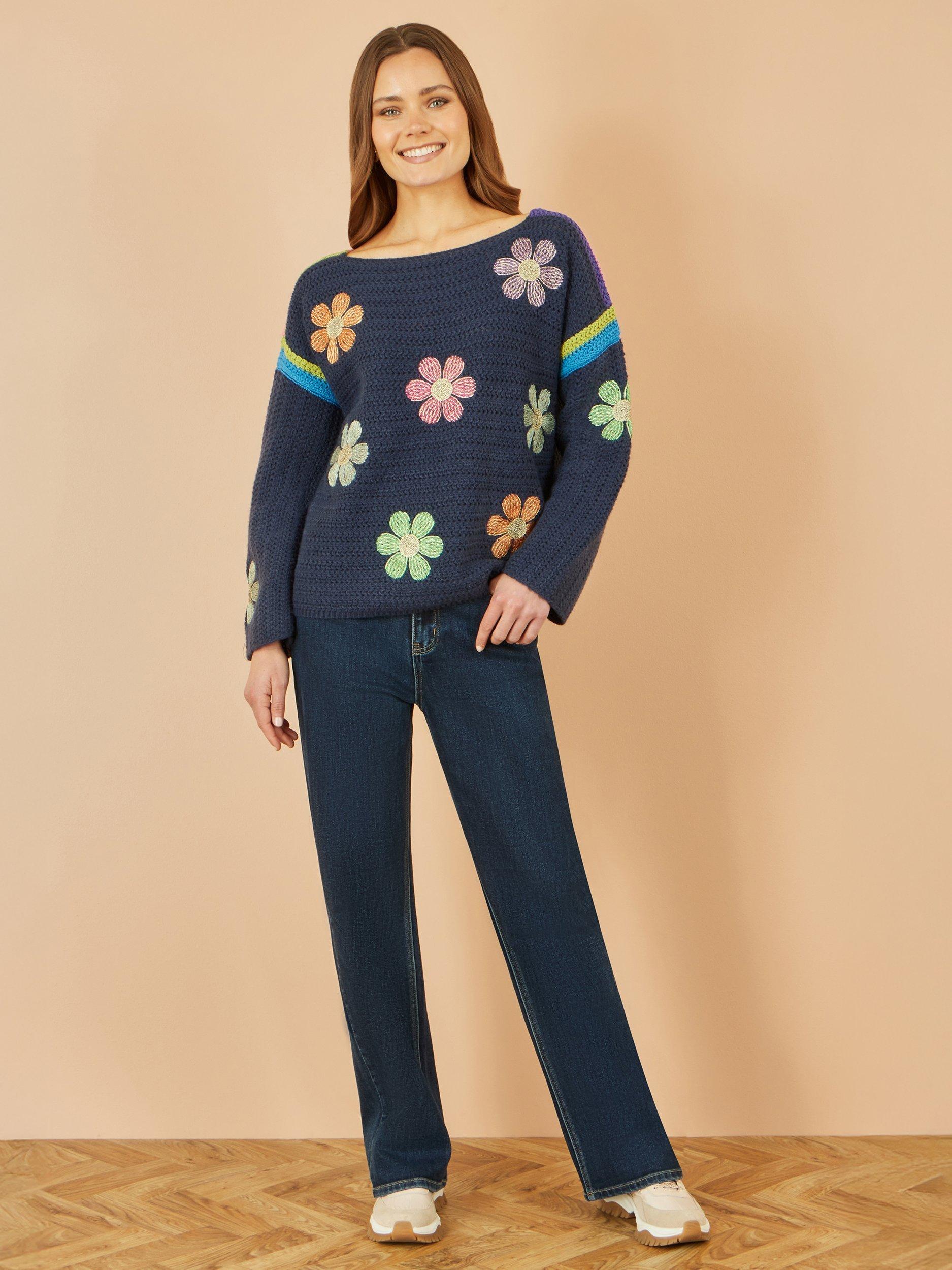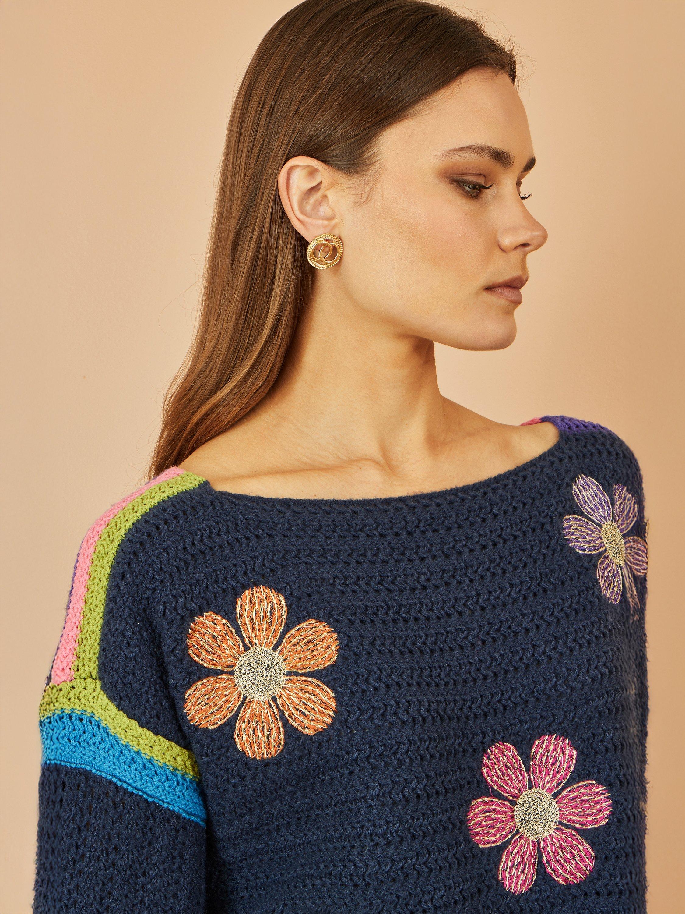 Flower power for the summer - in a crochet knit, with oversized flowers that are in lovely shades of pastel. With stripes on the shoulders to add another pop of colour, and a lovely relaxed fit. Wear with wide leg trouser and trainers for a super adorable fit.