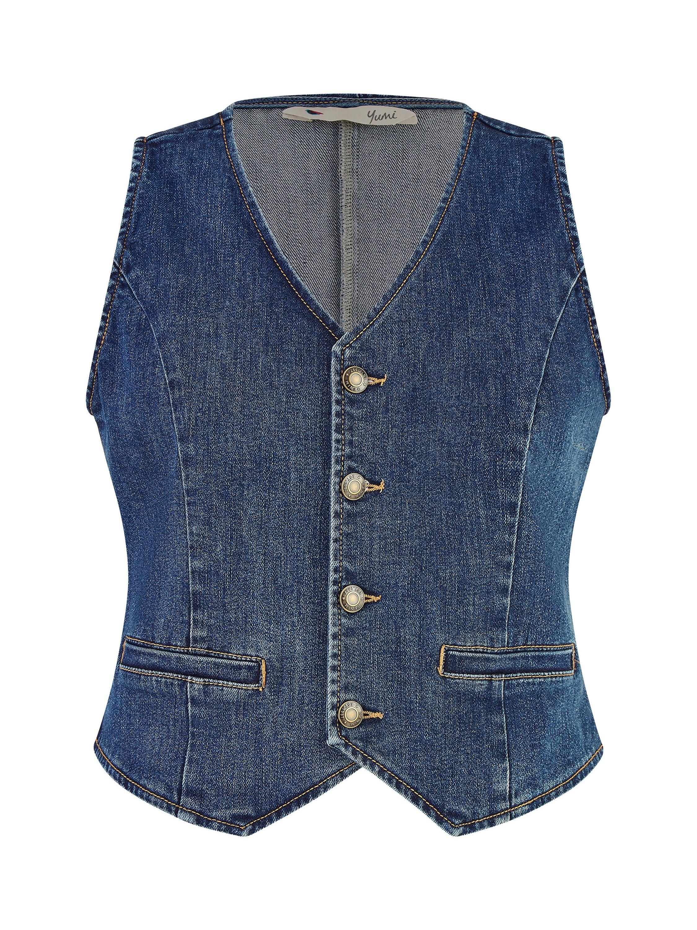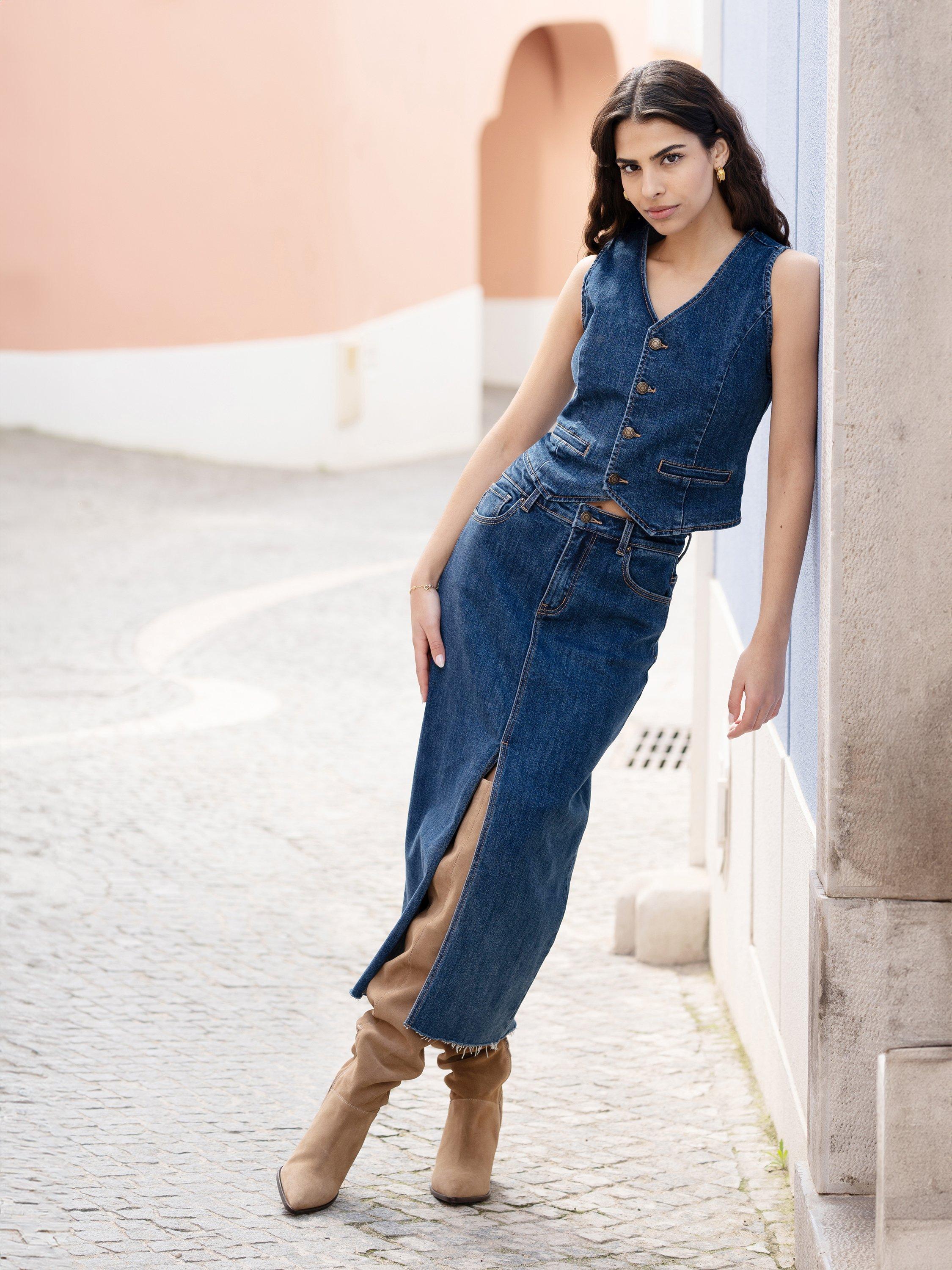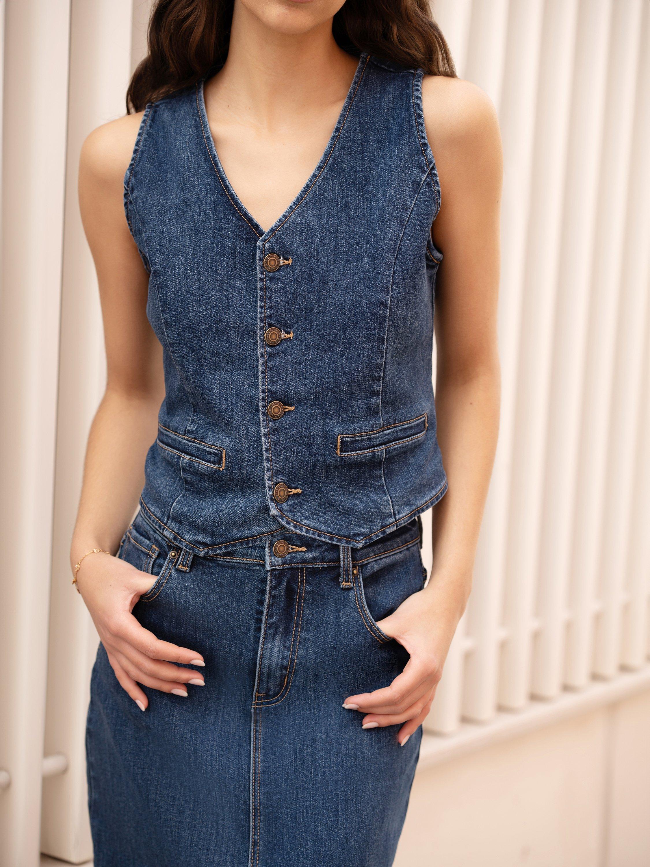 Double up on denim for the ultimate stylish fit this season. With a matching midi skirt available, this fitted waistcoat looks amazing styled over a T-shirt, or alone. Join the western trend with confidence, with a button up front, V-neckline and pockets all crafted from a luxe stretch denim.