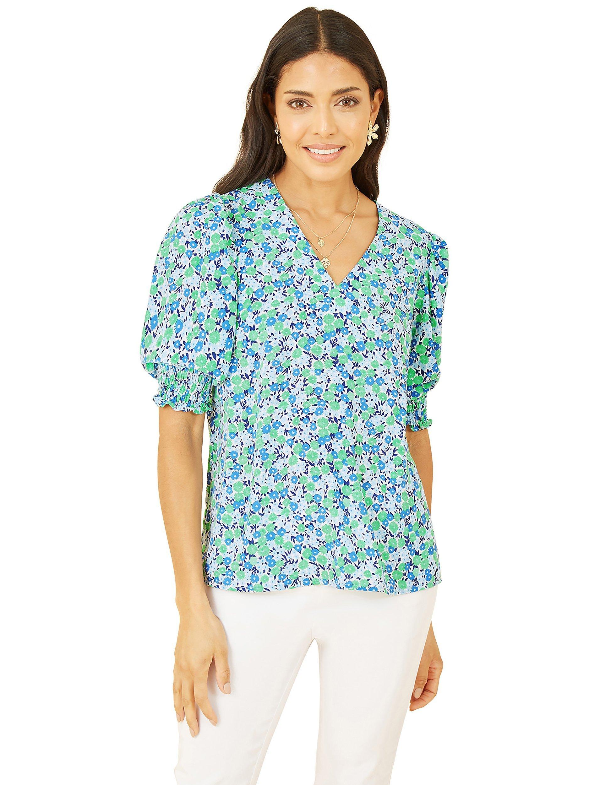 Framed with a v-neckline and puff sleeves, it is made with durable fabric for longevity of wear and slips on well with tonal denim ready for the summer.
