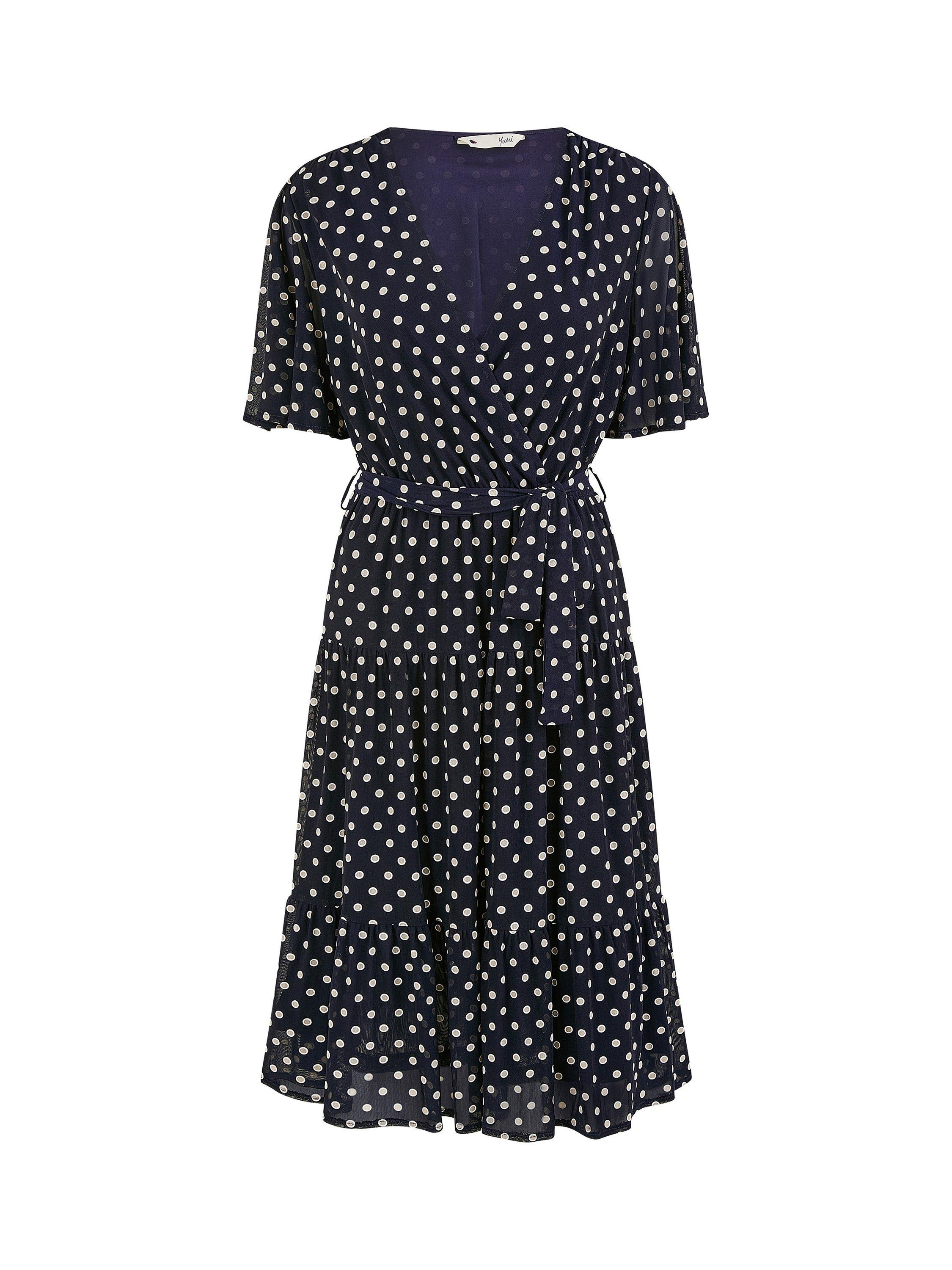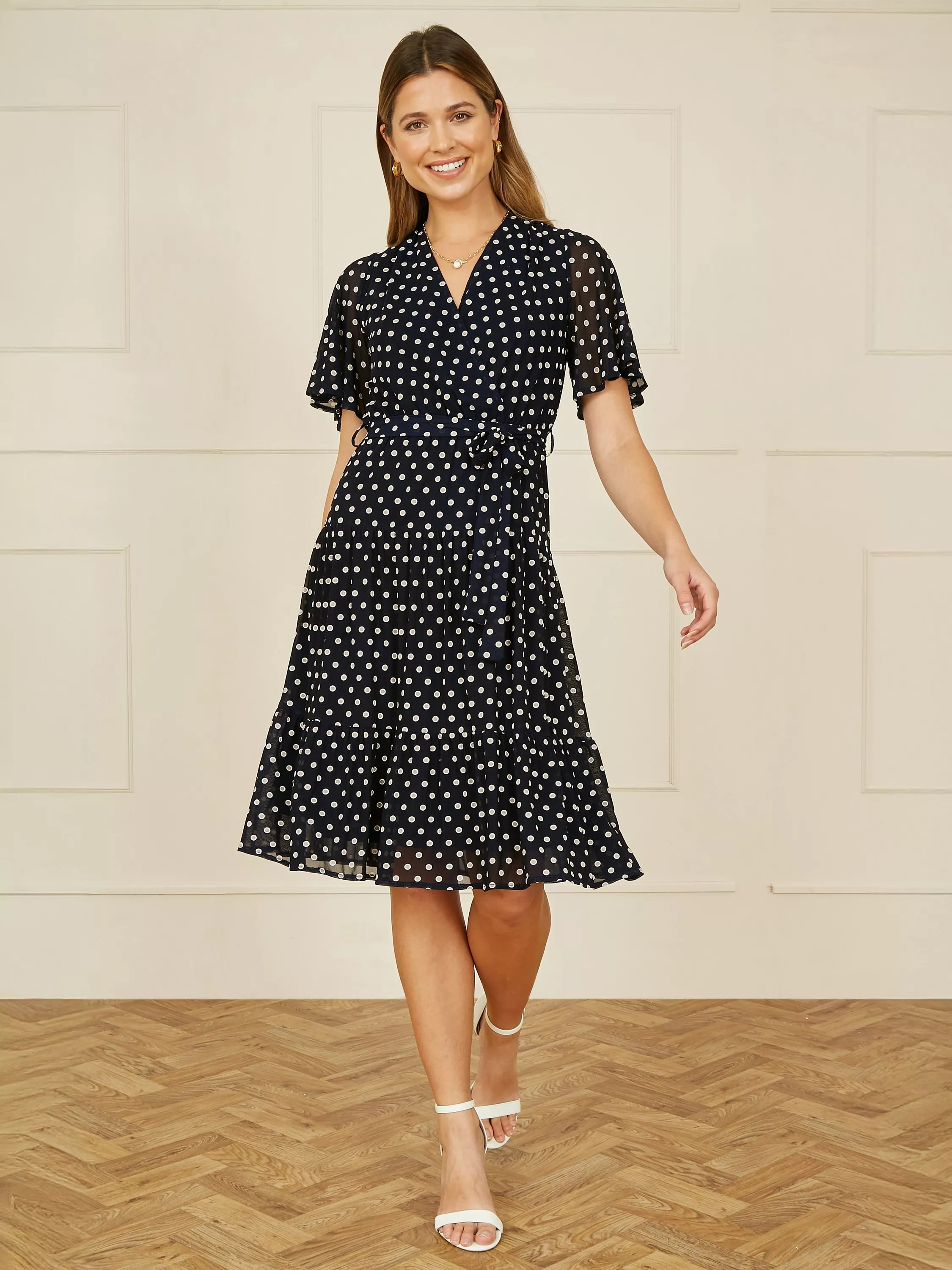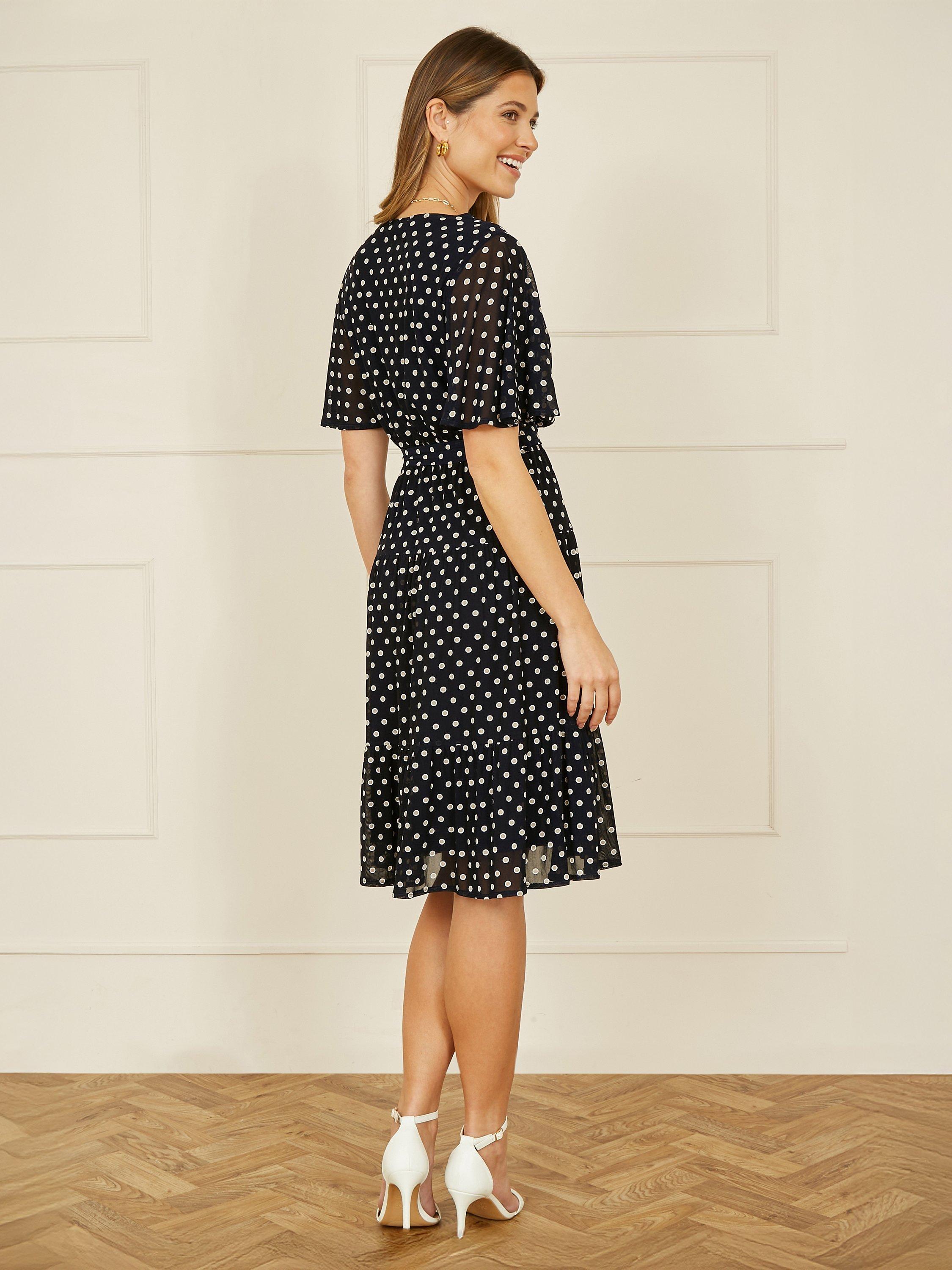 Prim and proper never looked so good! This versatile skater dress in an all over dot print on fine mesh is flowy and feminine. The angel sleeves add to the ethereal silhouette, with a self tie waist belt and midi length. Style this piece with heels for occasions, or boots and tights for a more casual vibe.