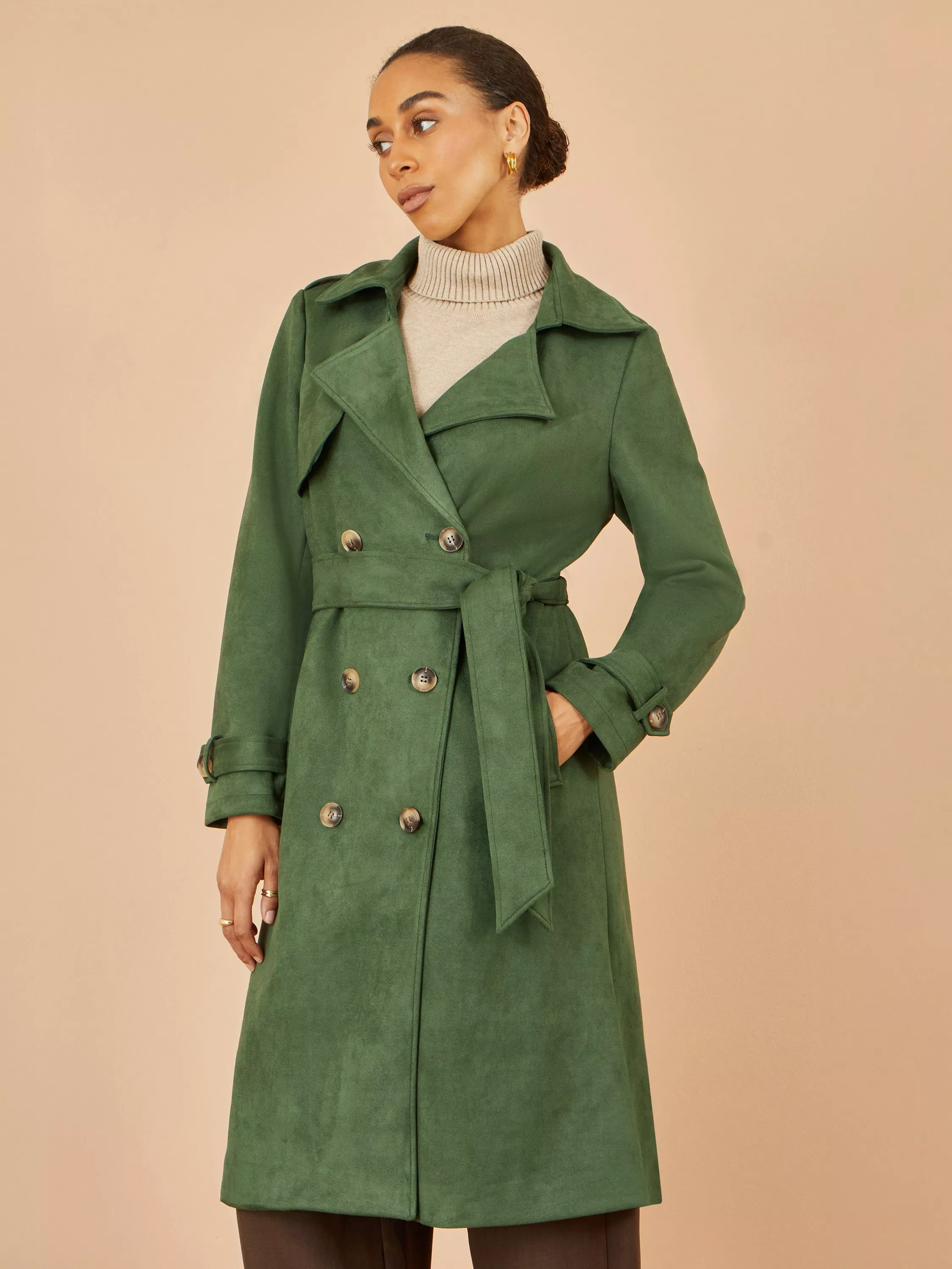 Super stylish design elements give this coat its smart look for any outfit. The double-breasted buttons add a chic feel. The faux suede adds a great texture to your wardrobe to add a luxurious feel. With belts at the cuffs, and all the gorgeous details you would expect from a classic trench.