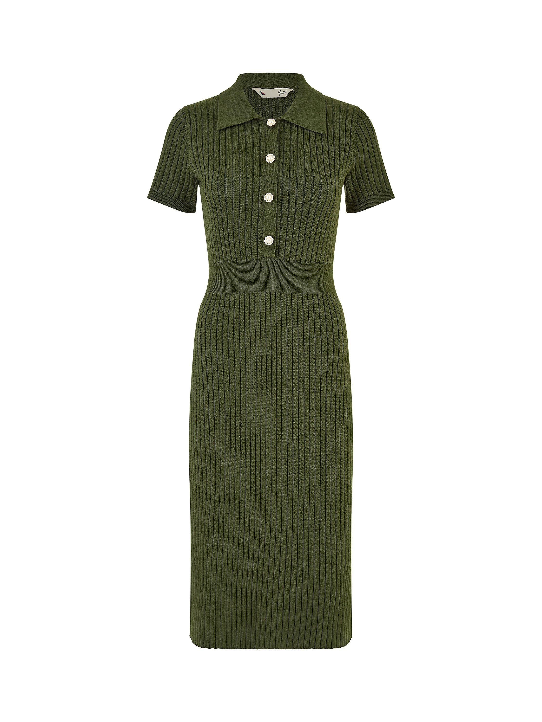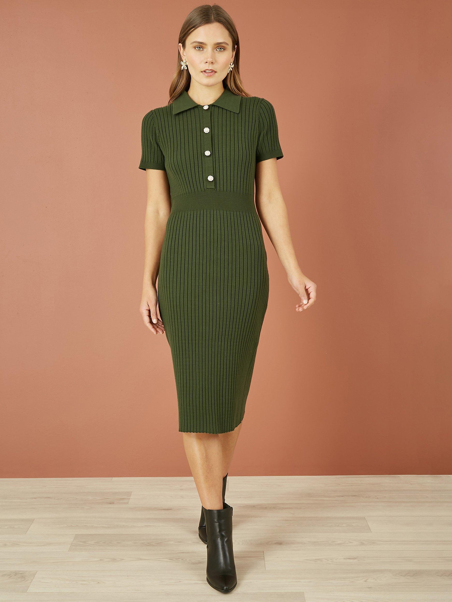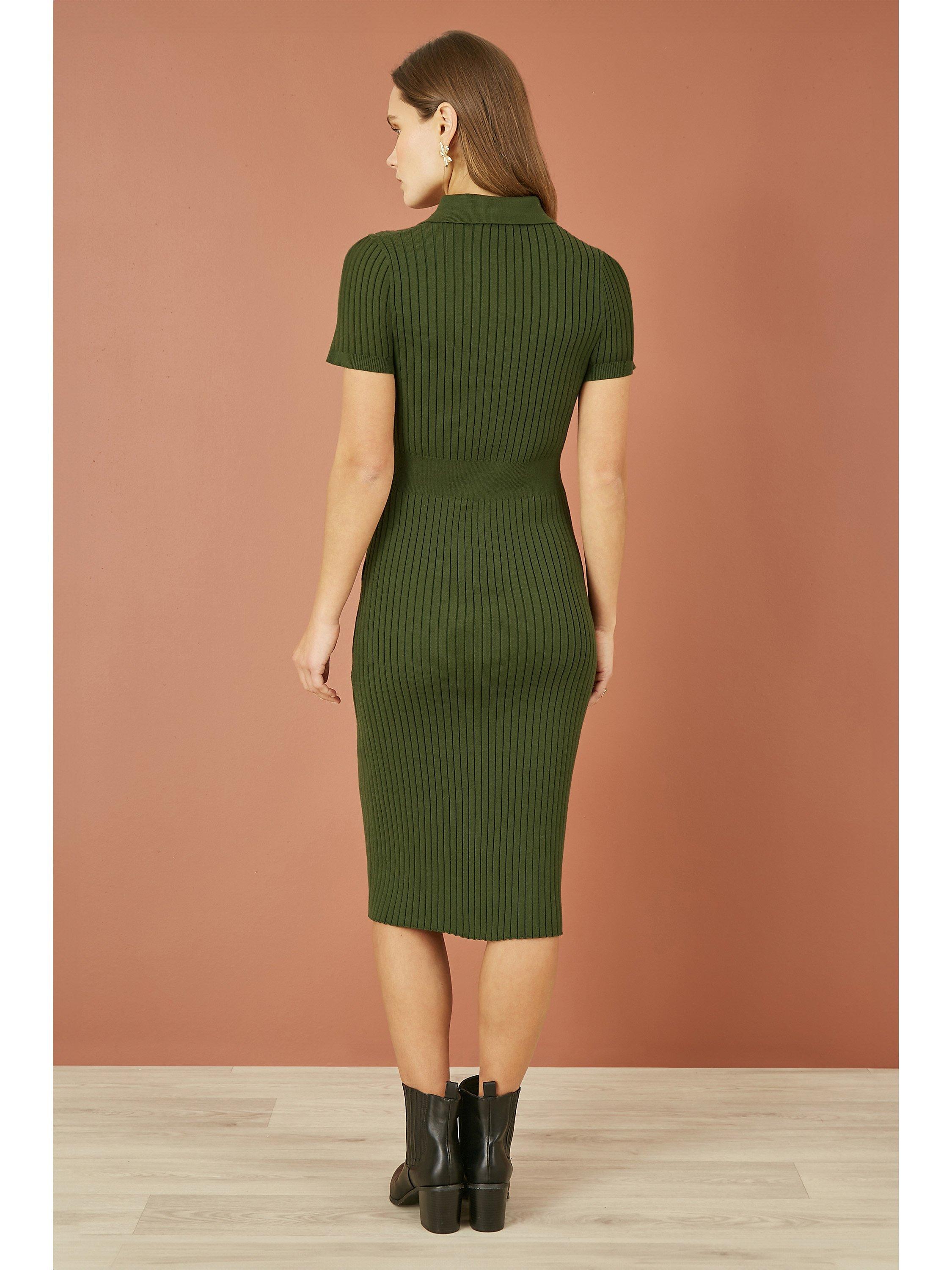 This gorgeous fitted rib knitted dress hugs the body in a flattering way. With a collared, button down neckline and short sleeves it's perfect for the changing seasons. Update your work or weekend wardrobe with this midi length dress for style points. The waistline is designed to cinch you in and gives a great silhouette.