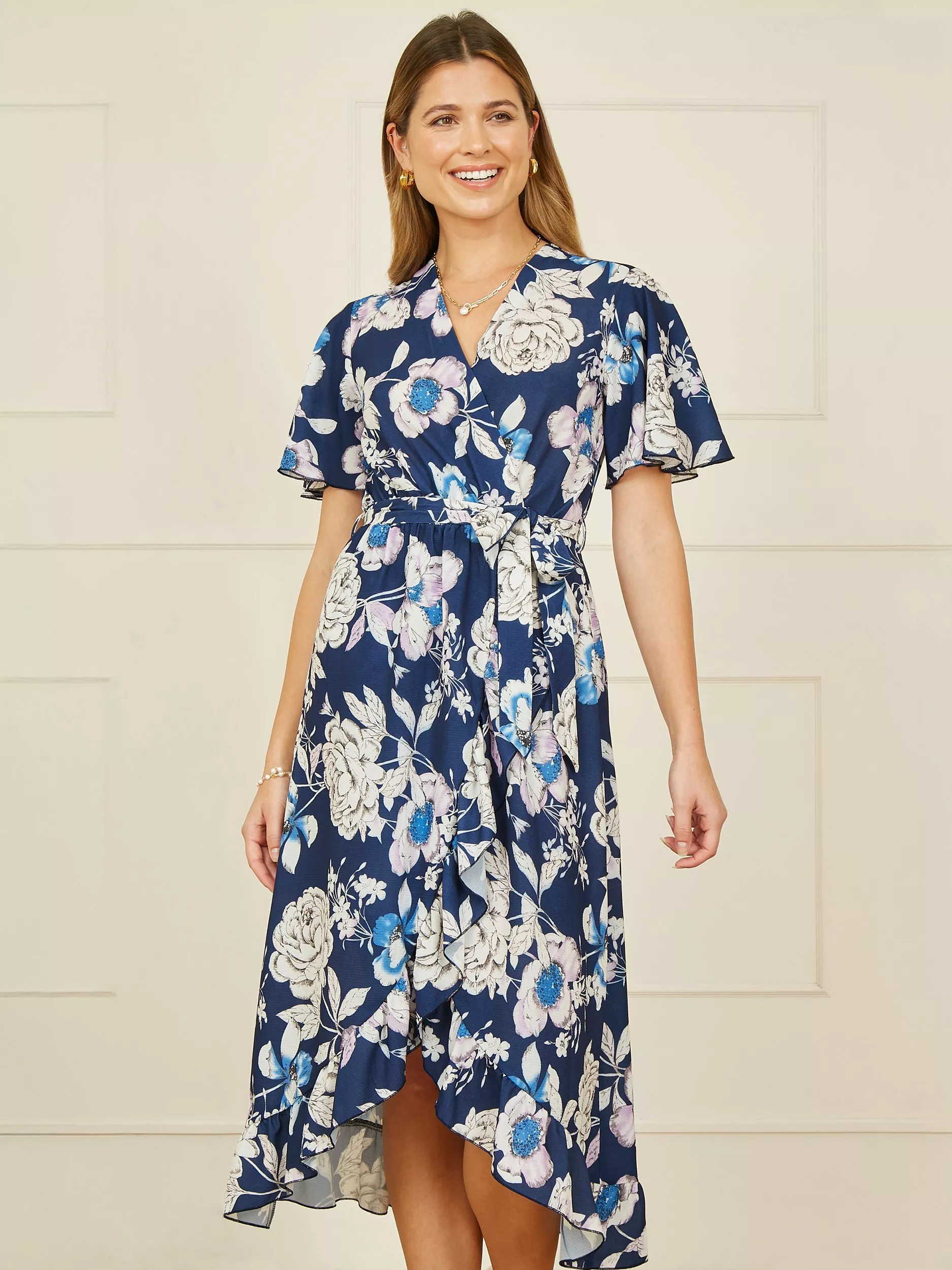 With wedding season fast approaching, we know you're looking for the perfect fit to look and feel amazing at the invites. This wrap style dress boasts a V neckline, tie at the waist and midi length dipped hemline. The all over floral design is pretty and feminine.