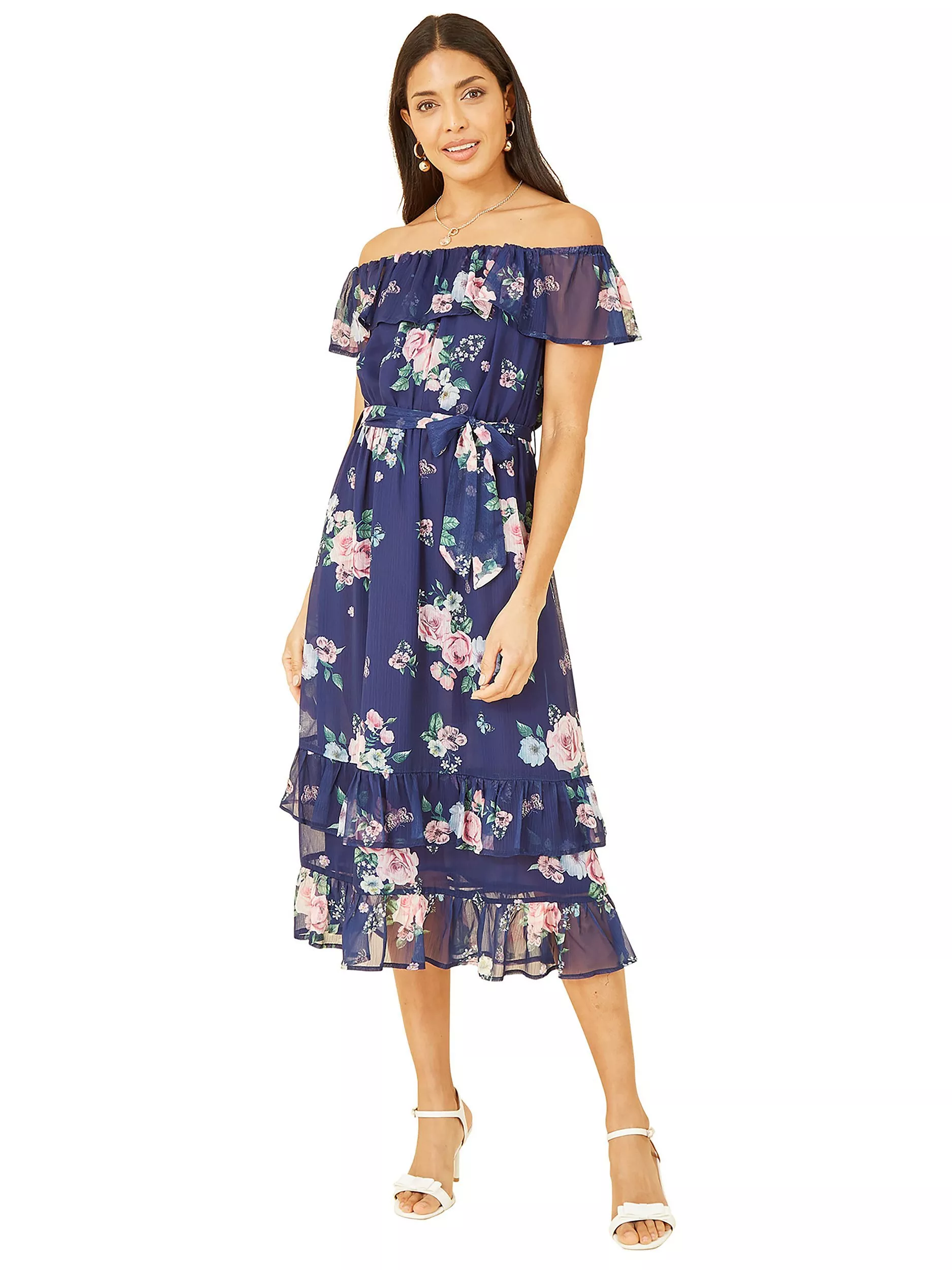 Easy to wear in a tiered A-line silhouette, this midi dress from Yumi is made from a resilient fabric. Showcasing the shoulders with its bardot neckline and cap sleeves, this style blooms with joy through a refreshing floral print.
