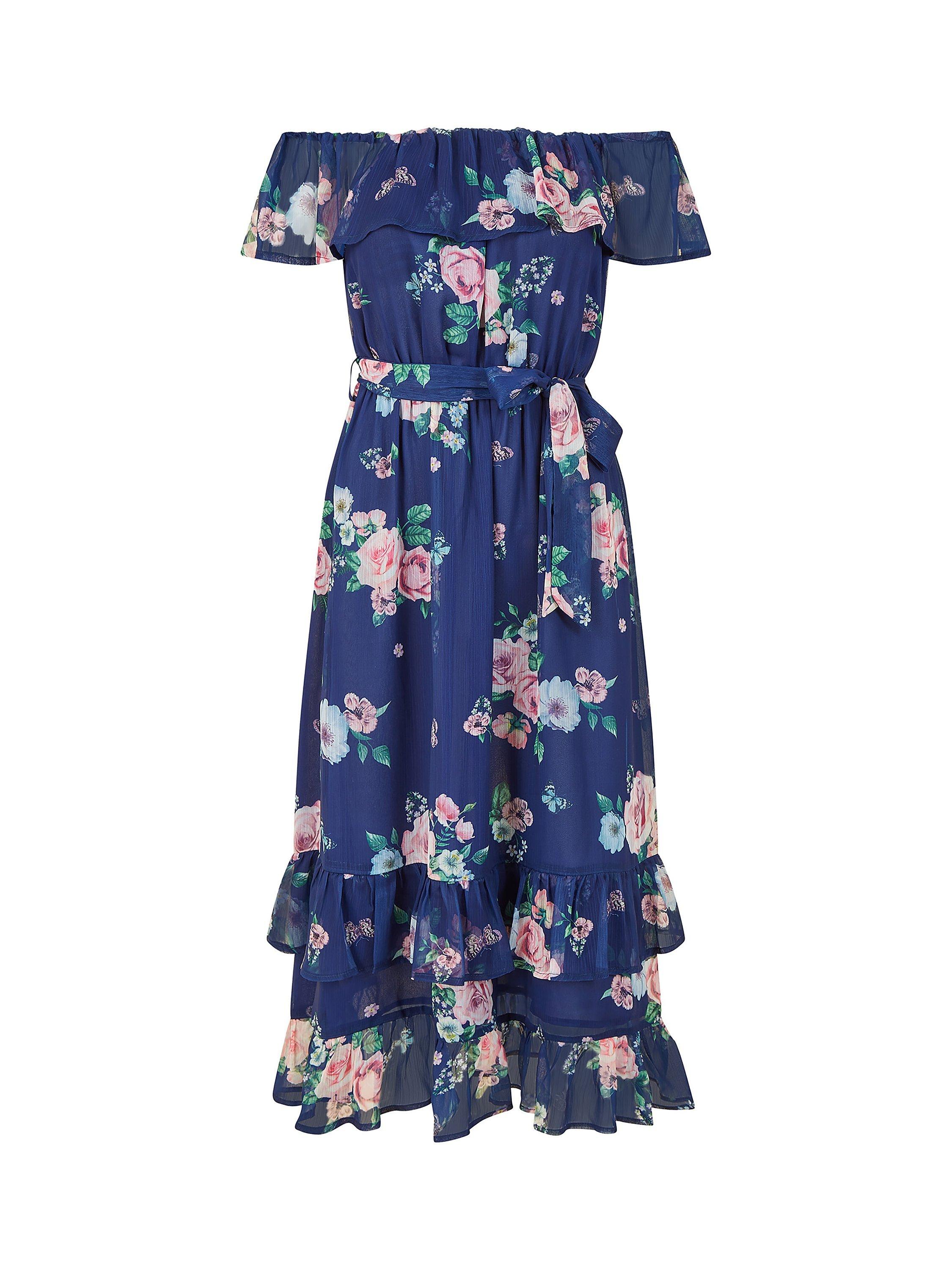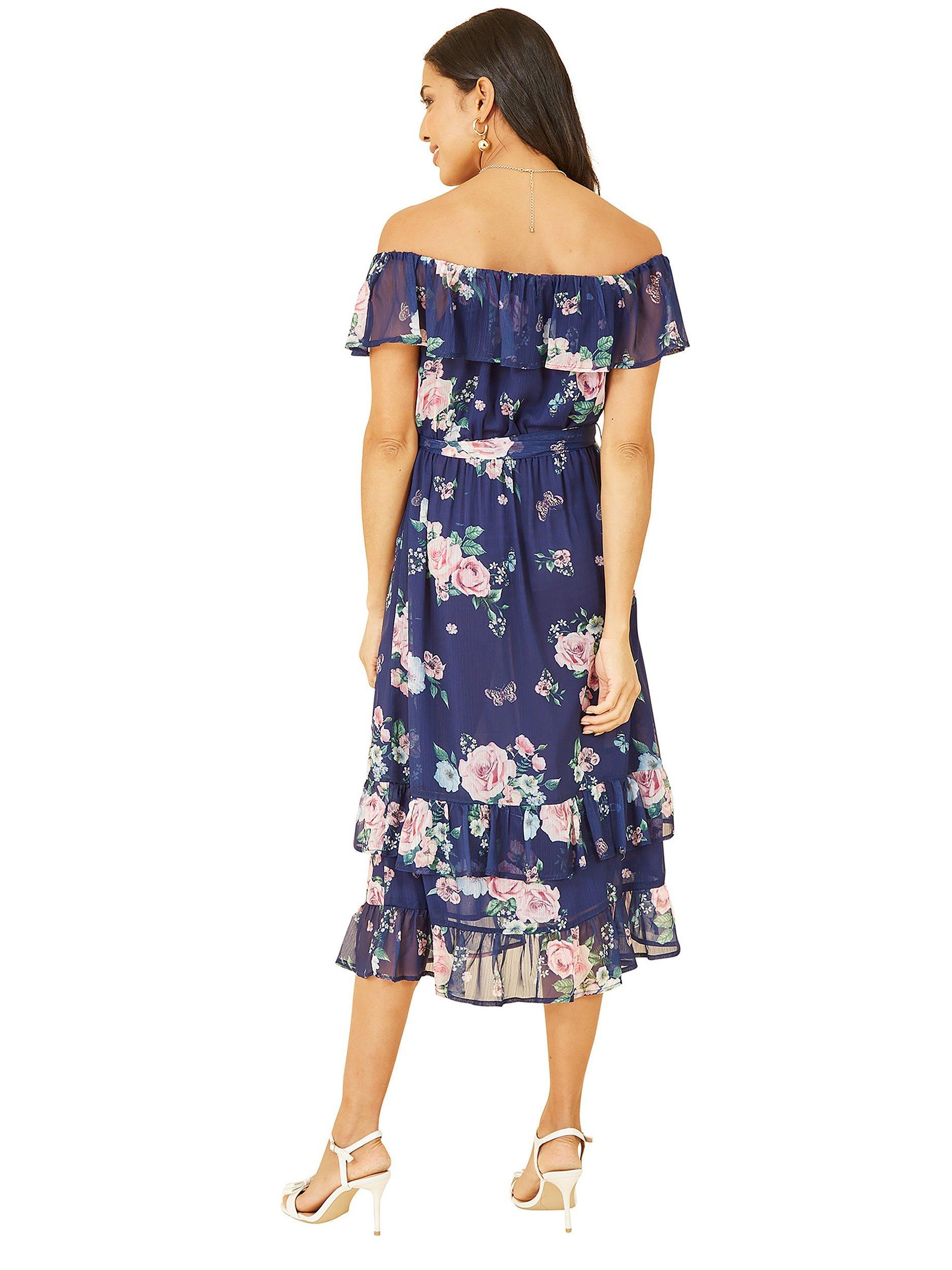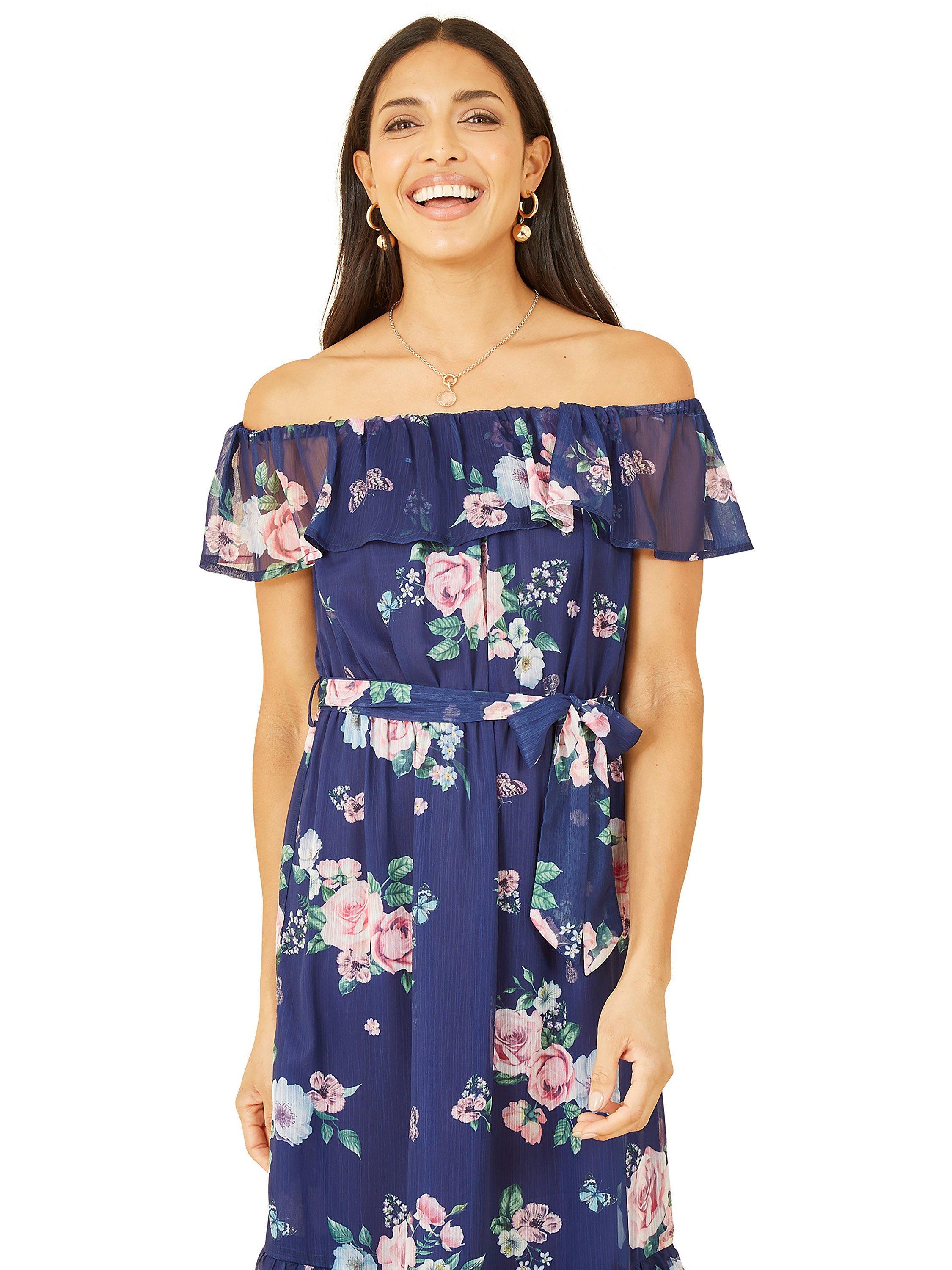 YumiFloral Print Bardot Neck Dress, Navy