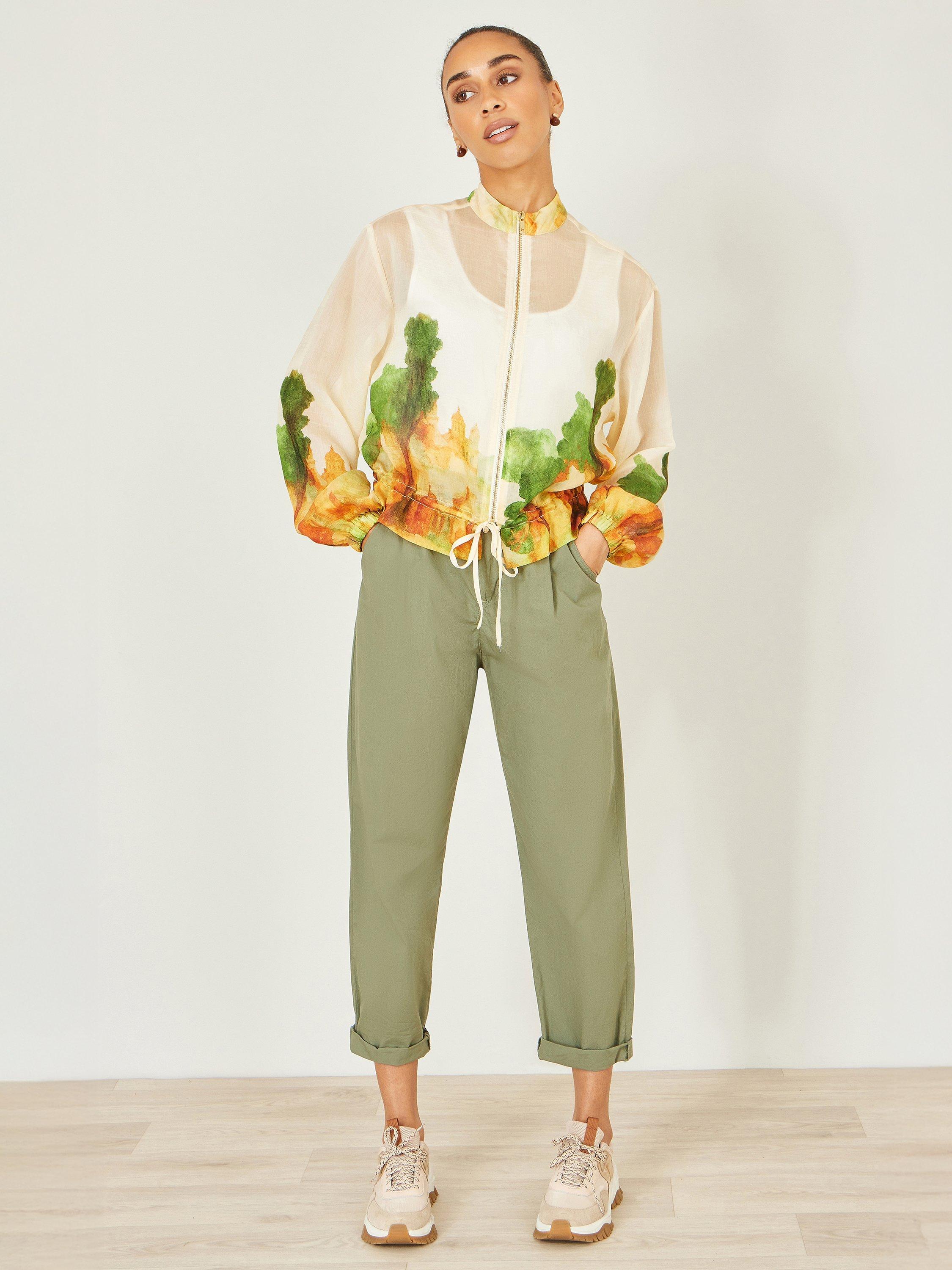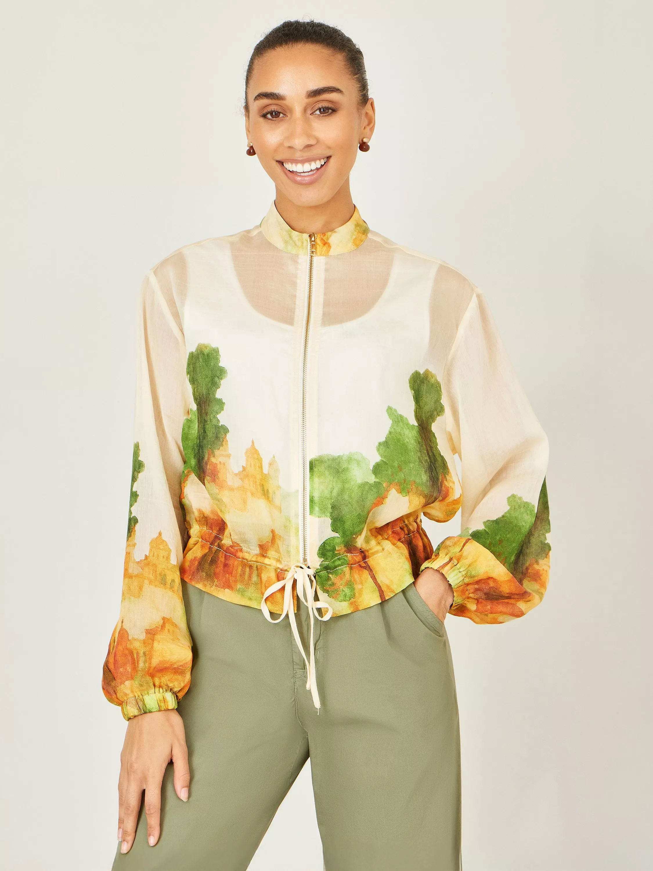 Lightweight and full of artistic charm, this jacket is a standout layering piece for warmer days. Made from soft, fluid modal, it drapes beautifully while offering a breathable, comfortable feel. The sheer finish is elevated with a painterly print, giving the jacket a fresh, contemporary look. Designed with a zip-through front, gently elasticated cuffs, and a drawstring hem, it balances relaxed ease with a refined silhouette—perfect for adding interest to everyday outfits.
