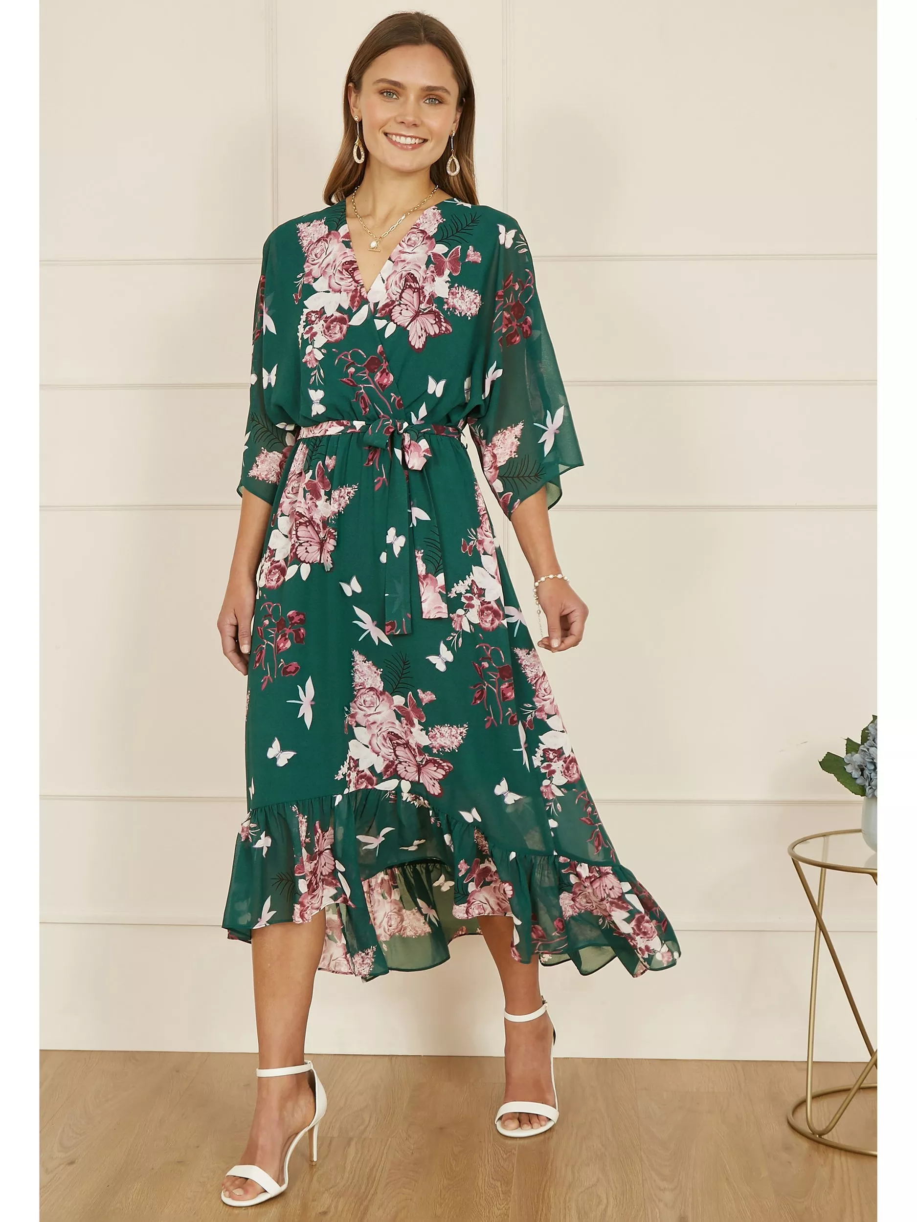 Flaunt your new fit at any special occasion this season, in this knock out from Yumi. With a dipped hemline that swishes and flows, three-quarter length kimono style sleeves and that darling floral print, we know you will feel a million dollars in this dress. The wrap over neckline and self tie belt creates and lovely silhouette. Wear to a wedding or ladies day at the races and wait for the compliments to roll in.
