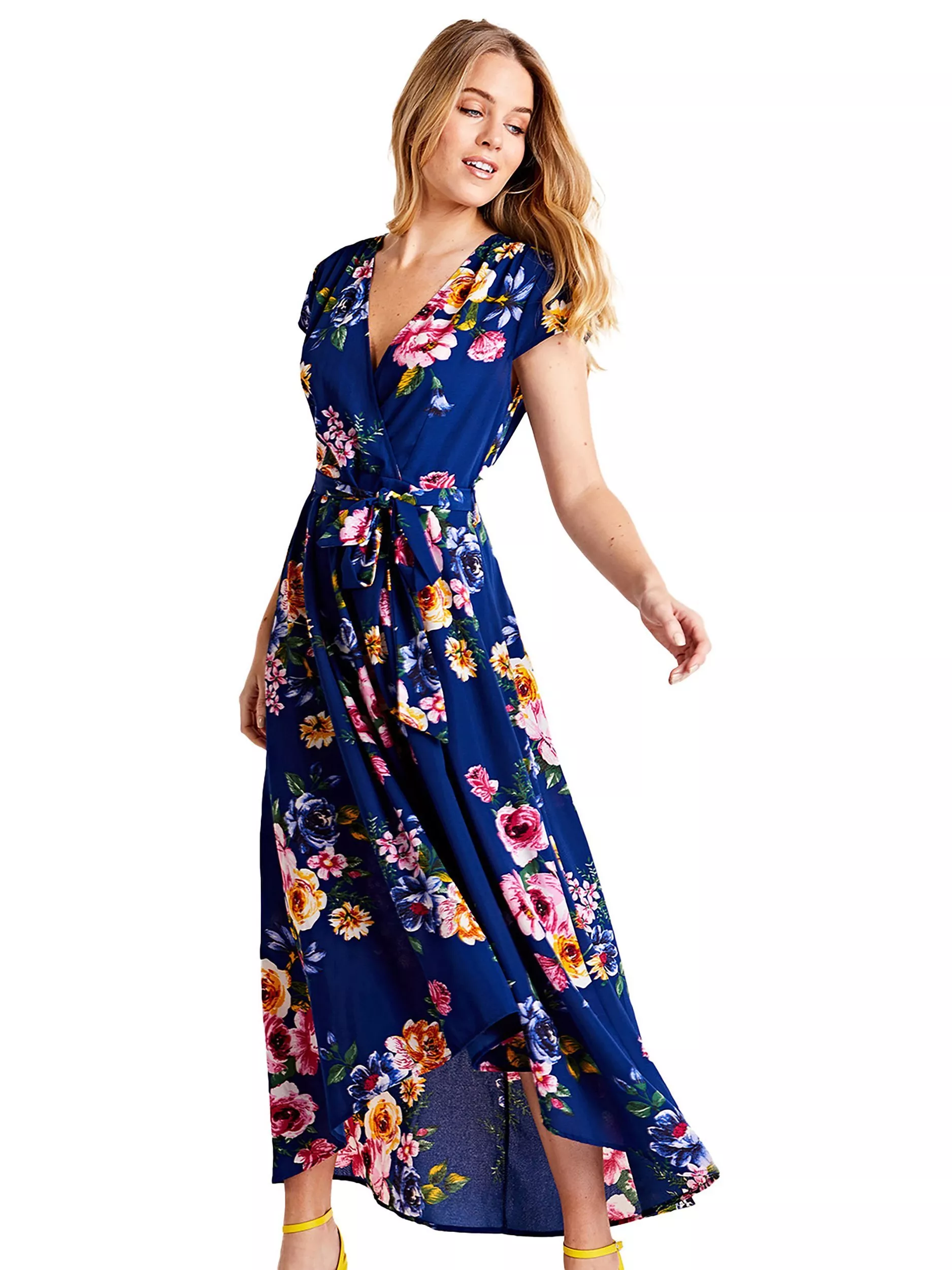 Ready to go from guest to VIP list? Designed with short sleeves and a flattering wrap bodice that tapers with a self-tie waist, the floral printed fabric falls into a flowing dip hem skirt. This Mela dress is a stunner for all those summer invites. Style with nude shoes and bag and let this dress do the talking.
