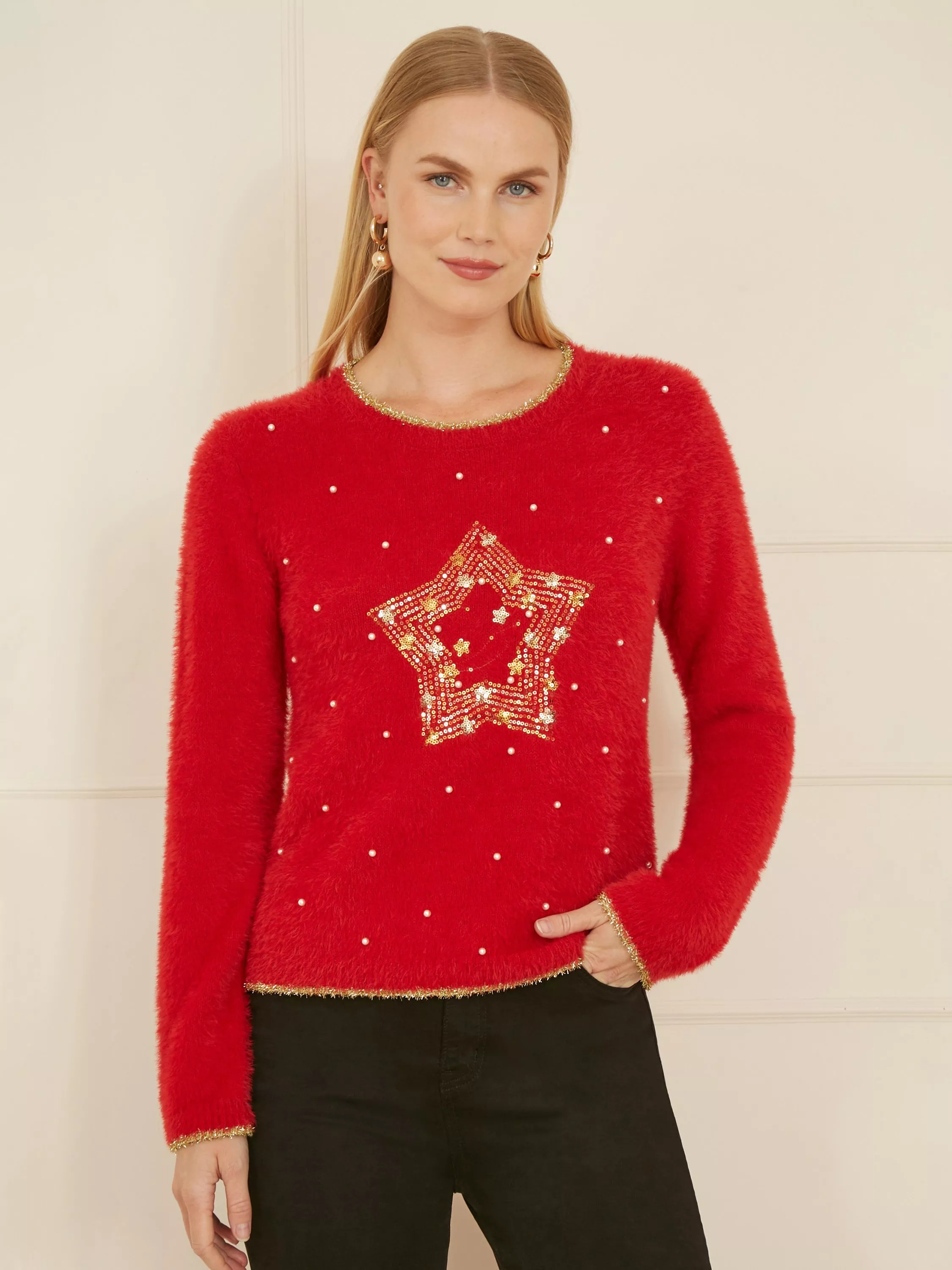 Be the star of the show this Festive season, in the Yumi Black Fluffy Star Christmas Jumper. Super soft and fluffy this gold embellished jumper is the perfect way to show off your festive cheer. Style with jeans and chunky boots.