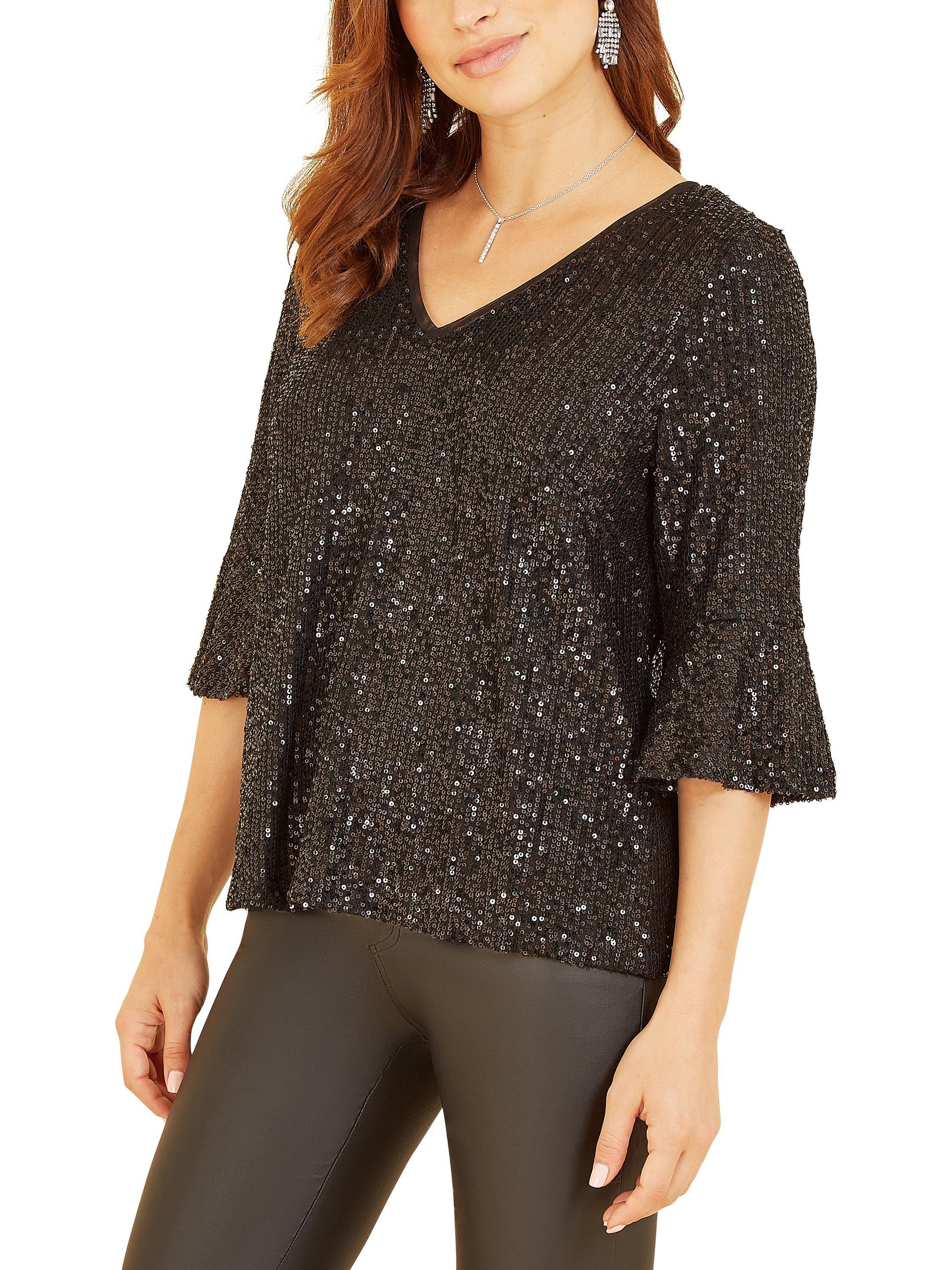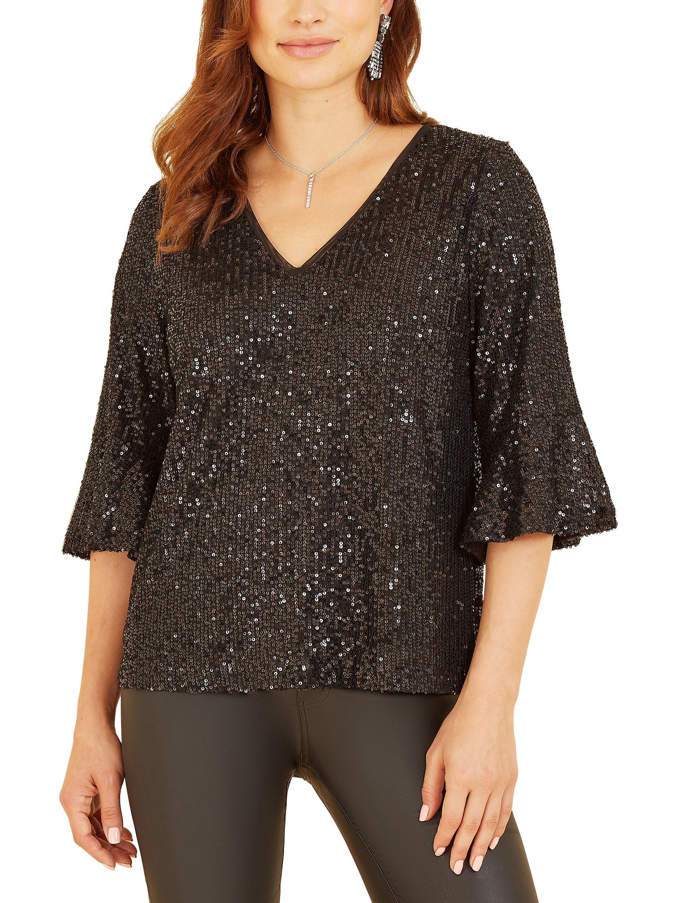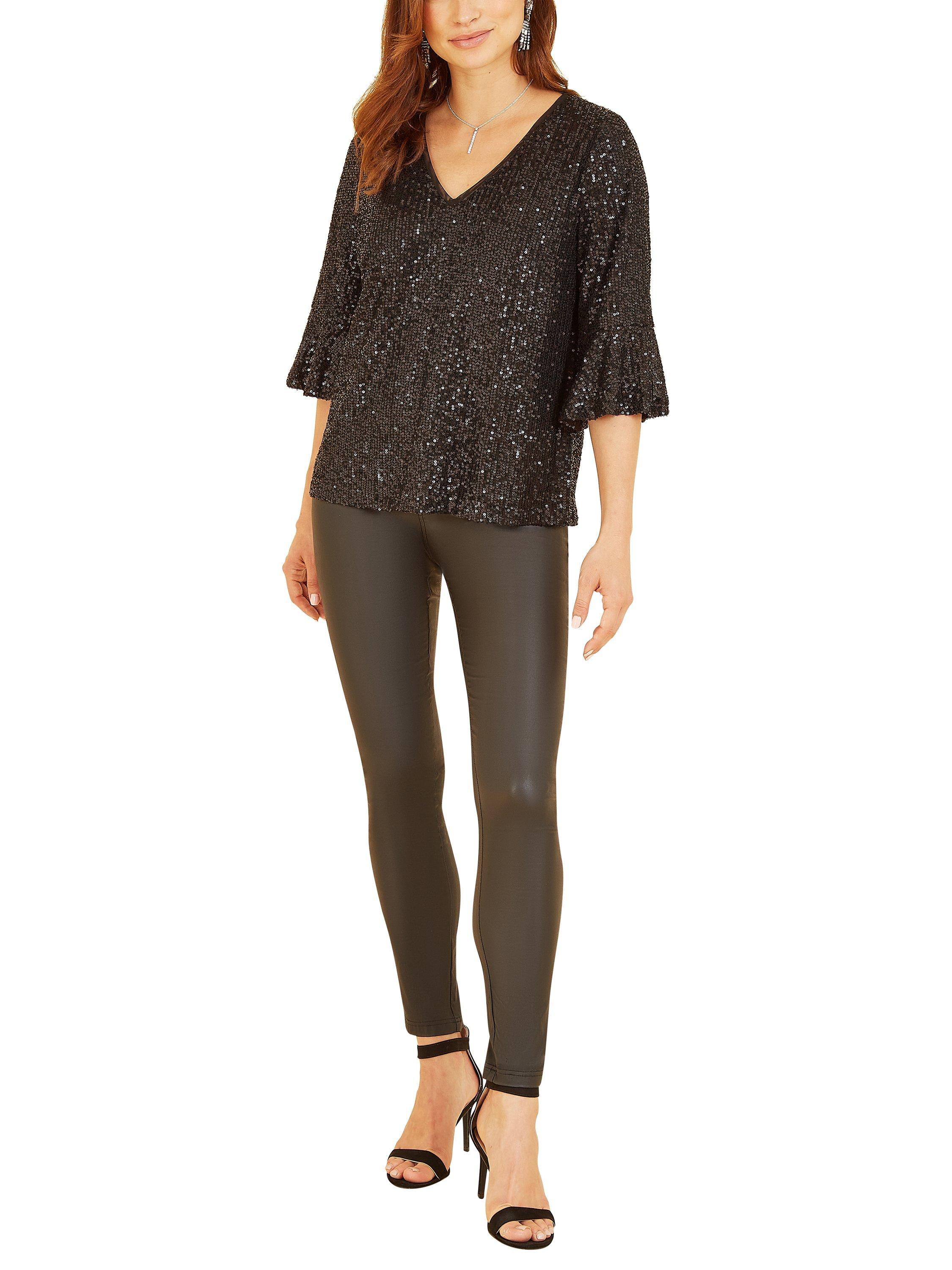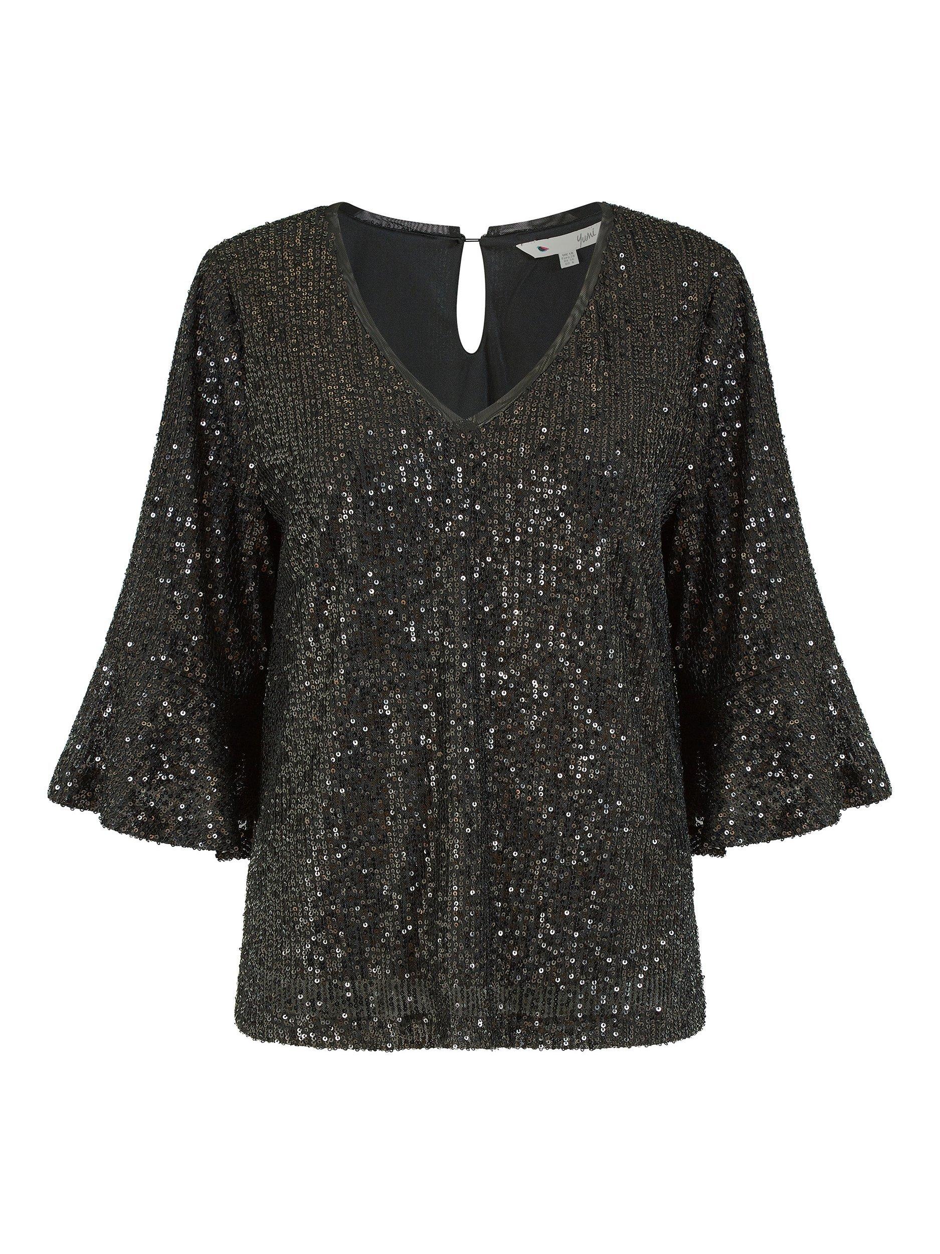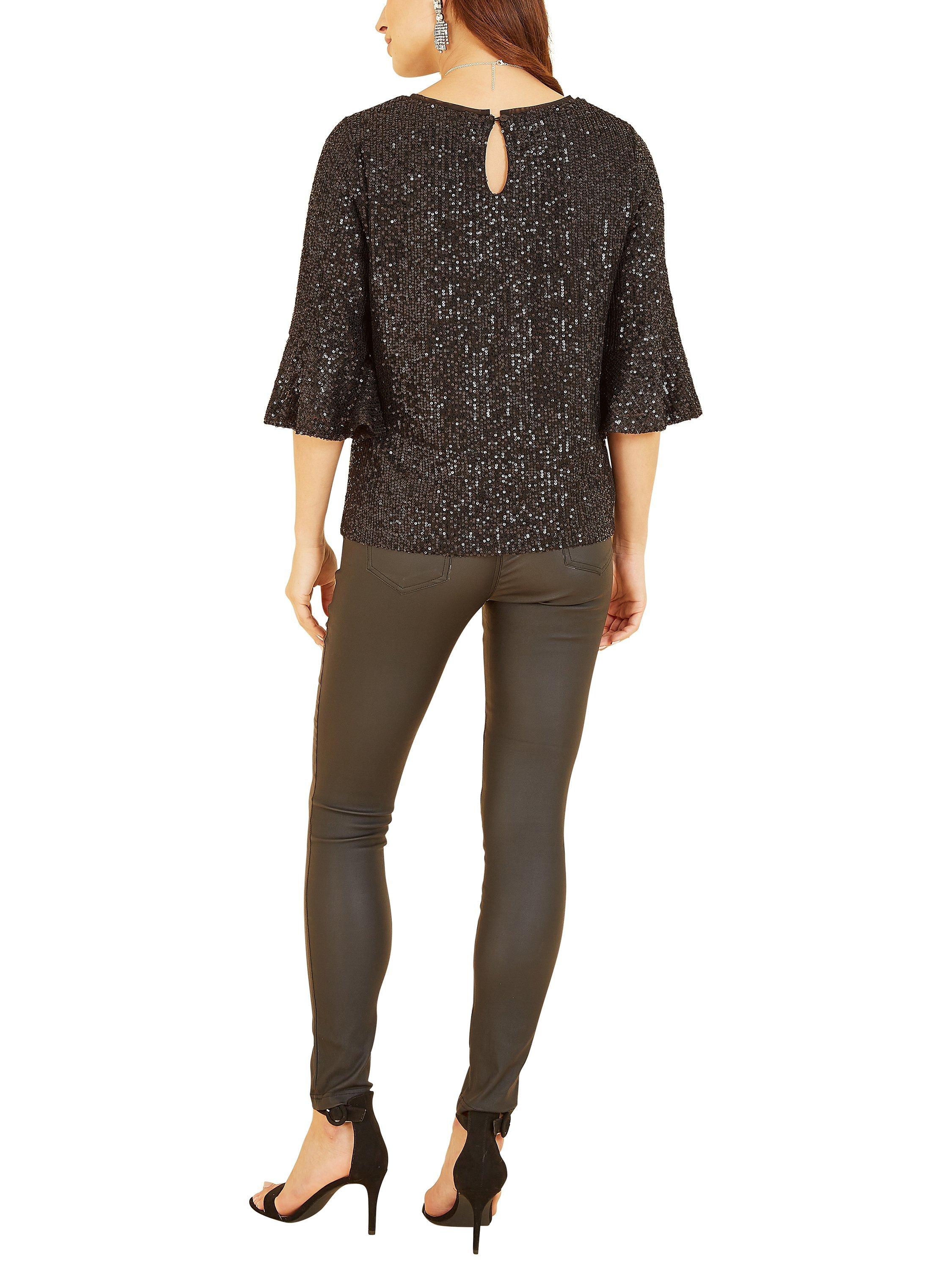 Out out has never felt so good! This stunning Yumi Sequin Relaxed Fit Top is super stylish and perfect for parties. With all-over sequin detailing, this relaxed fit top is fully lined, fusing comfort with style. Features super flattering fluted sleeves and a peep hole back fastening. Match with skinny jeans or leather trousers to complete the look.