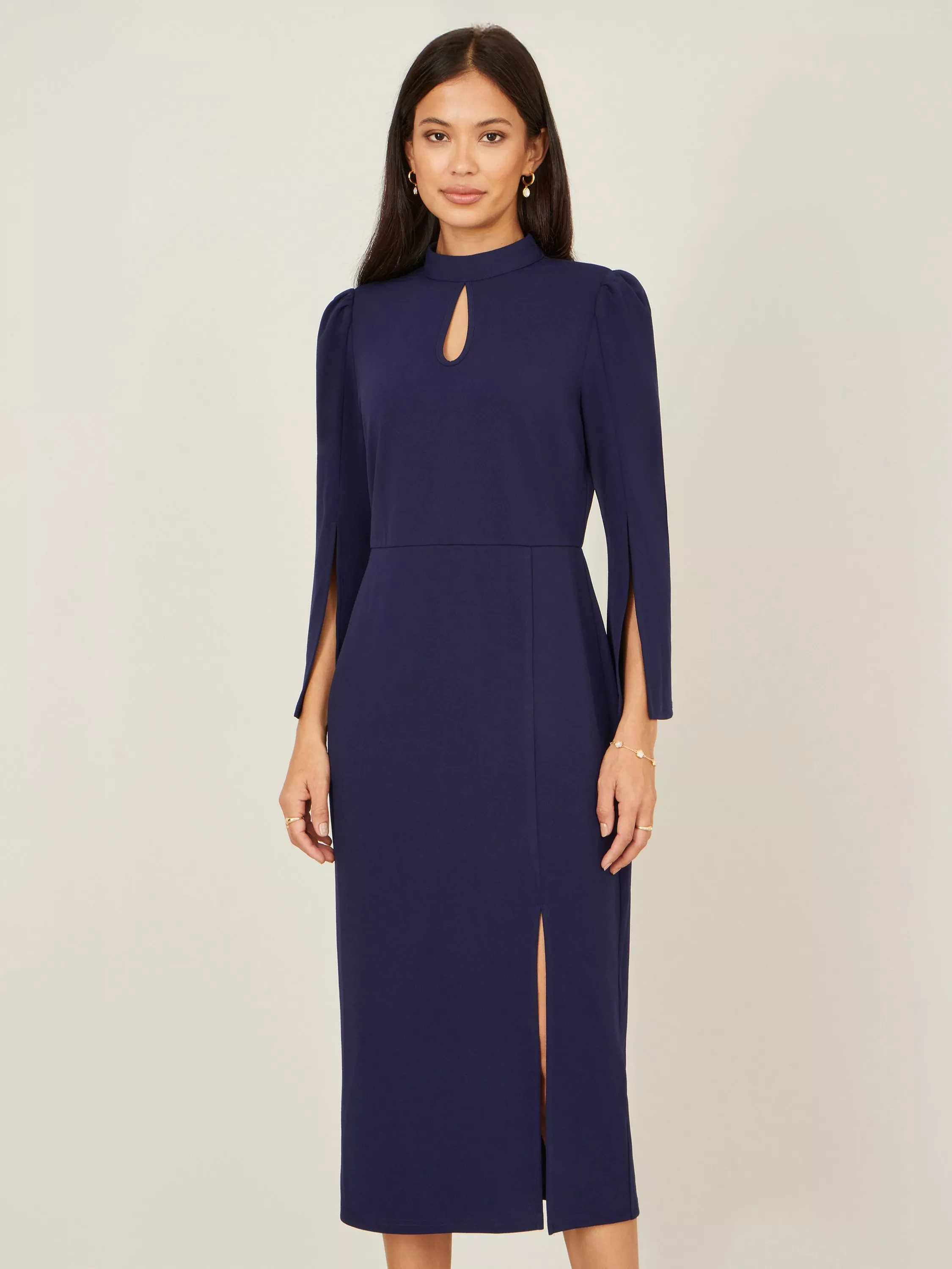 The midi length hemline has a split in it for a sultry look that is complemented by fluted sleeves. The notched neckline and high collar add to the design. Understated glamour is the absolute vibe of this dress.