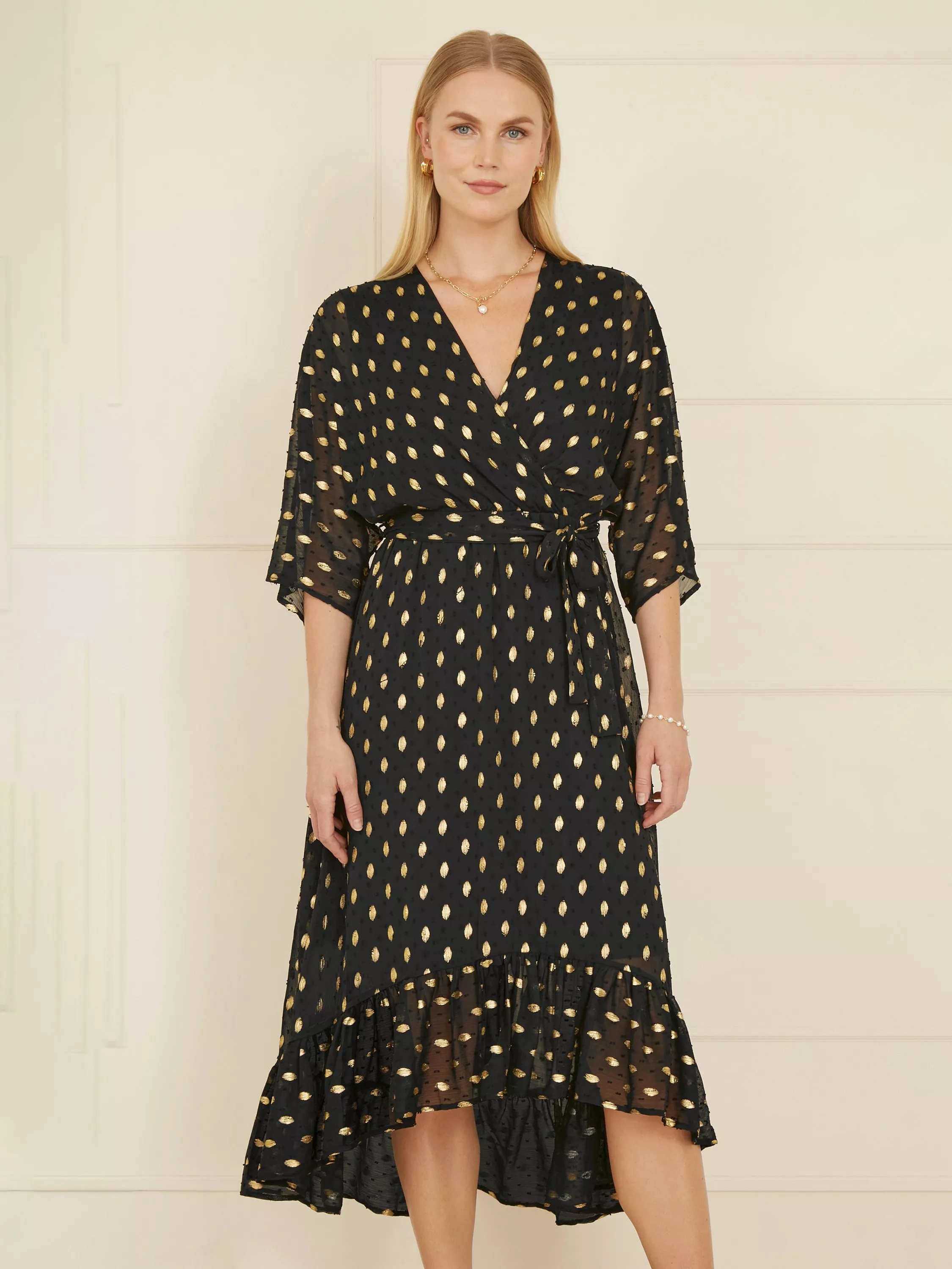This gorgeous wrap over midi dress is ready for any occasion this season. The all over foil print adds a touch of glamour that would look great at a winter wedding or Christmas party. With sheer kimono style sleeves, a floaty frilled dip hemline and tie belt at the waist.