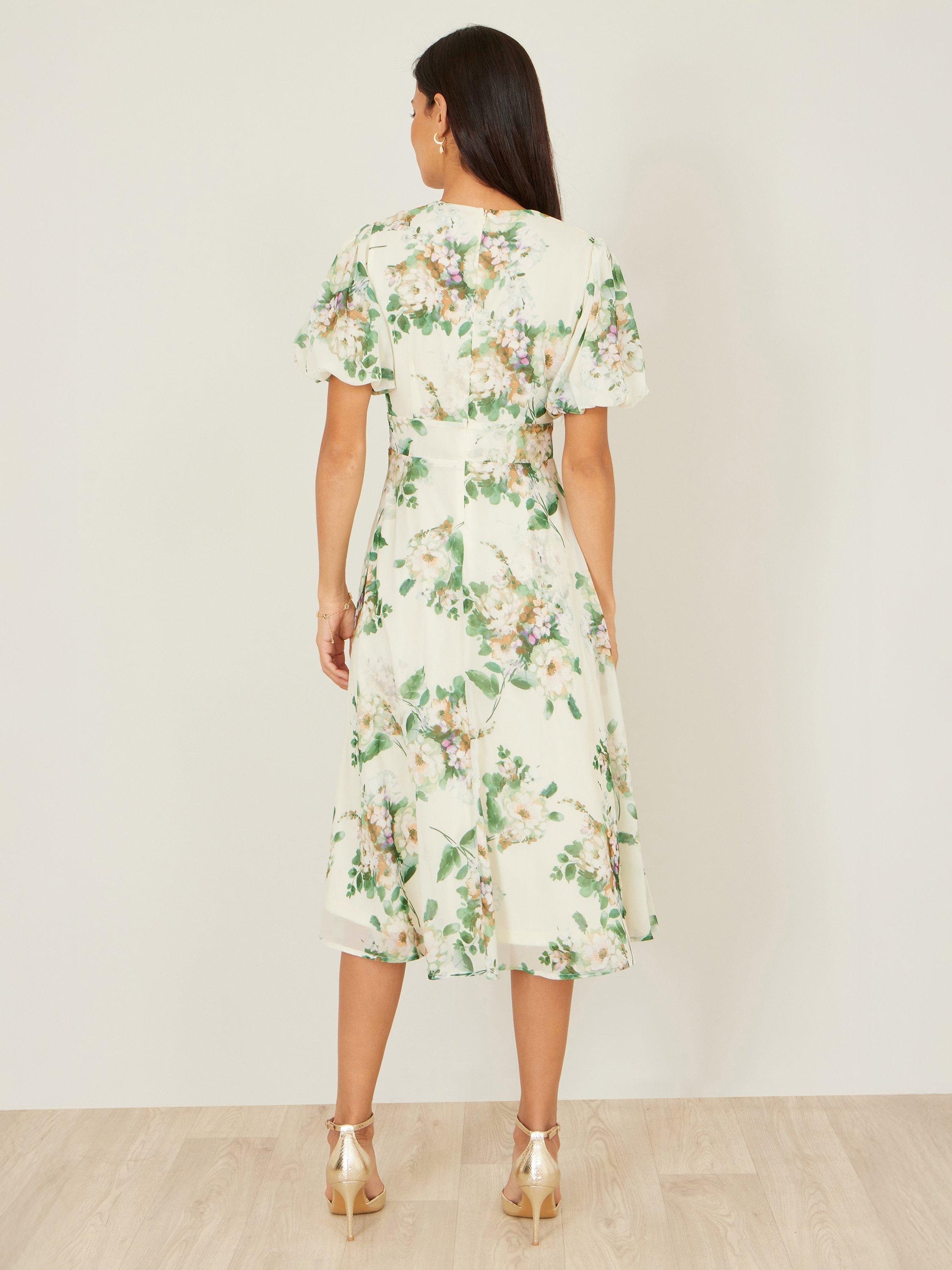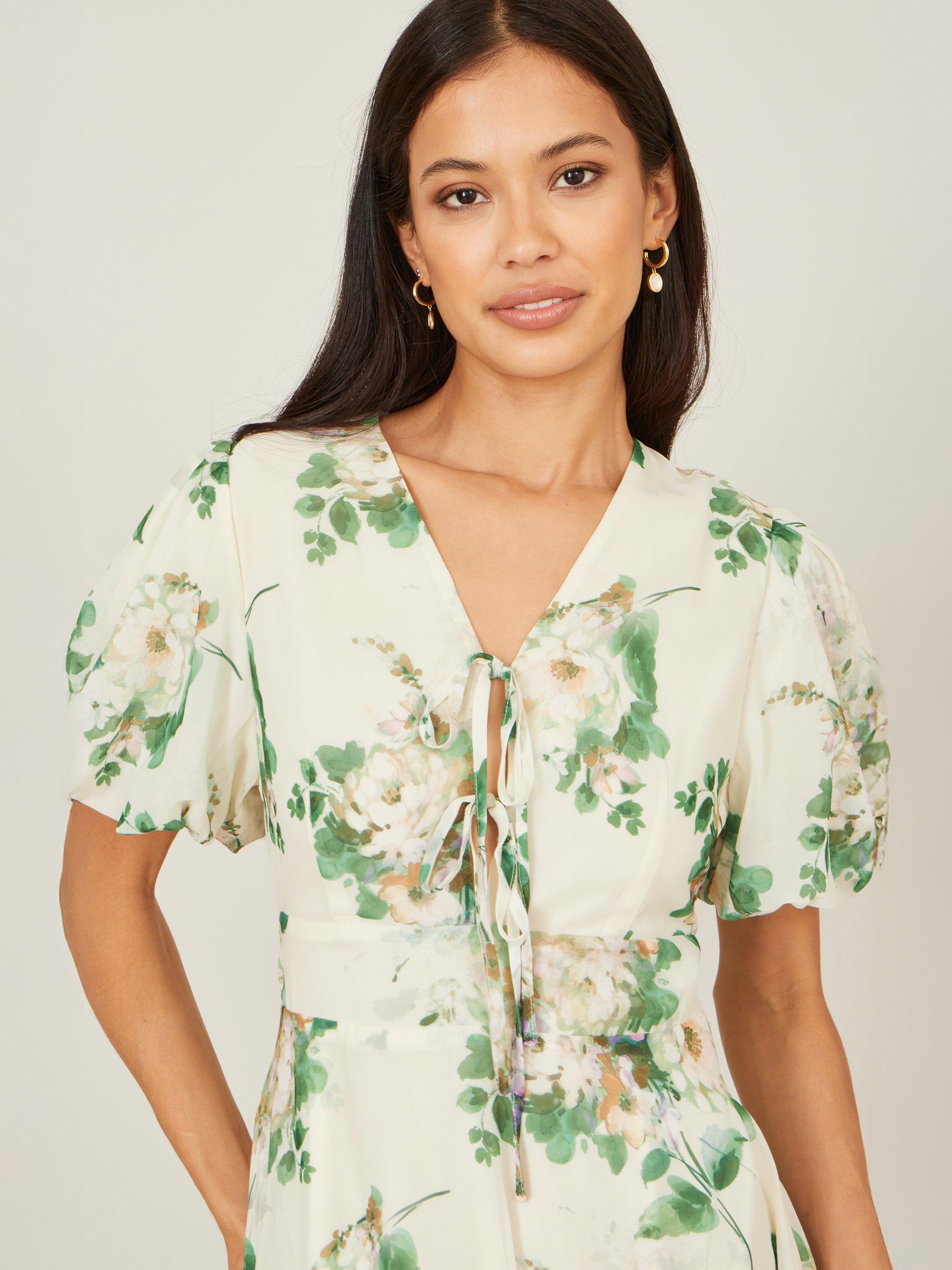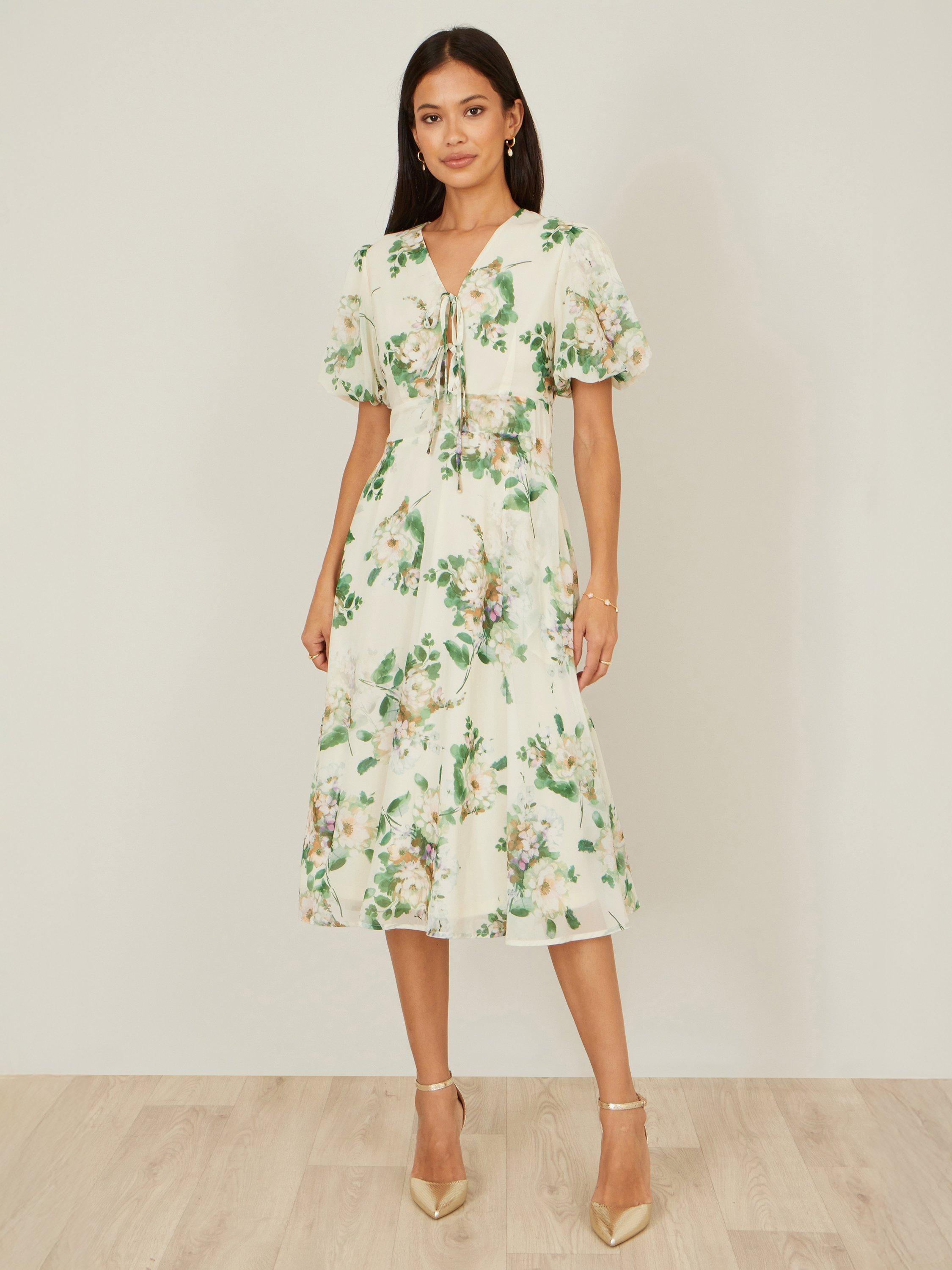 This dress flows beautifully into a gracefully flared midi skirt made from a lightweight fabric that drapes effortlessly. It is designed with flutter sleeves, a flattering V-neckline, and a delicate lace-up detail at the bust.