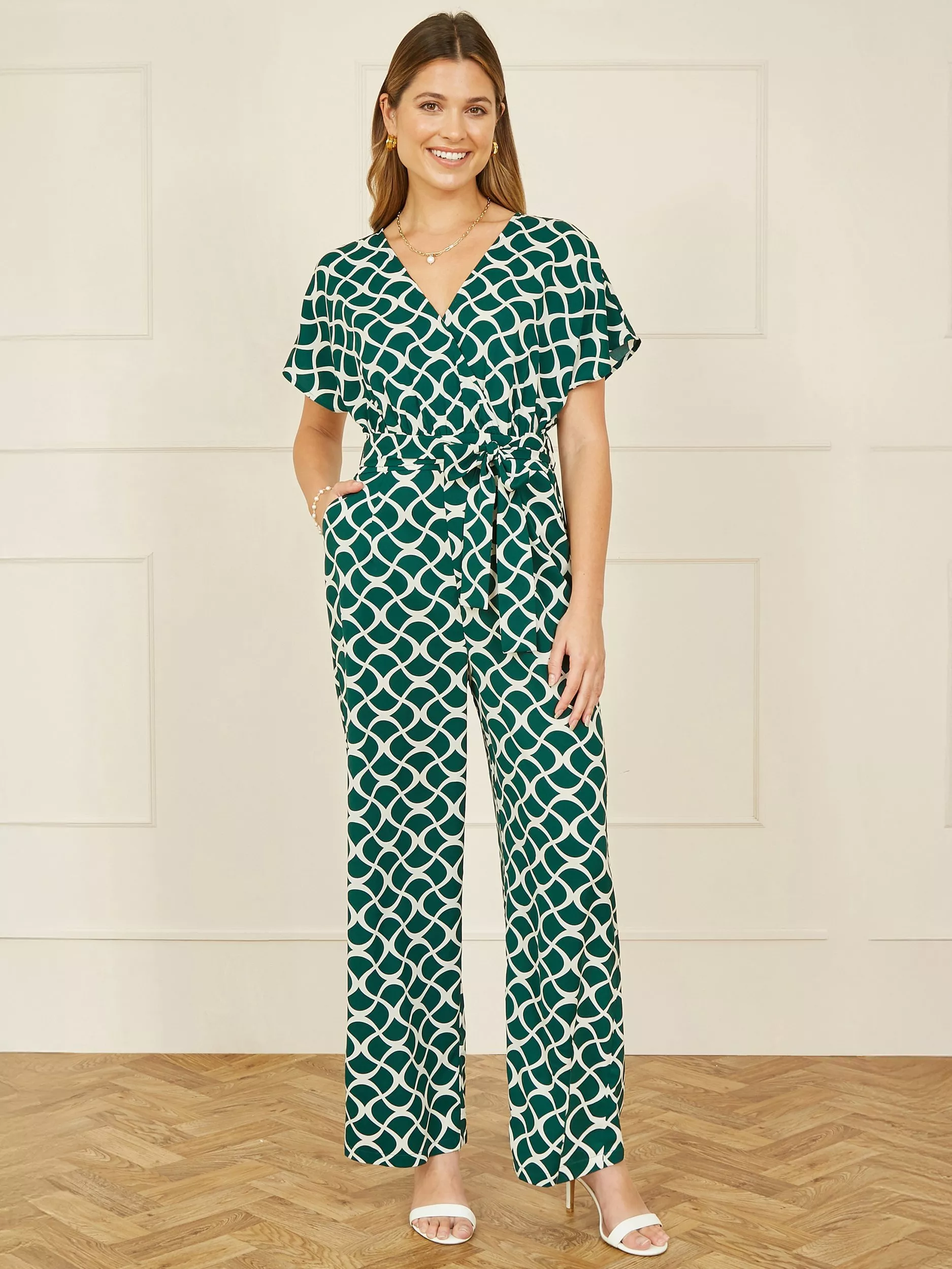 A great jumpsuit can be the key to summer dressing - Occasions and casual events are covered in this geometric print all in one. Made from a silky lightweight fabric, with angel sleeves, self tie waistline and wide leg flowing legs this one is so flattering and easy to wear. With pockets as a cute extra feature, we love this style with strappy sandals and statement earrings.