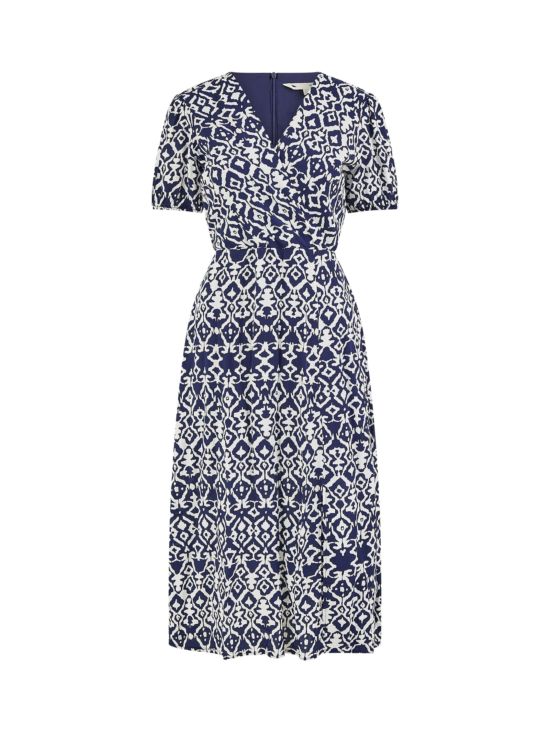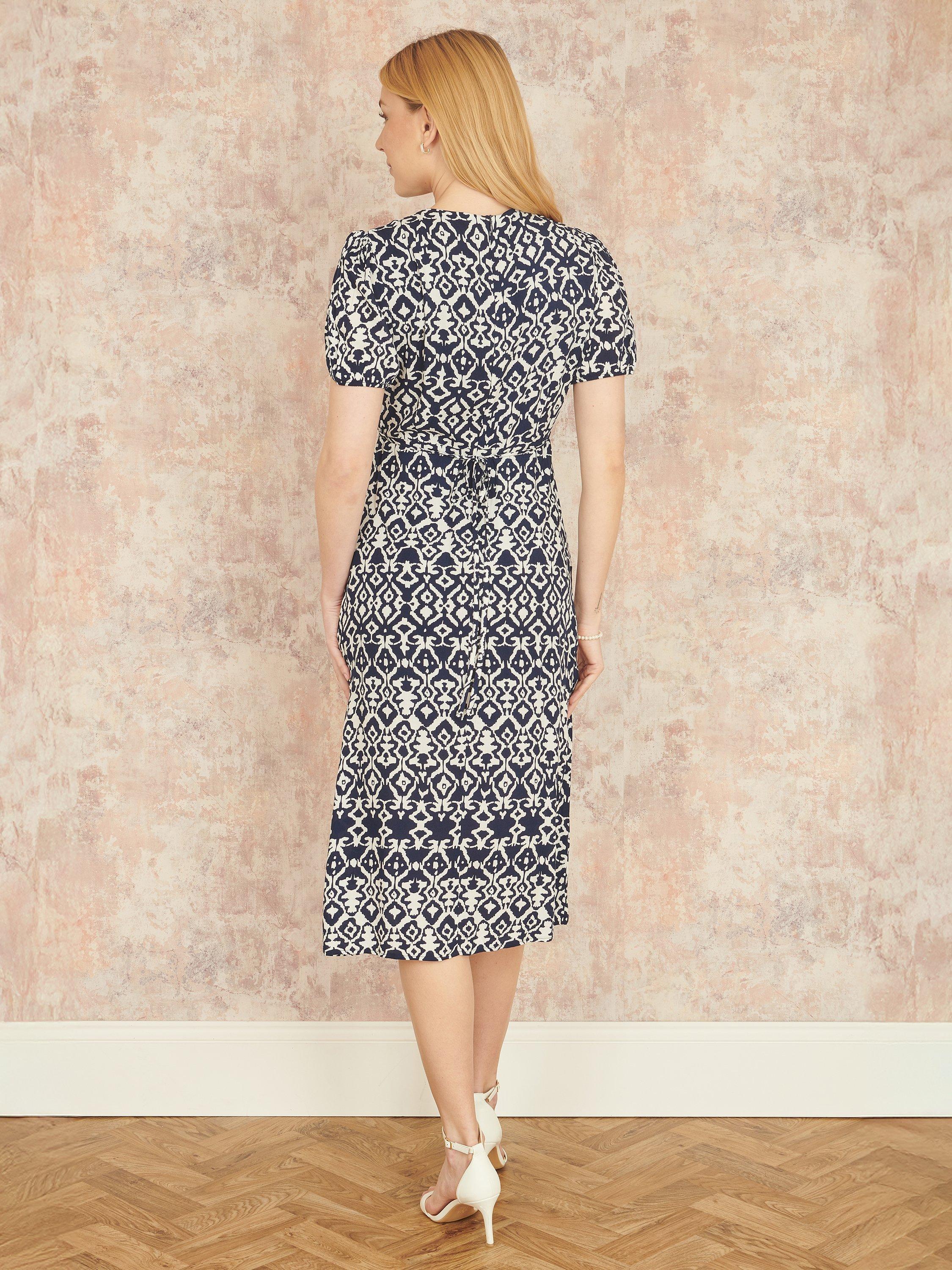 Take this gorgeous ikat print dress for a spin on your holiday this year. With a figure-hugging shape that boasts a V-neck, short sleeves and split hemline. The look is chic and easy to wear with sandals and a denim jacket - Let that bold print do the talking.