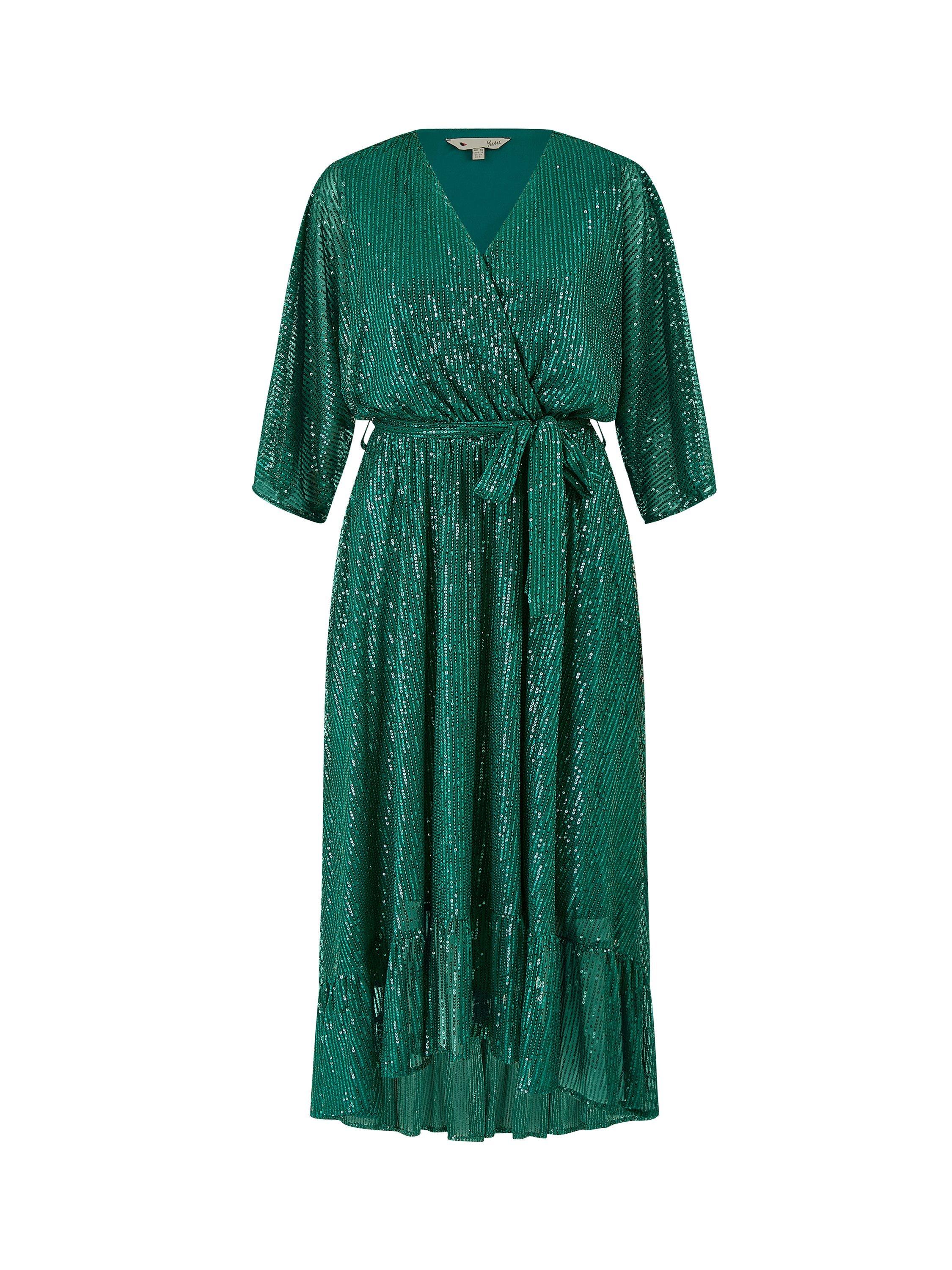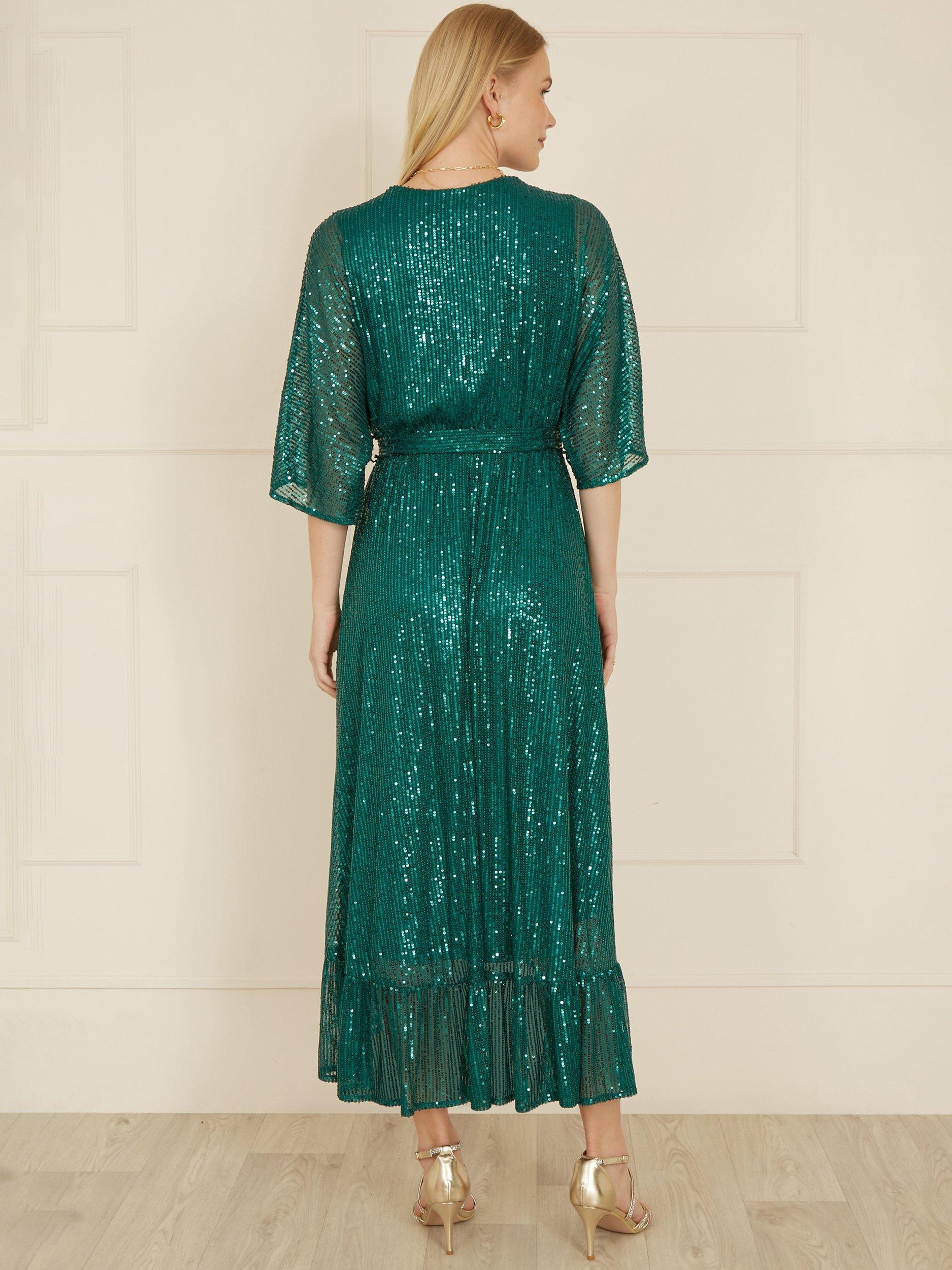 This kimono shape dress is the ultimate party piece! With flowy dip hem style, with all over shimmering sequins that catch the light beautifully. The tie at the waist and V neckline are incredibly elegant and will look amazing at any event or invite this festive season.