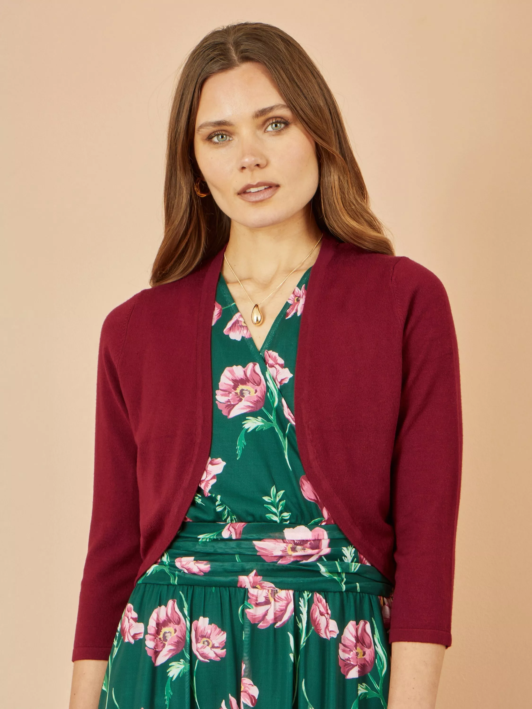 Layer up with this Knitted Bolero. Made in a close knit soft feel fabric. This little number is perfect to layer over any dress for those fancy events to keep you looking sophisticated. In a simple edge to edge curve design, this piece will sit at the waist, with a 3/4 sleeve to keep the chill off.