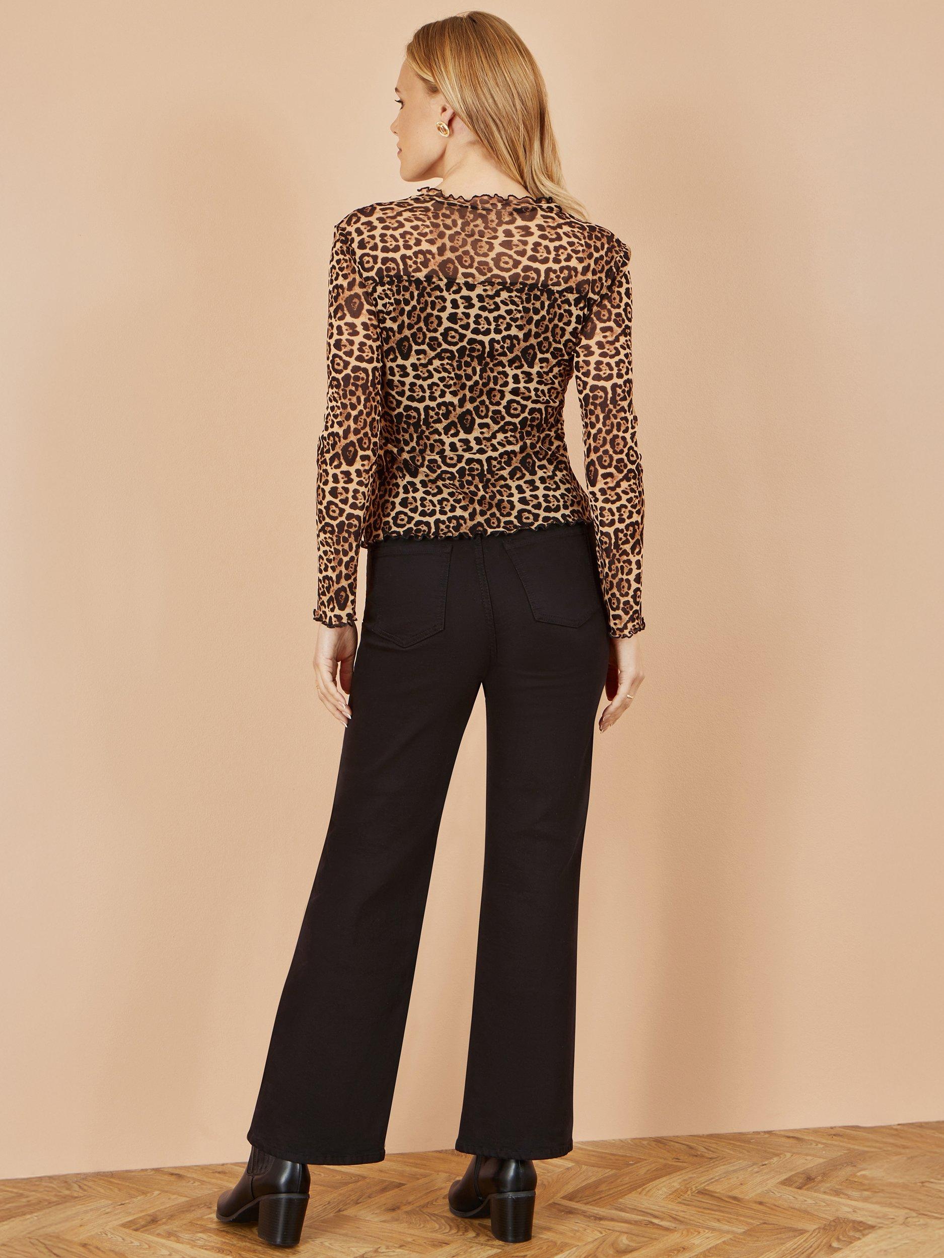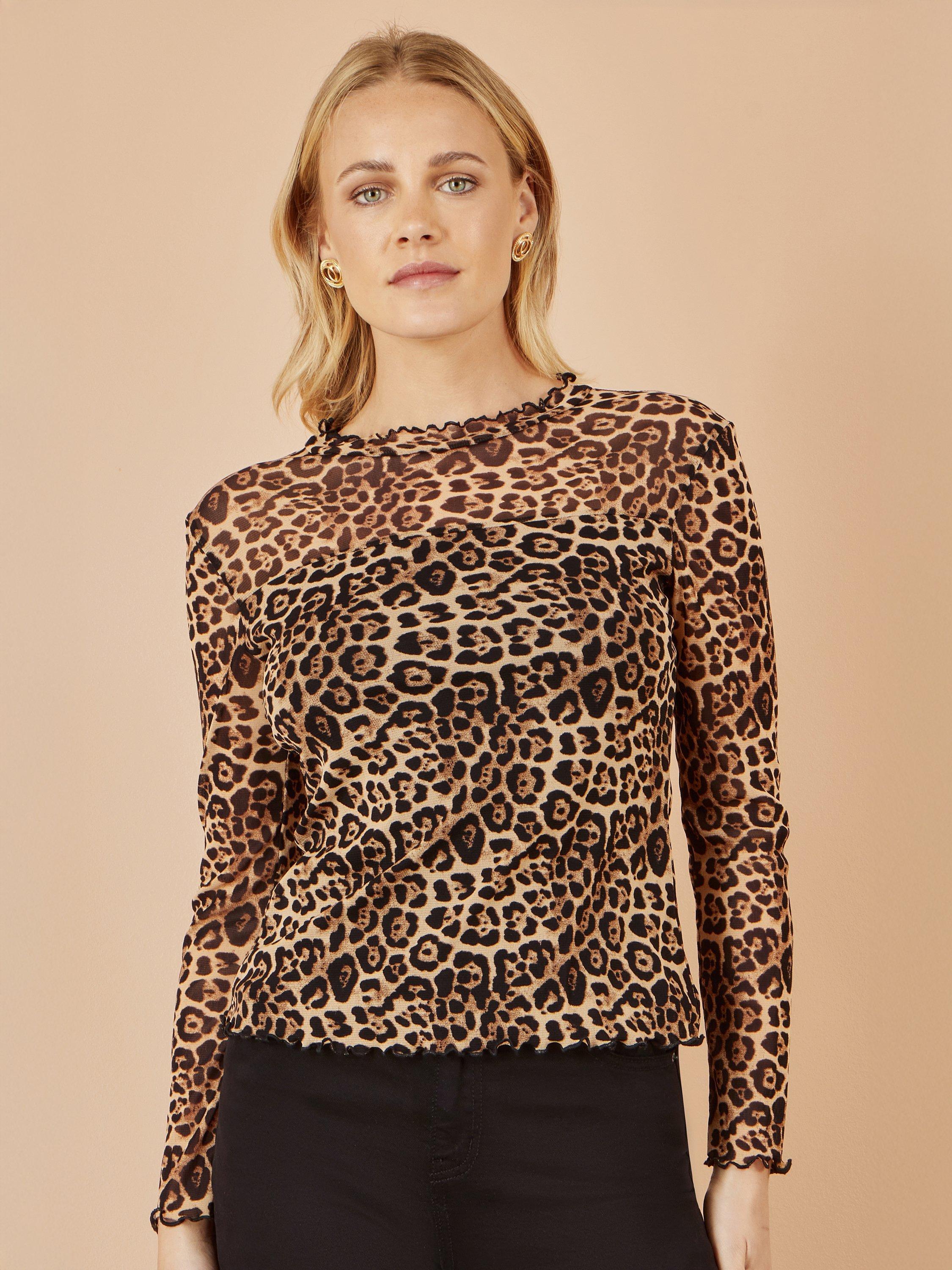 In super stylish leopard print, this top is perfect for dressing up or down. Wear with jeans and an oversized trench or pair with a satin skirt for a party feel. The super fine mesh has stretch for a comfortable, flattering fit. Long sleeves and a lettuce-edge neckline complete the look.