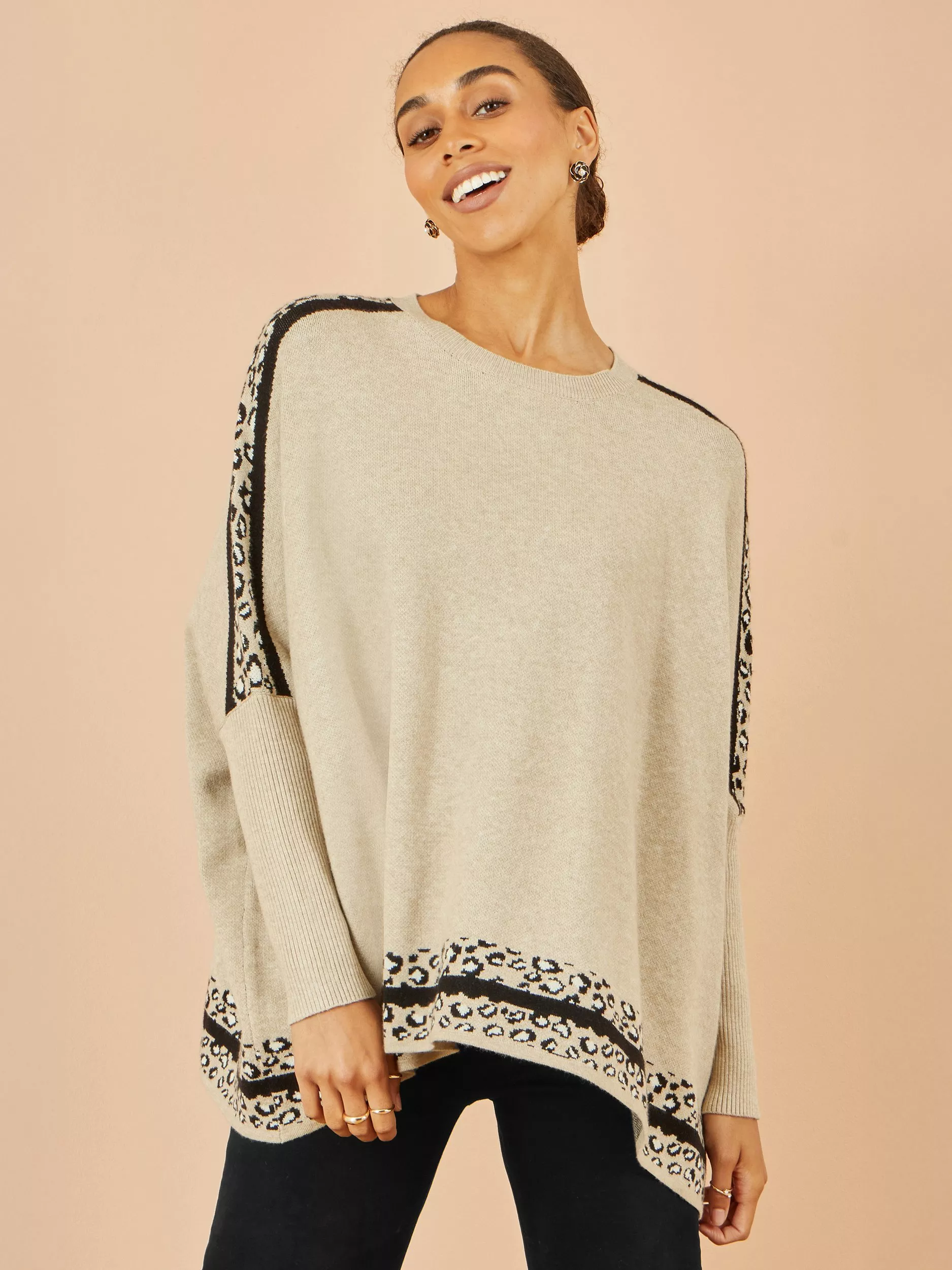 Created using a warming fabric blend, this mid-weight round neck jumper by Yumi features a wild, animal print pattern.