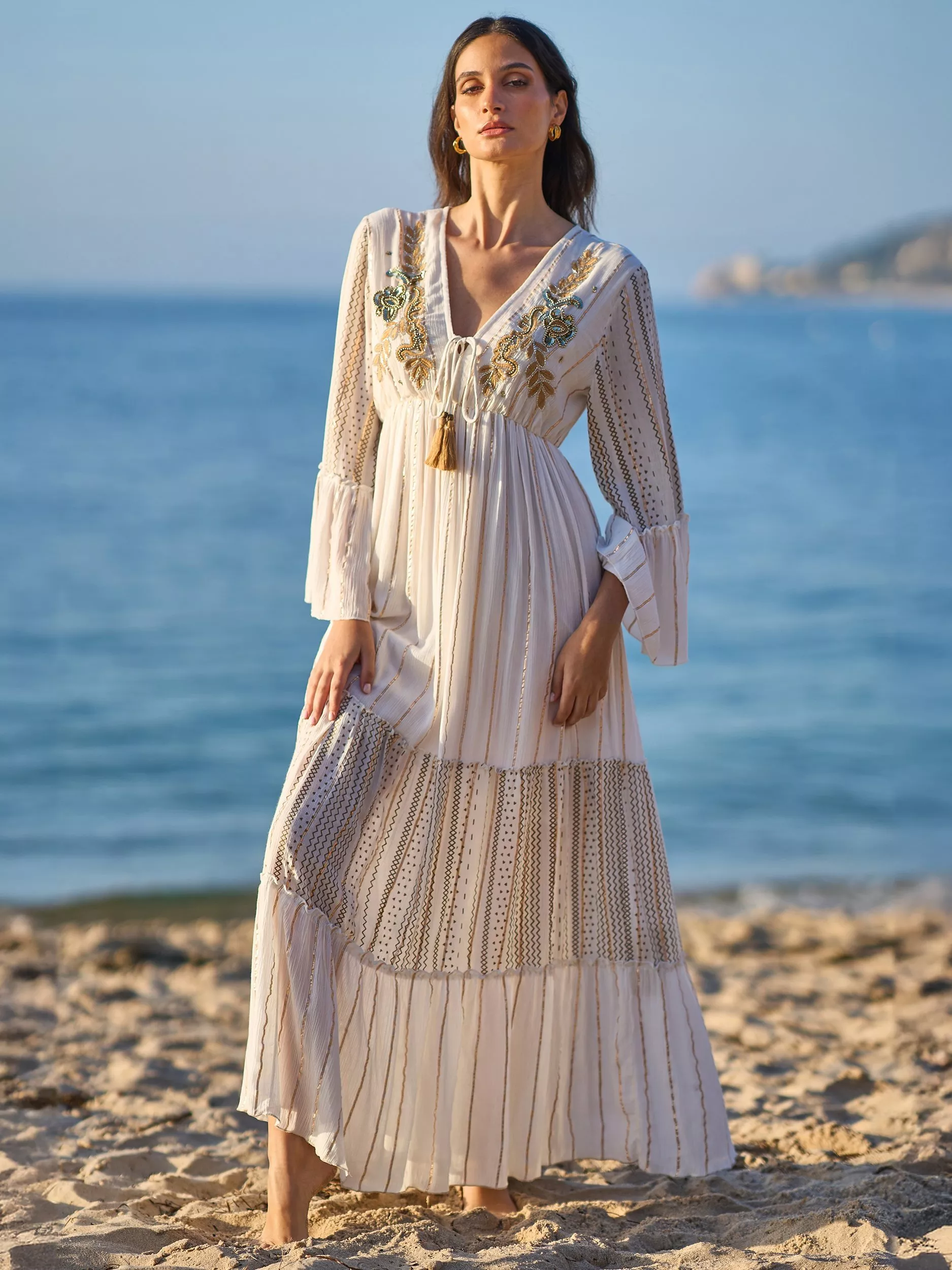 Metallic details, flowing sleeves, a tied neckline and beaded embroidery - this maxi dress has it all. A design like this deserves to be worn in the sunshine and would look perfectly at home at any resort. The maxi length in a viscose fabric ensures you'll be comfortable and cool in all climates. The tiered look is highlighted with striped stitching; we love this worn with a pair of sandals and oversized Sunnie's to complete the look.
