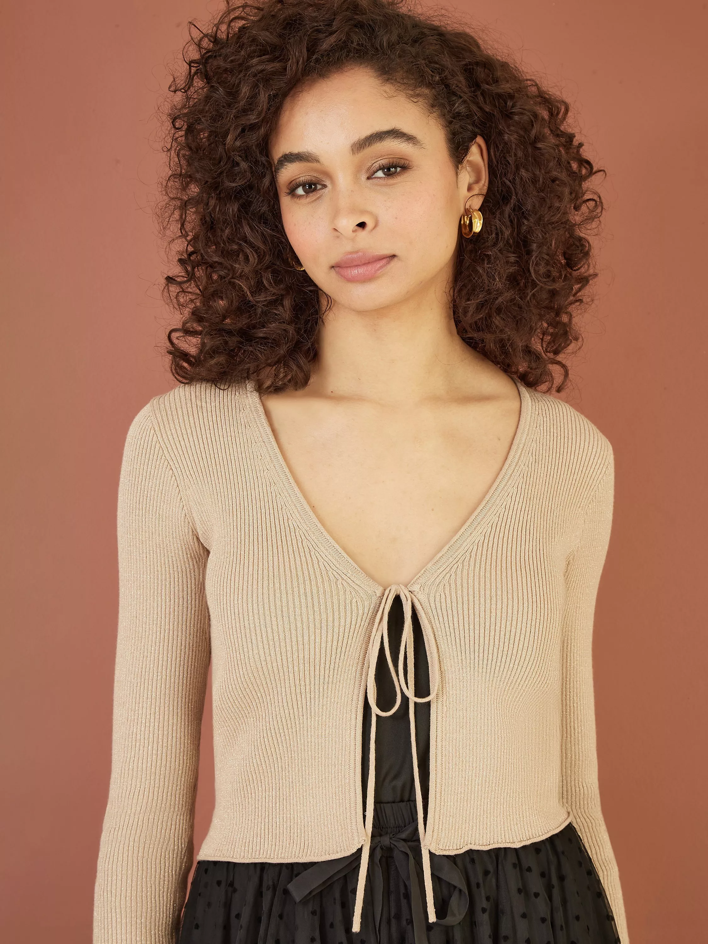 This metallic ribbed tie up cardigan from Yumi is the perfect marriage of sleek and statement style. We adore this piece dressed up with a sequinned Cami and flowy wide legs trousers.