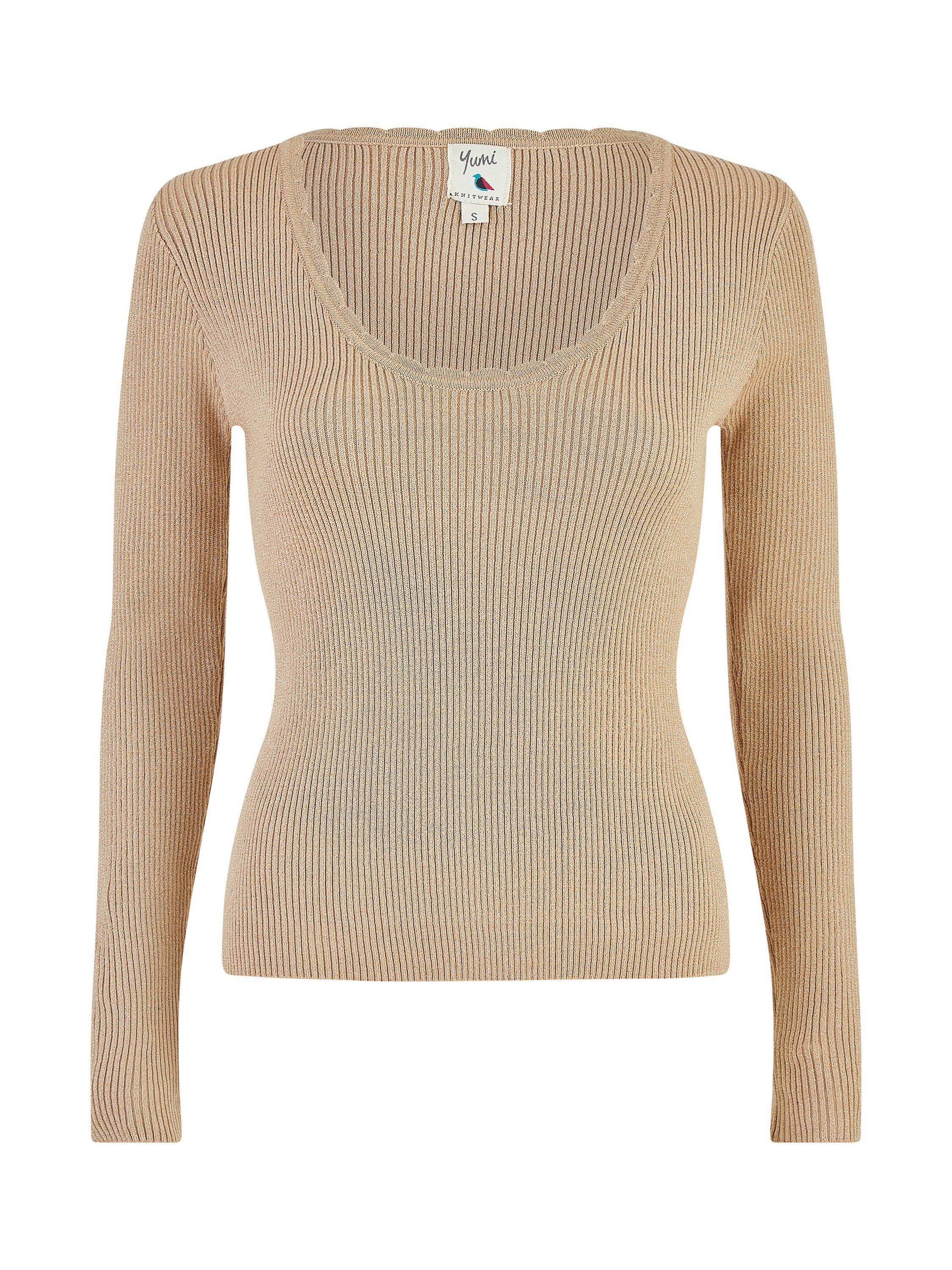 This cute fitted top from Yumi is perfect for the changing seasons - In a shimmering Metallic lightweight knit, the ribbed design adds some comfort to this style. The scallop round neckline and long sleeve design is perfect for pairing with your jeans and trainers for a casual look.