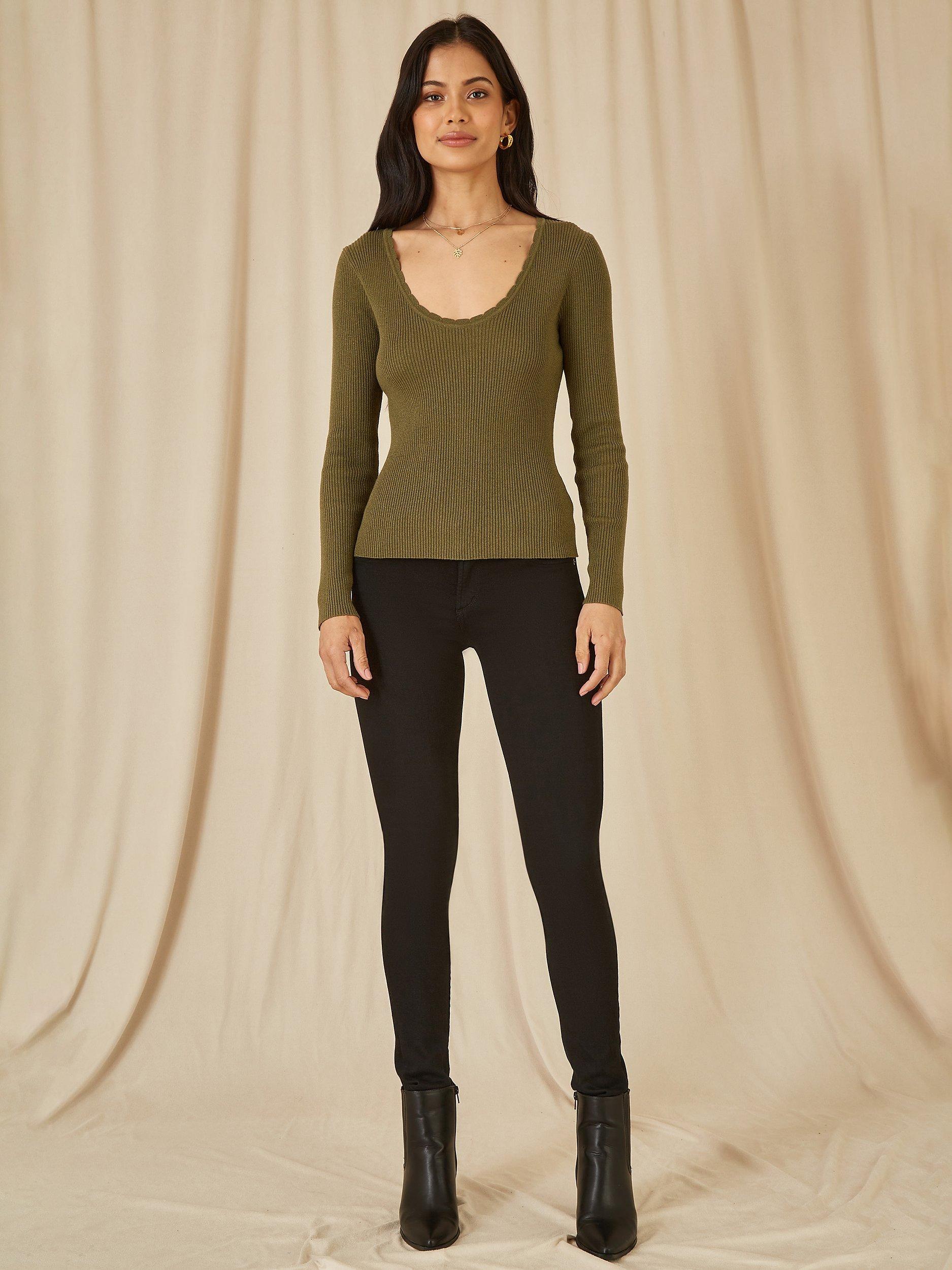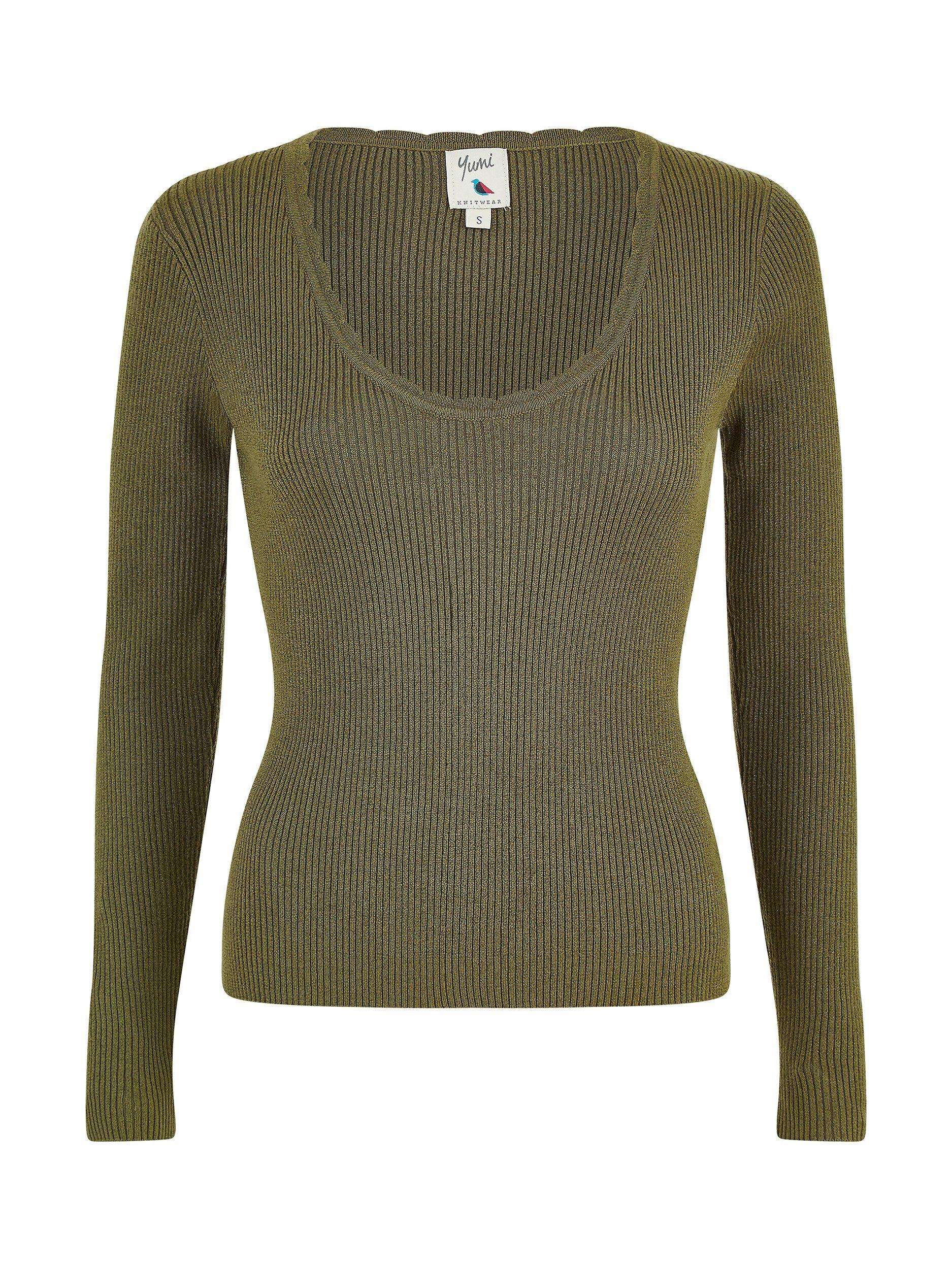 This cute fitted top from Yumi is perfect for the changing seasons. In a shimmering metallic lightweight knit, the ribbed design adds some comfort to this style. The scallop round neckline and long sleeve design is perfect for pairing with your jeans and trainers for a casual look.