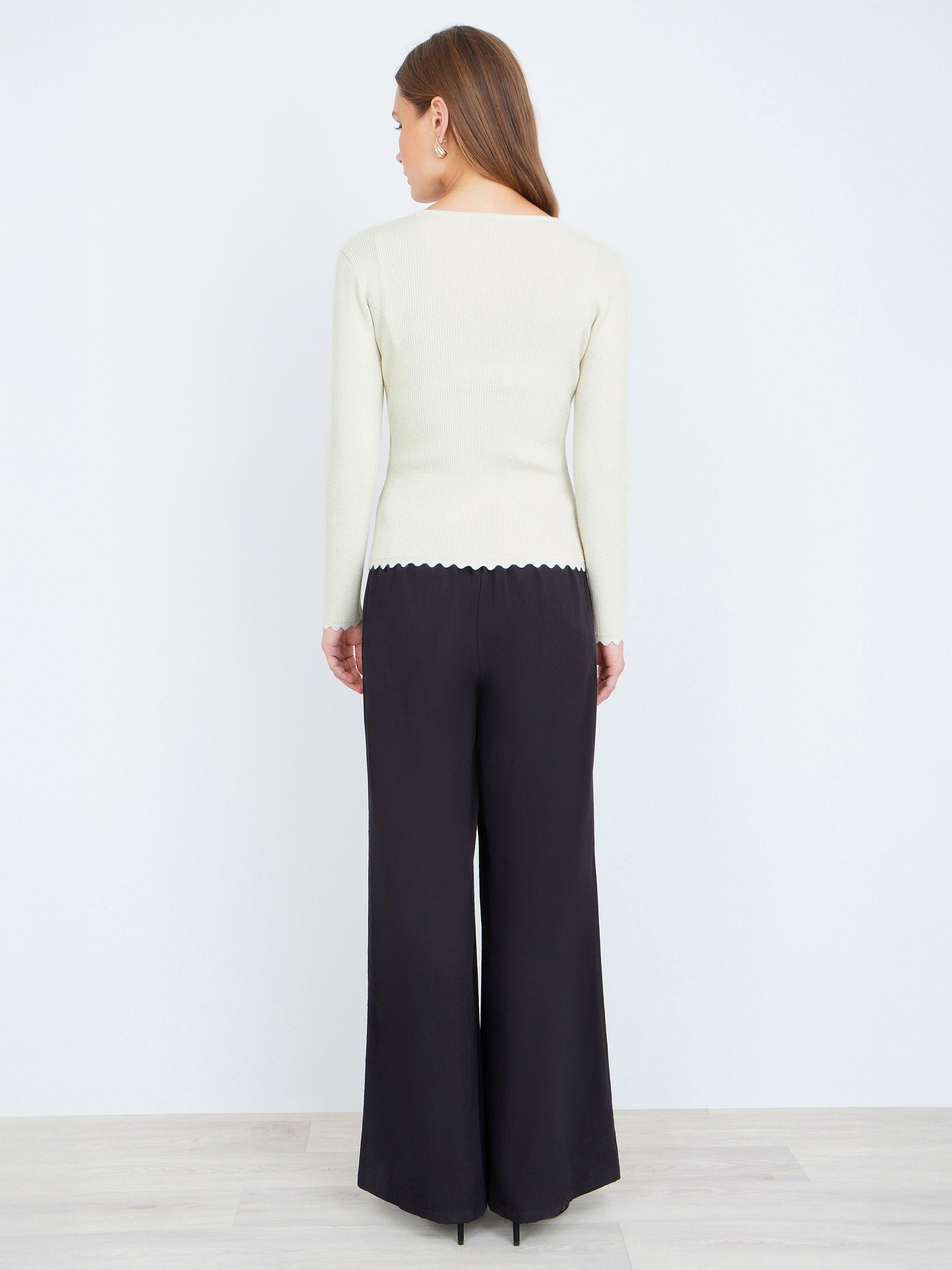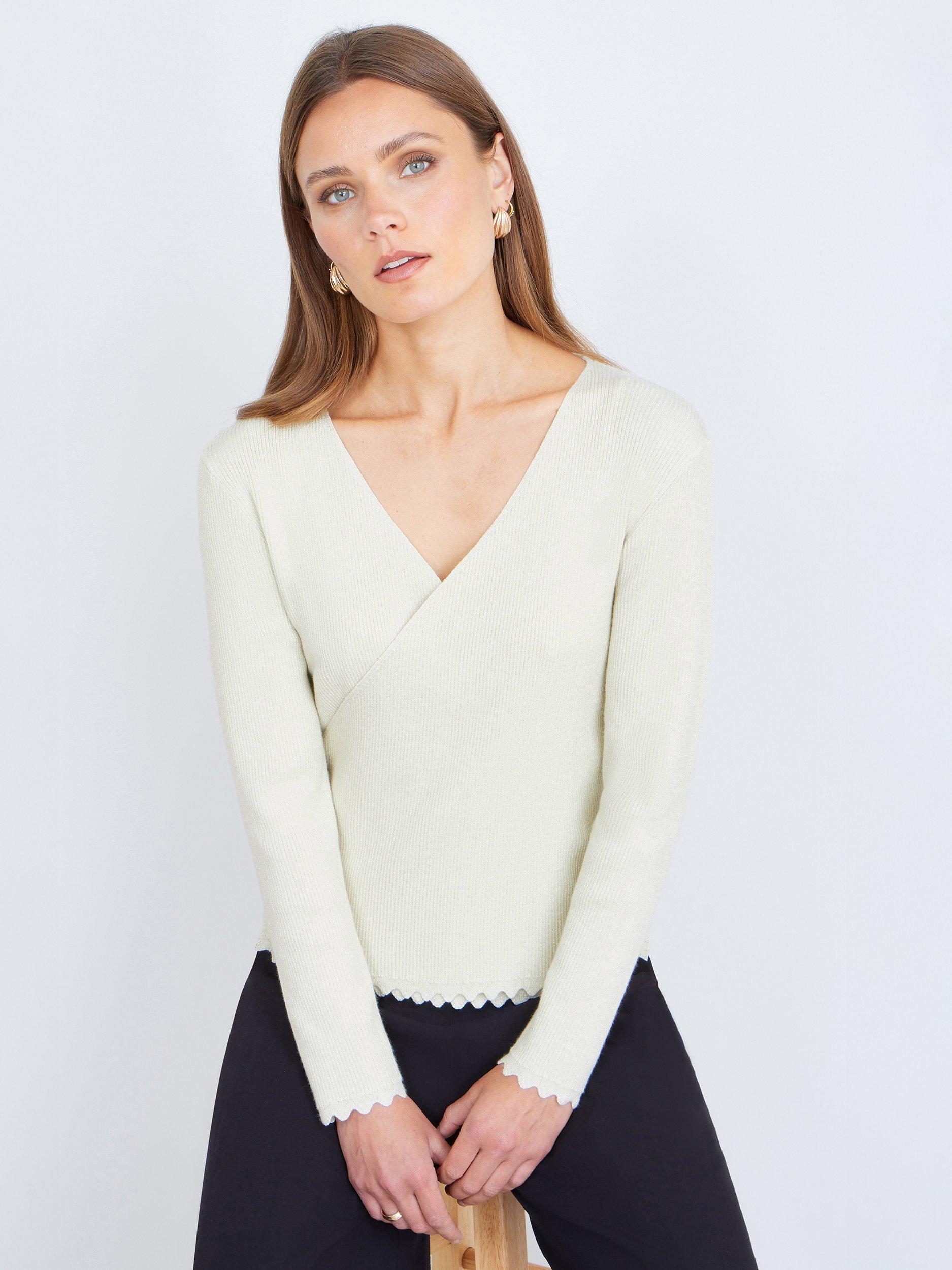 Perfect for smarter invites or work wear, this wrap over top has a chic feel, with lettuce edge finishings and a ribbed knit to complete the look. Wear with jeans or wide-leg trousers for a chic vibe. With a slight stretch to add comfort and a metallic thread finish.