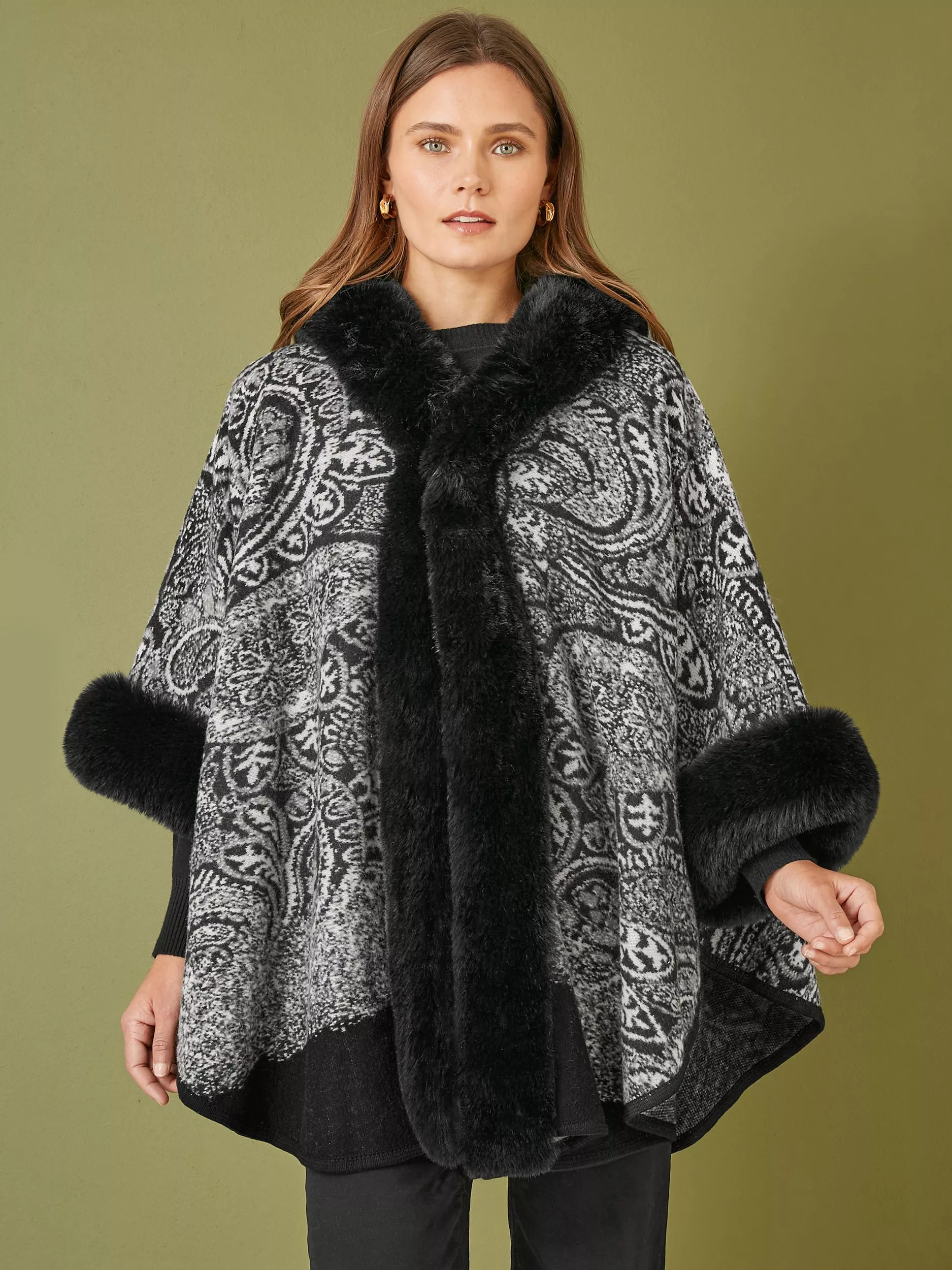 This cosy cape is perfect for the new season and the cooler weather incoming. In a paisley design that will be super easy to style with your casual everyday fits, The lovely soft knit looks perfect with denim and a roll neck jumper. With a luxury faux fur trim at the collar and cuffs.