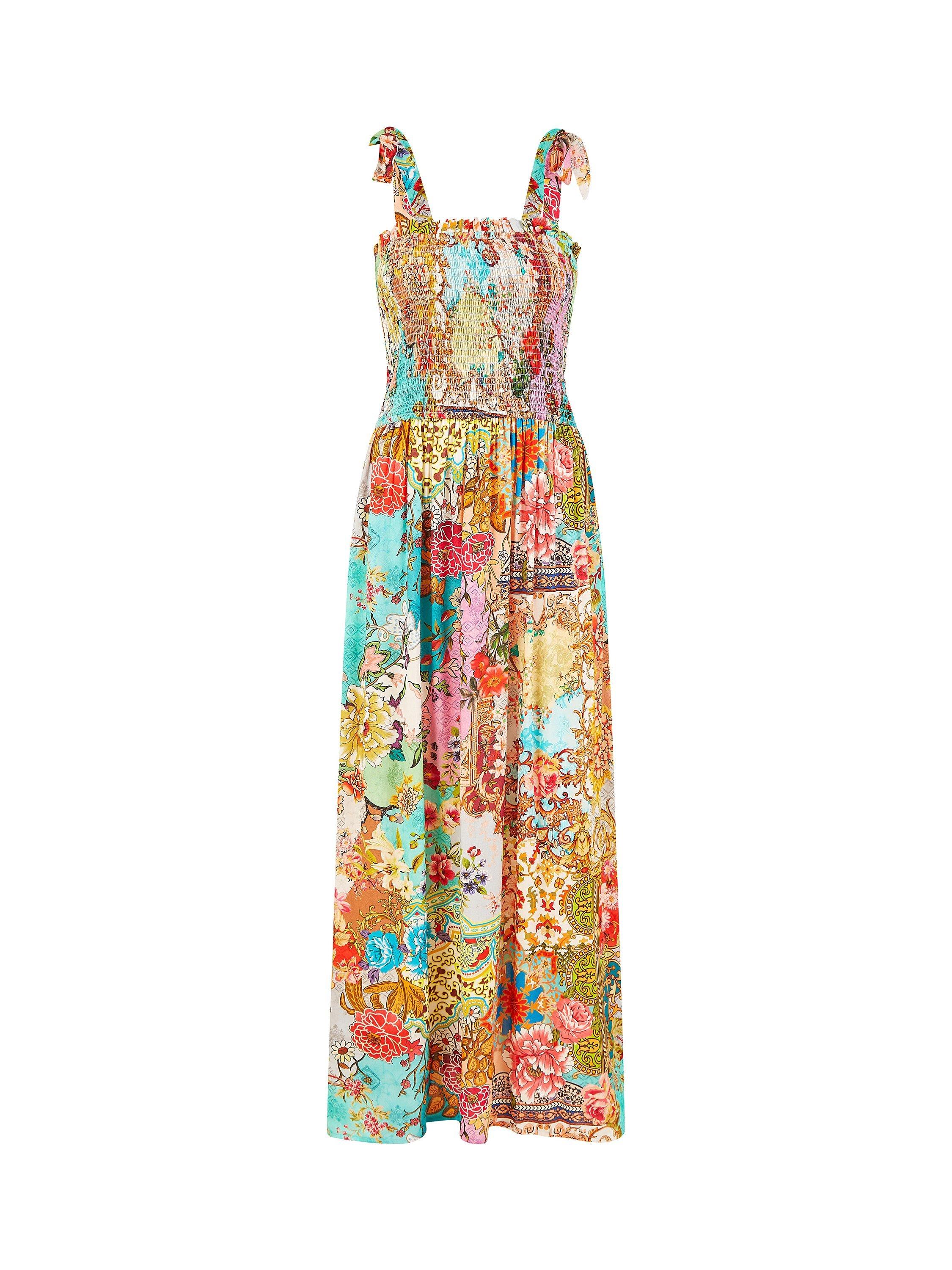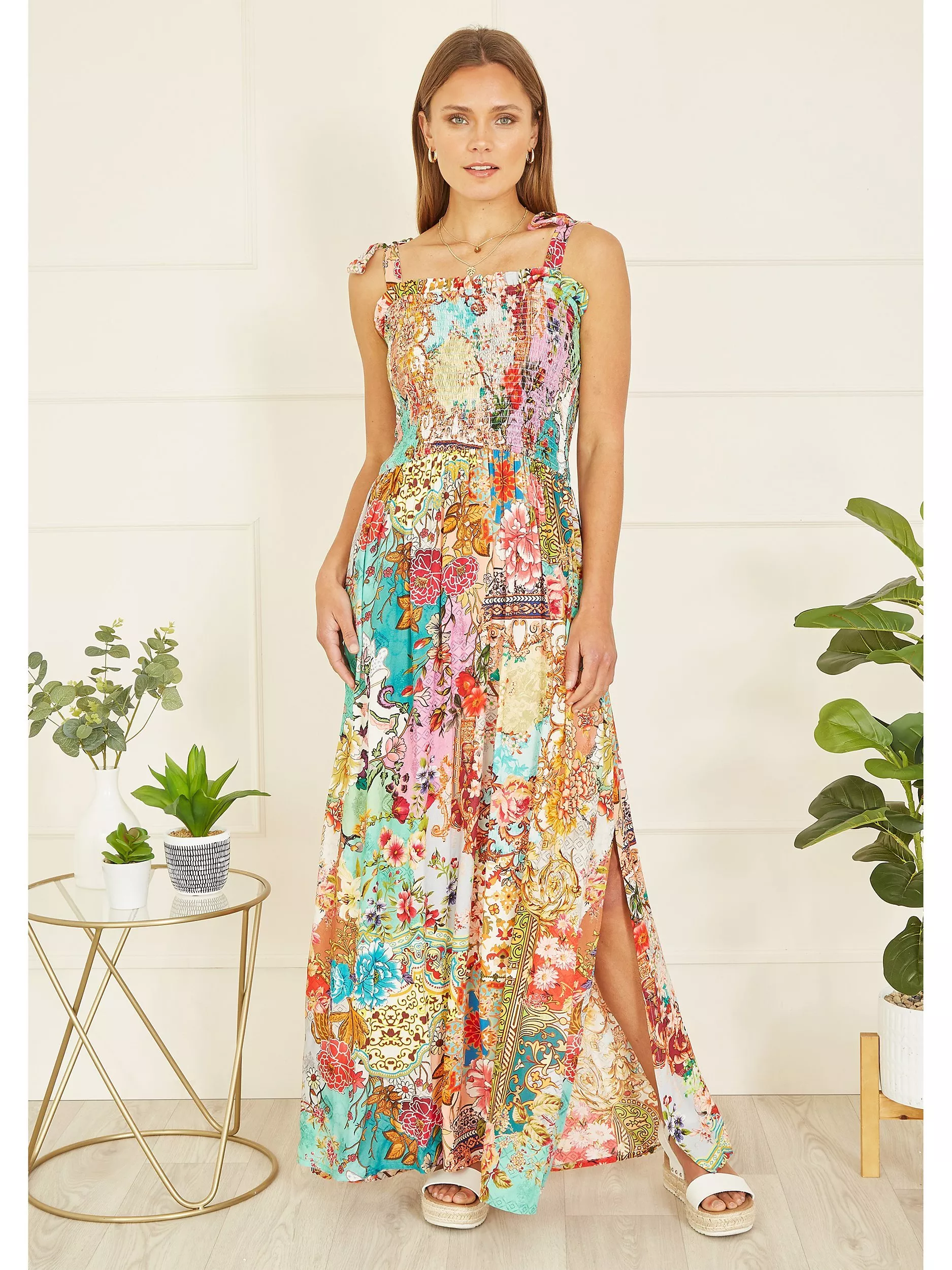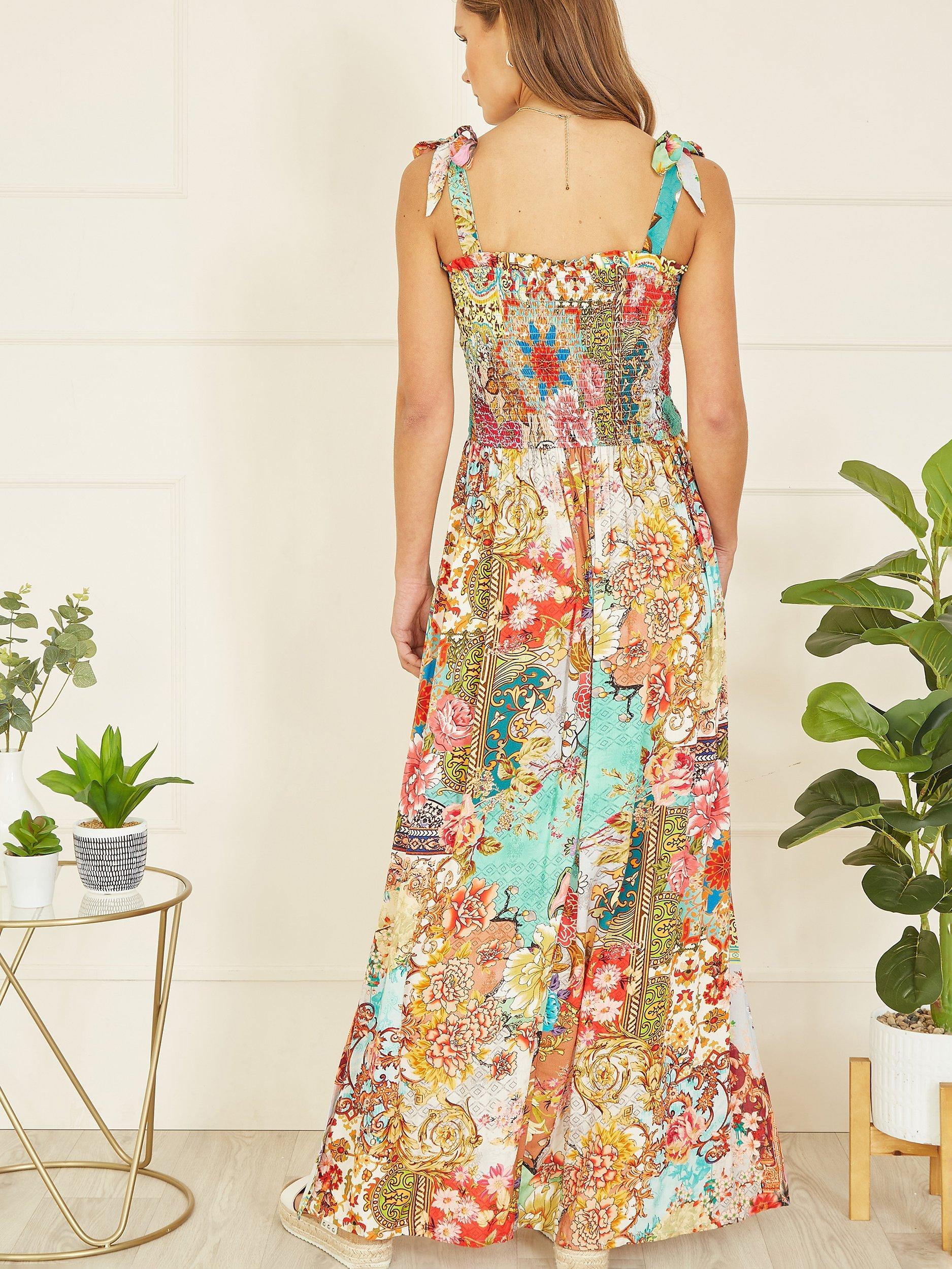 A truly show stopping all over print designed in house for Yumi, inspired by Indian fabrics, with a patchwork feel. This maxi dress will look right at home in the sunshine, with tie straps and a ruched bodice, plus the maxi length has a flirty side split in the hemline. Style with simple sandals and a beach bag.