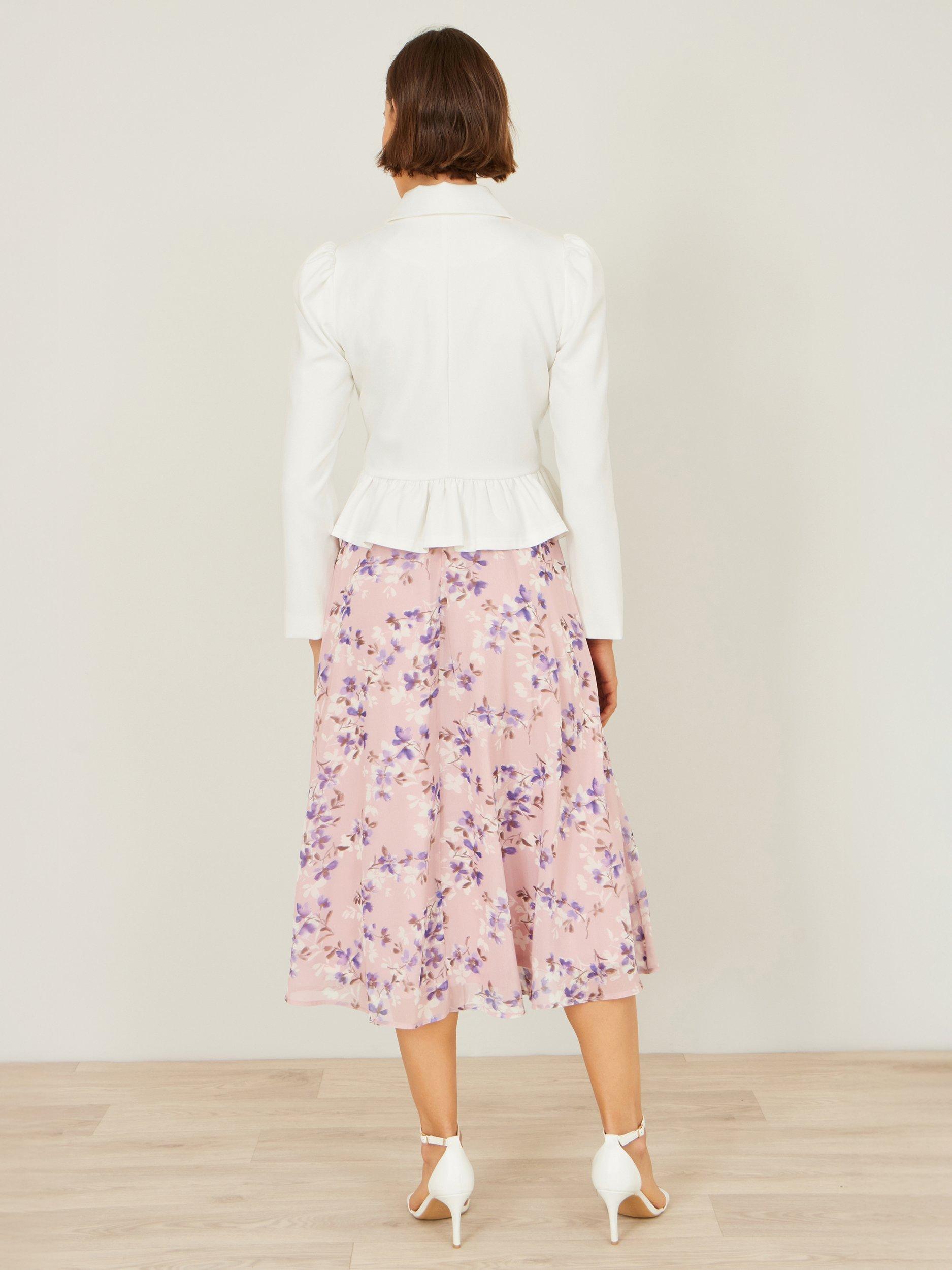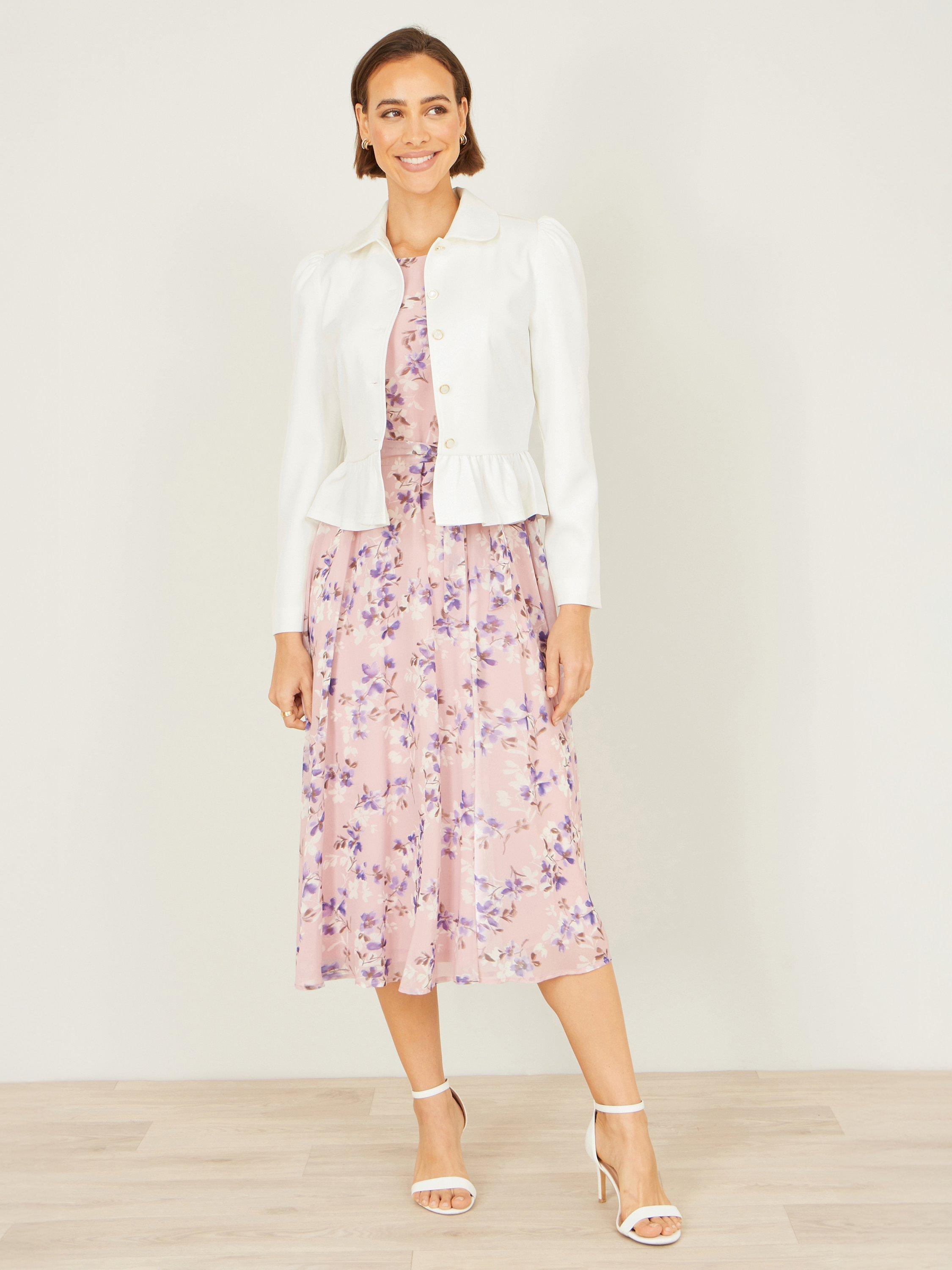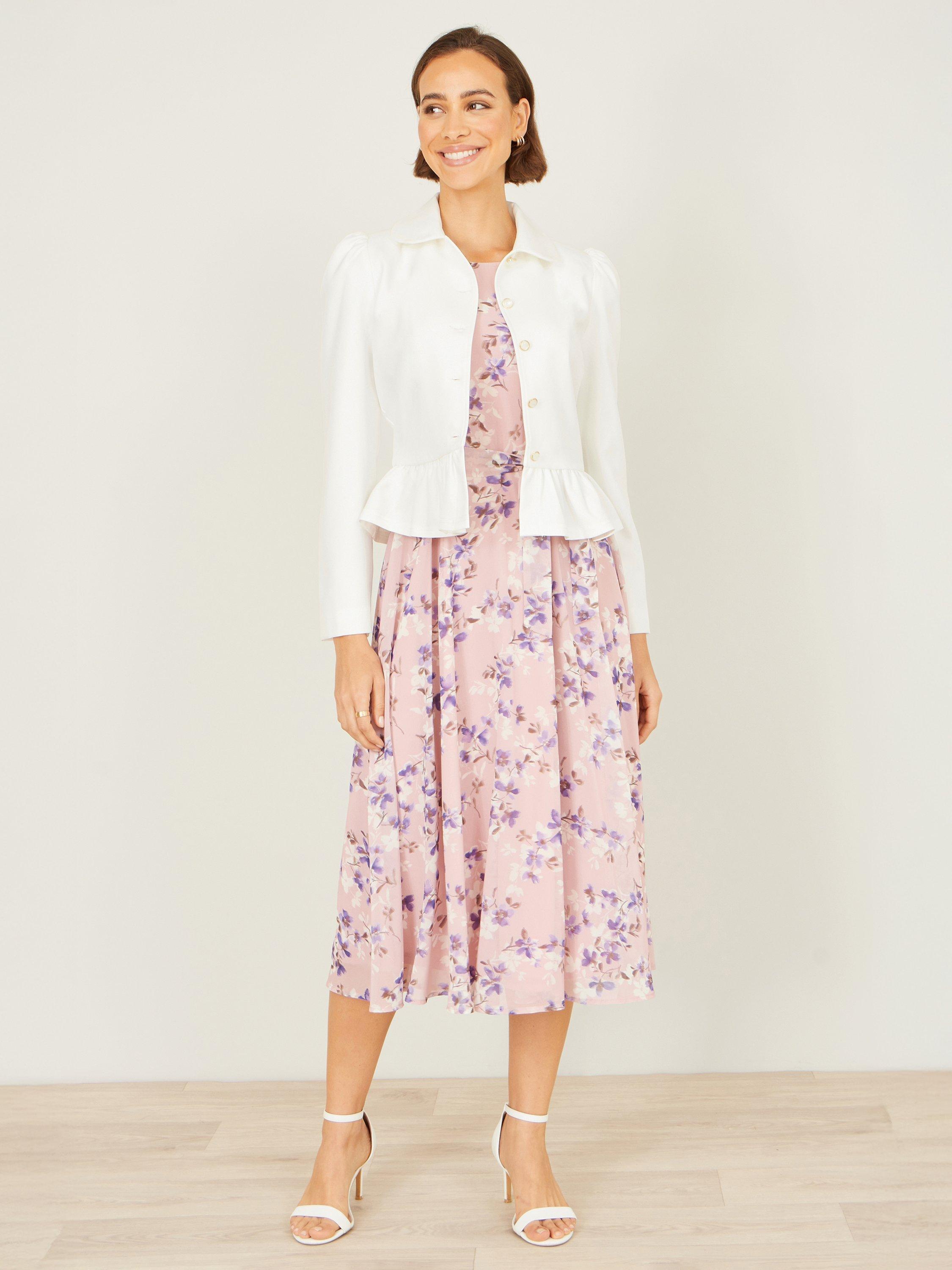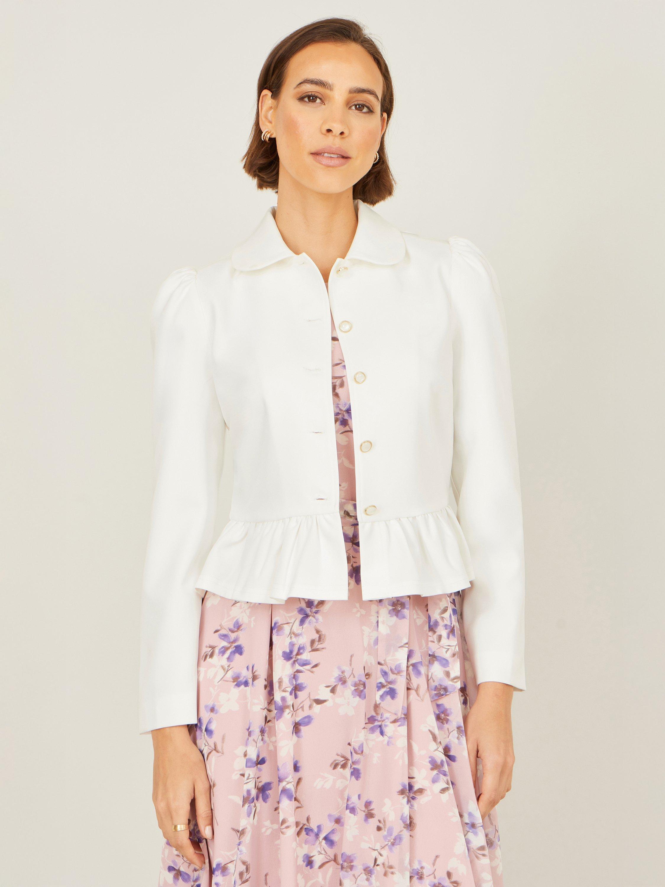 This sleek jacket has a tailored silhouette with subtle puffed shoulders for added structure and a gentle peplum hem that creates a flattering, waist-defining shape. The smooth fabric gives it a softly lustrous finish, while the front button closure adds classic sophistication. With its clean lines and graceful design, this jacket is the perfect layering piece for special occasions, garden parties, or elevating everyday ensembles.