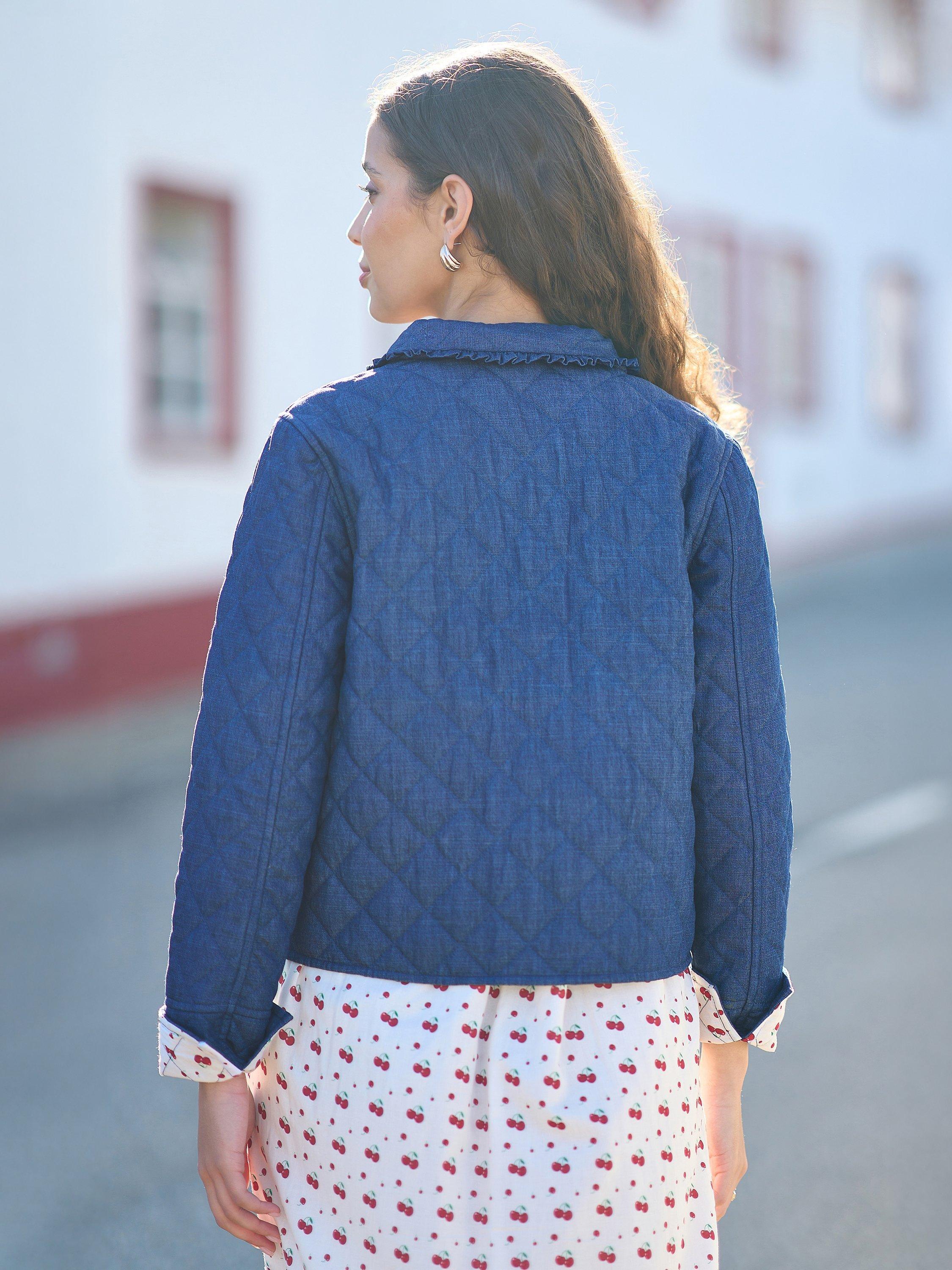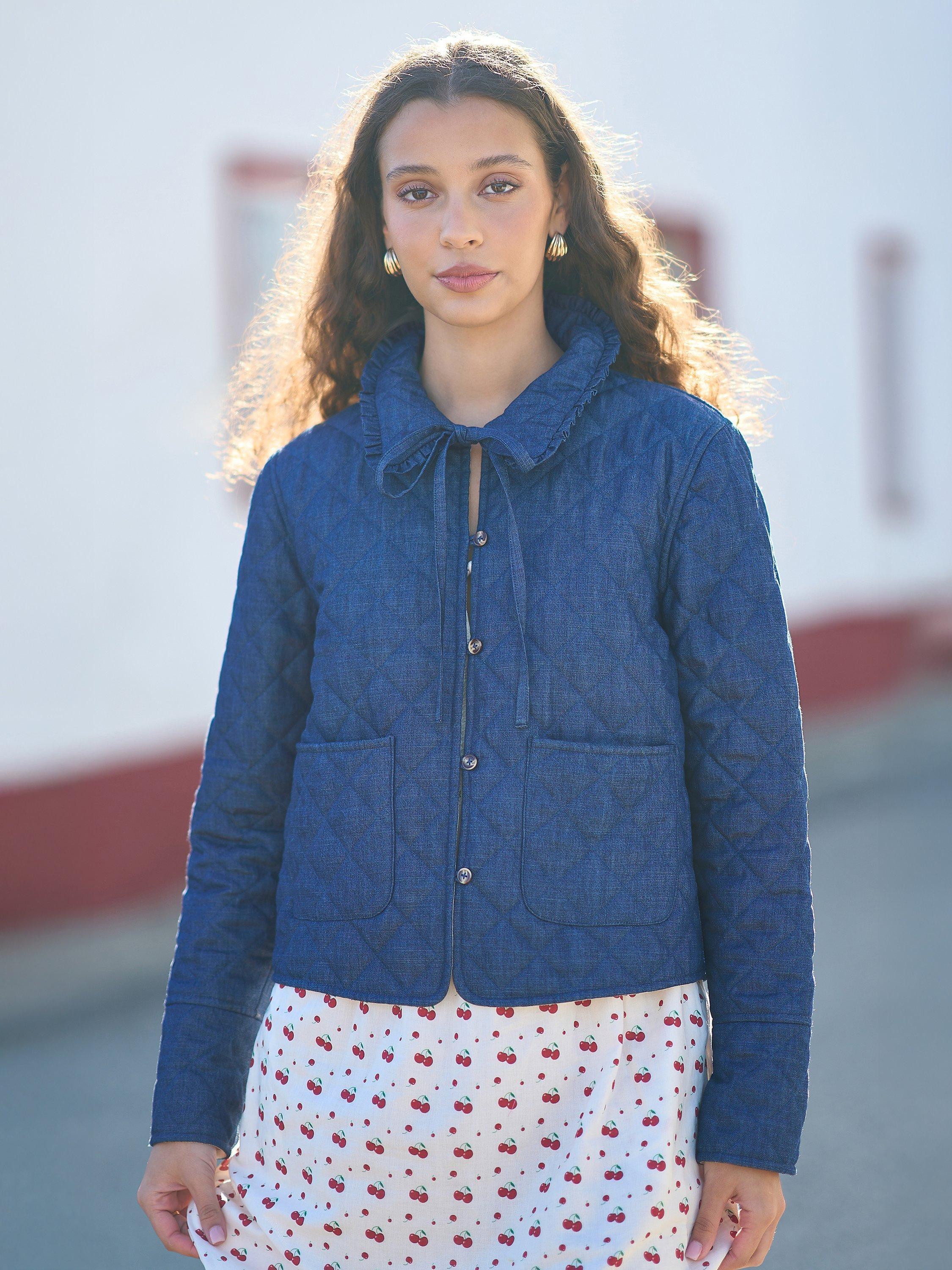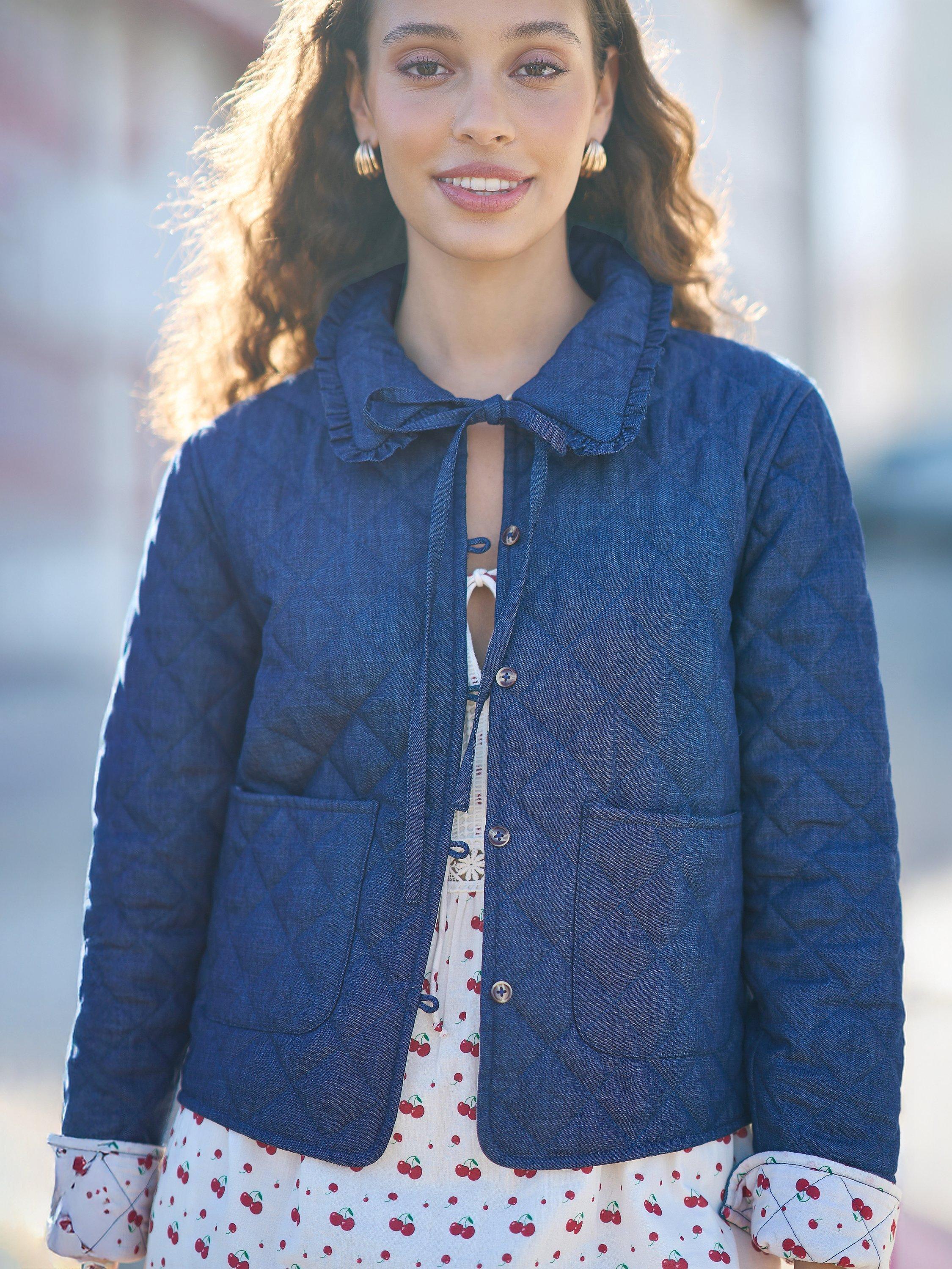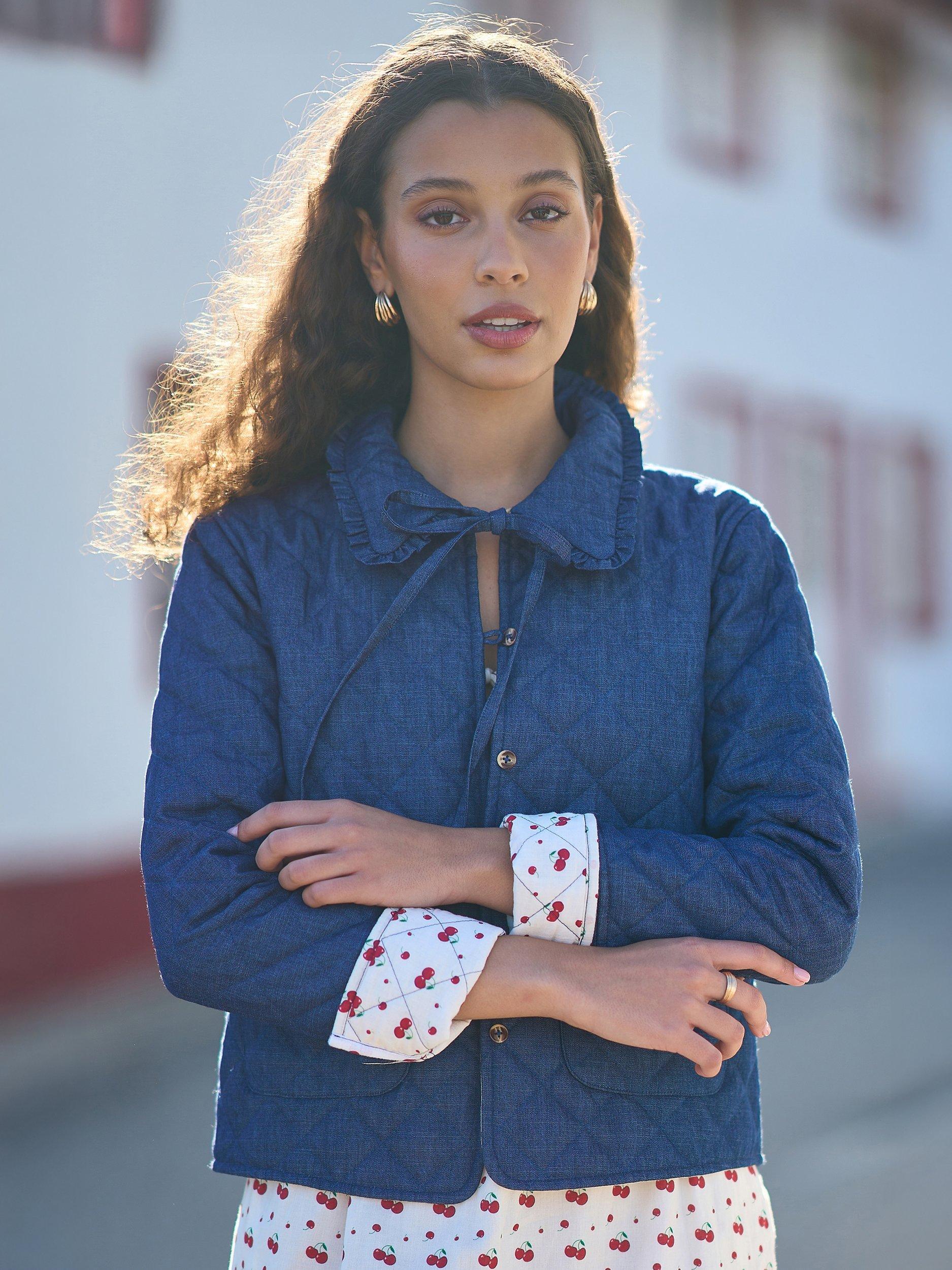 For bang-on-trend outerwear, we love this denim quilted jacket. With a cute cherry print on the inside, and a frill hemmed collar that is finished with a tie to make a bow when fastened. Wear over the cutest spring dresses to complete your spring fit. The patch pockets and button-up design complete the look.
