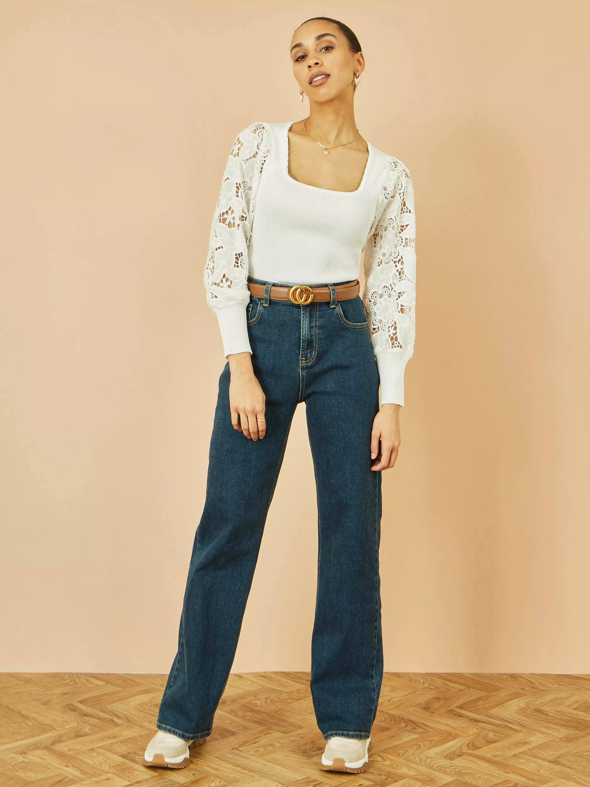 This gorgeous ribbed knitted top has the most beautiful lace sleeves. The square neckline is flattering and this top looks perfect paired with denim for everyday.