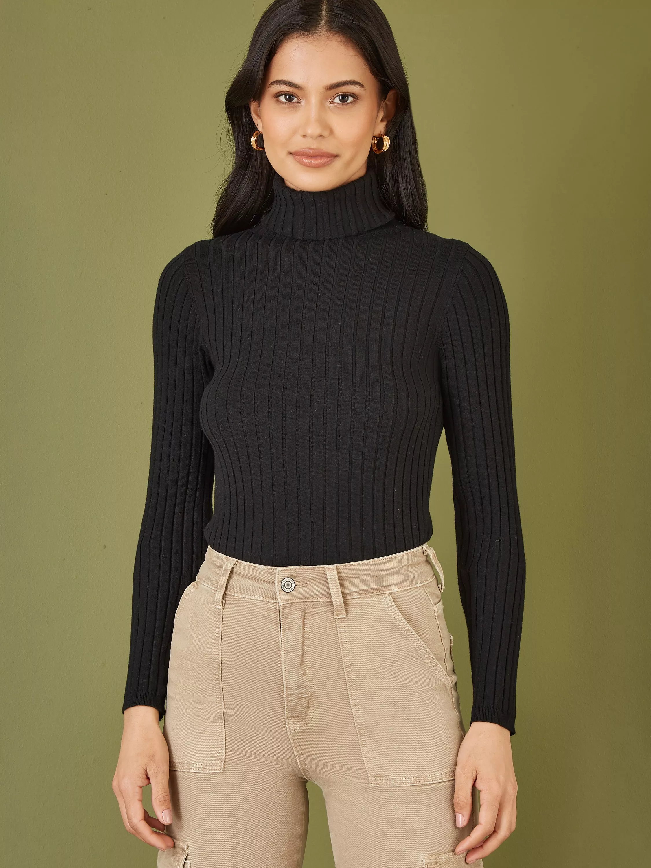 Keep it classy in this staple wardrobe essential for the Autumn season. The fitted ribbed knit is perfect for pairing with wide-leg trousers or jeans for a comfy look that is smart and on-trend. Featuring a gorgeous roll neckline that will keep you warm as the weather cools. This supersoft knit really is a classic that you will be able to style over and over again.