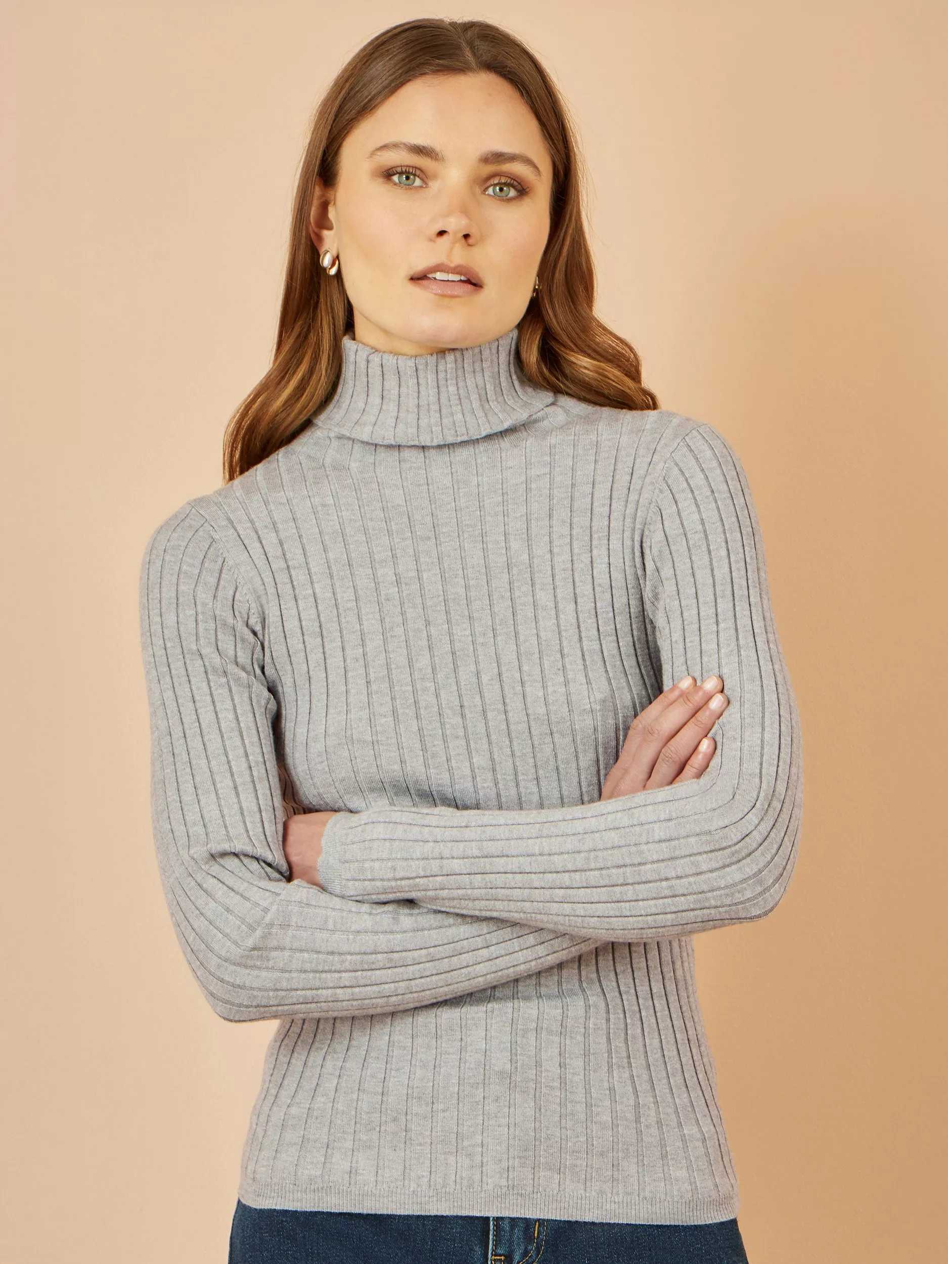 Keep it classy in this staple wardrobe essential for the Autumn season. The fitted ribbed knit is perfect for pairing with wide-leg trousers or jeans for a comfy look that is smart and on-trend. Featuring a gorgeous roll neckline that will keep you warm as the weather cools. This supersoft knit really is a classic that you will be able to style over and over again.