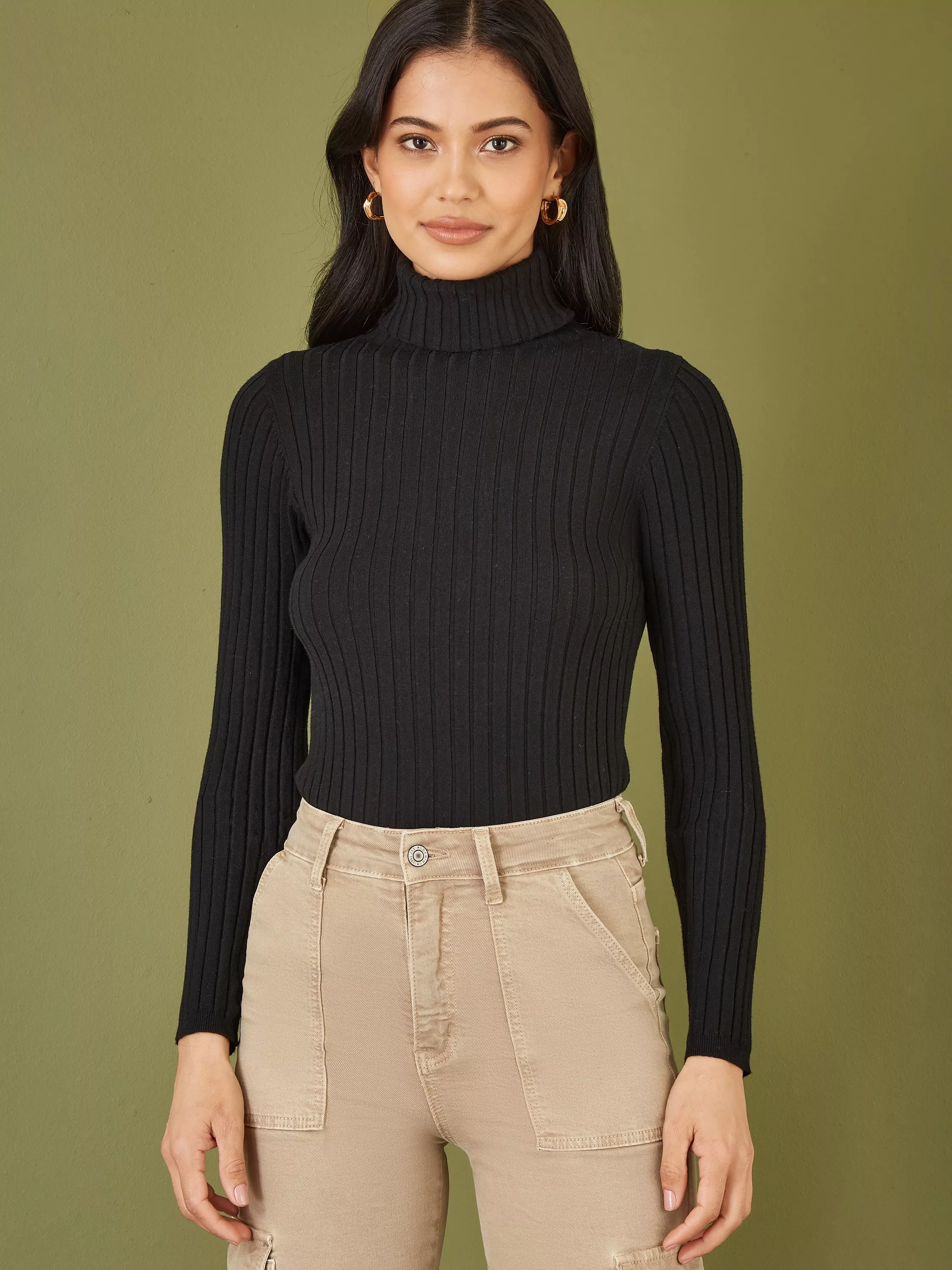 Keep it classy in this staple wardrobe essential for the Autumn season. The fitted ribbed knit is perfect for pairing with wide-leg trousers or jeans for a comfy look that is smart and on-trend. Featuring a gorgeous roll neckline that will keep you warm as the weather cools. This supersoft knit really is a classic that you will be able to style over and over again.
