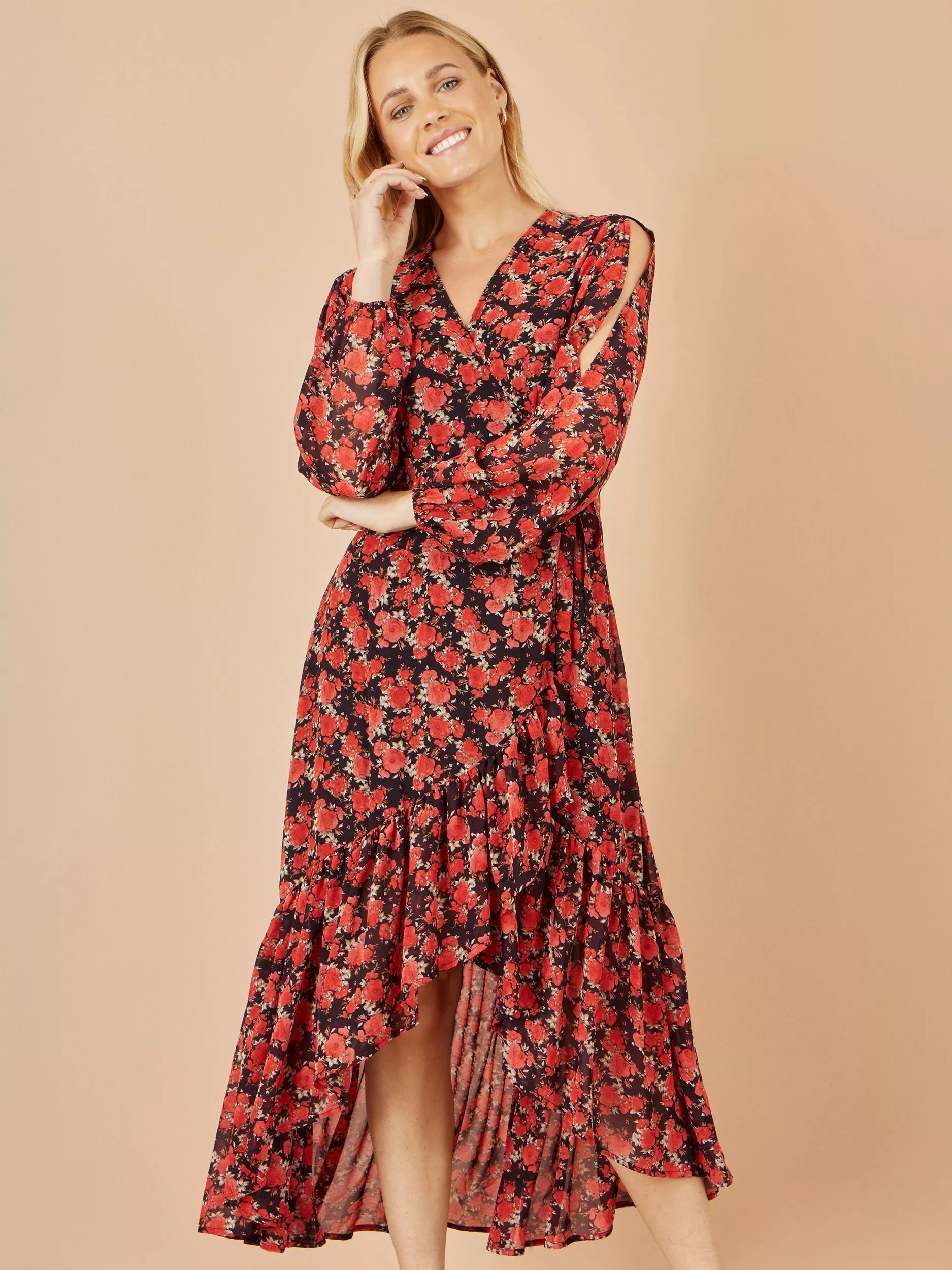 Opt for a gorgeous rose print for a pretty take on summer prints. This dress boasts a stunning shape that floats and flows over the body, with a V neckline, wrap shape and dipped hem that adds to the flirty feel. We adore the long split sleeves for a twist on this classic fit. Perfect for holidays or summer invites this season.