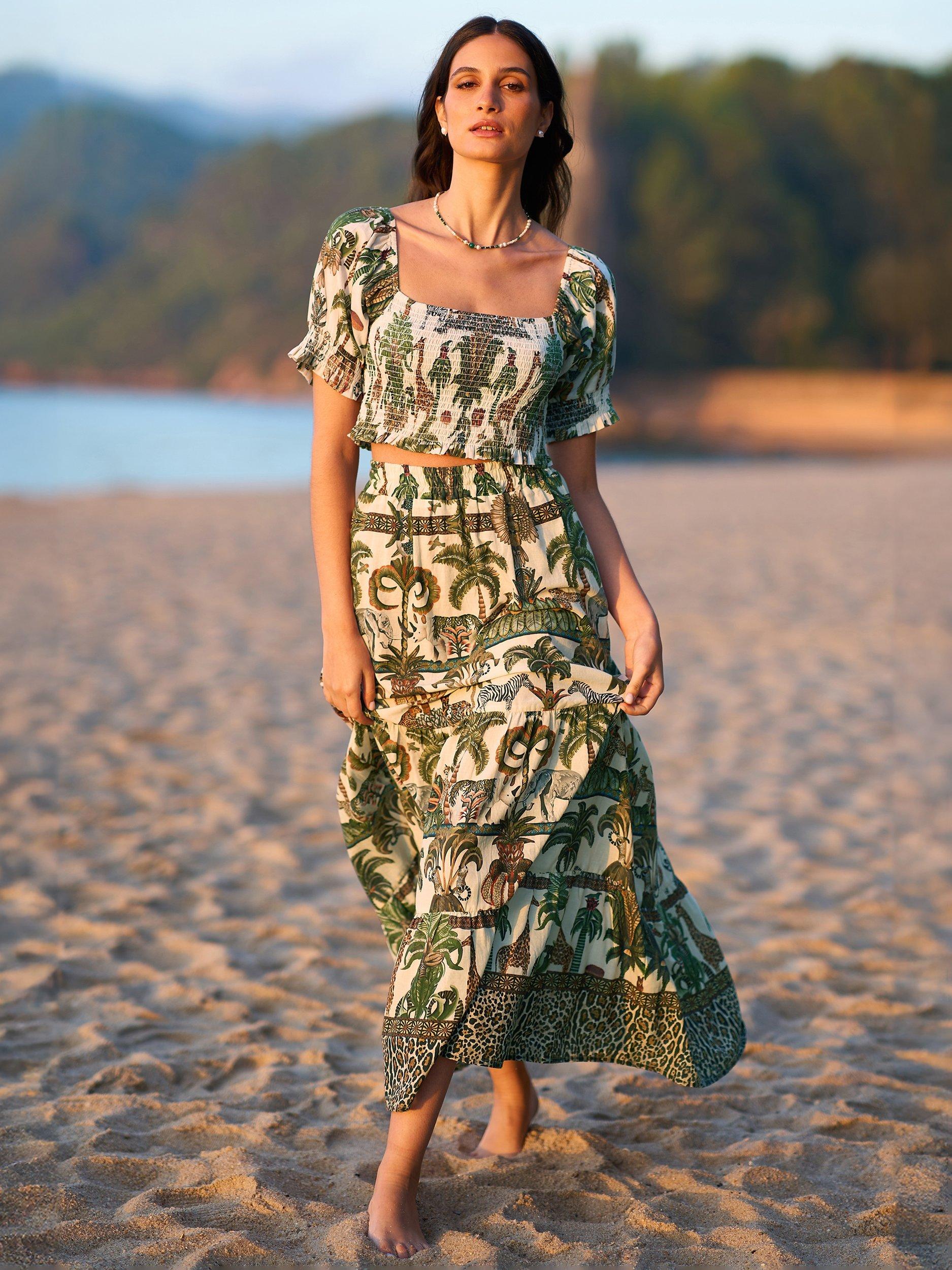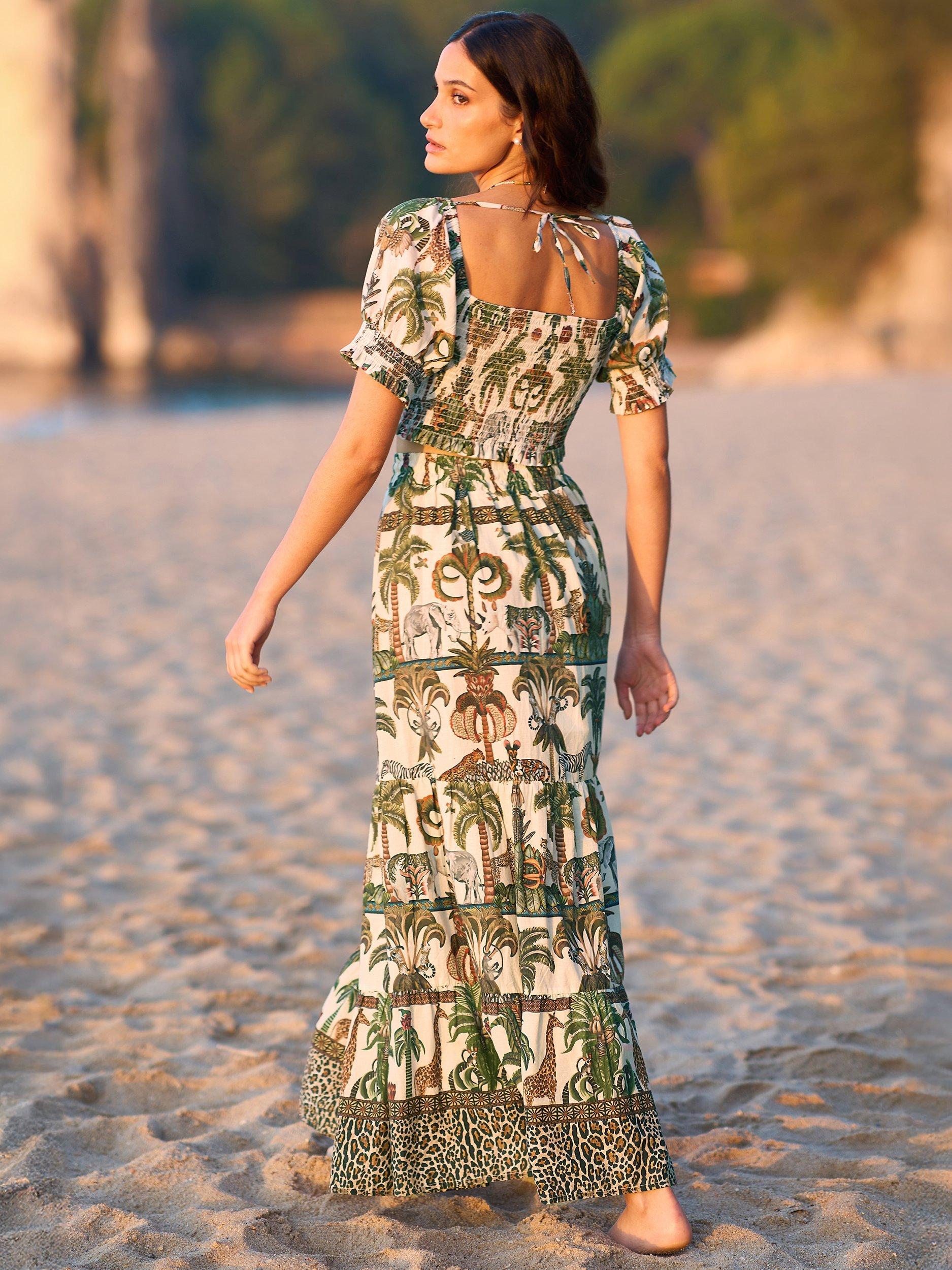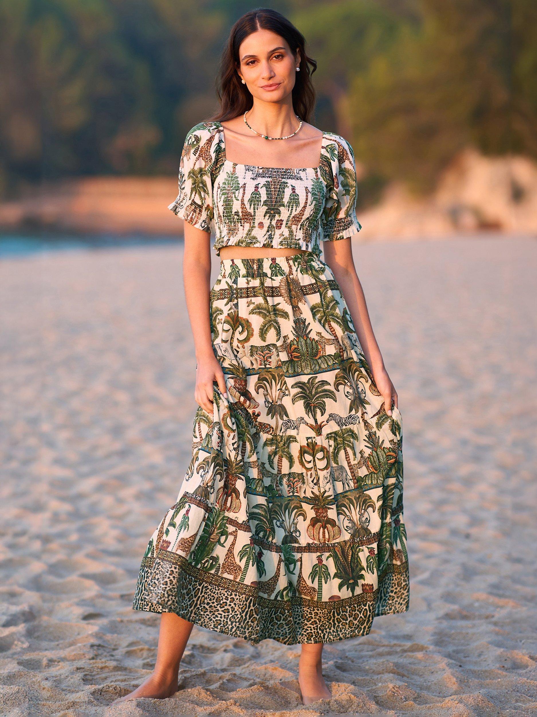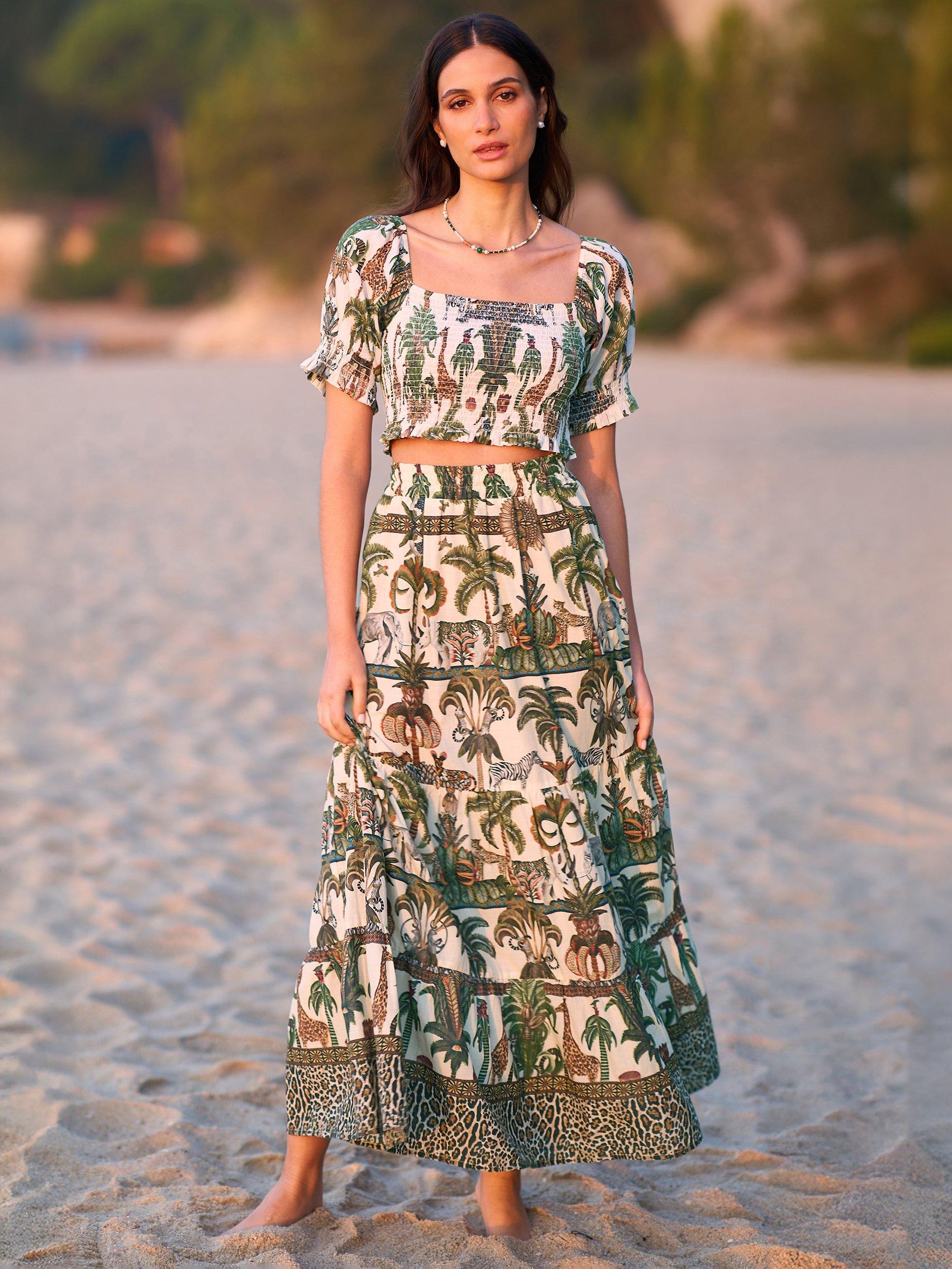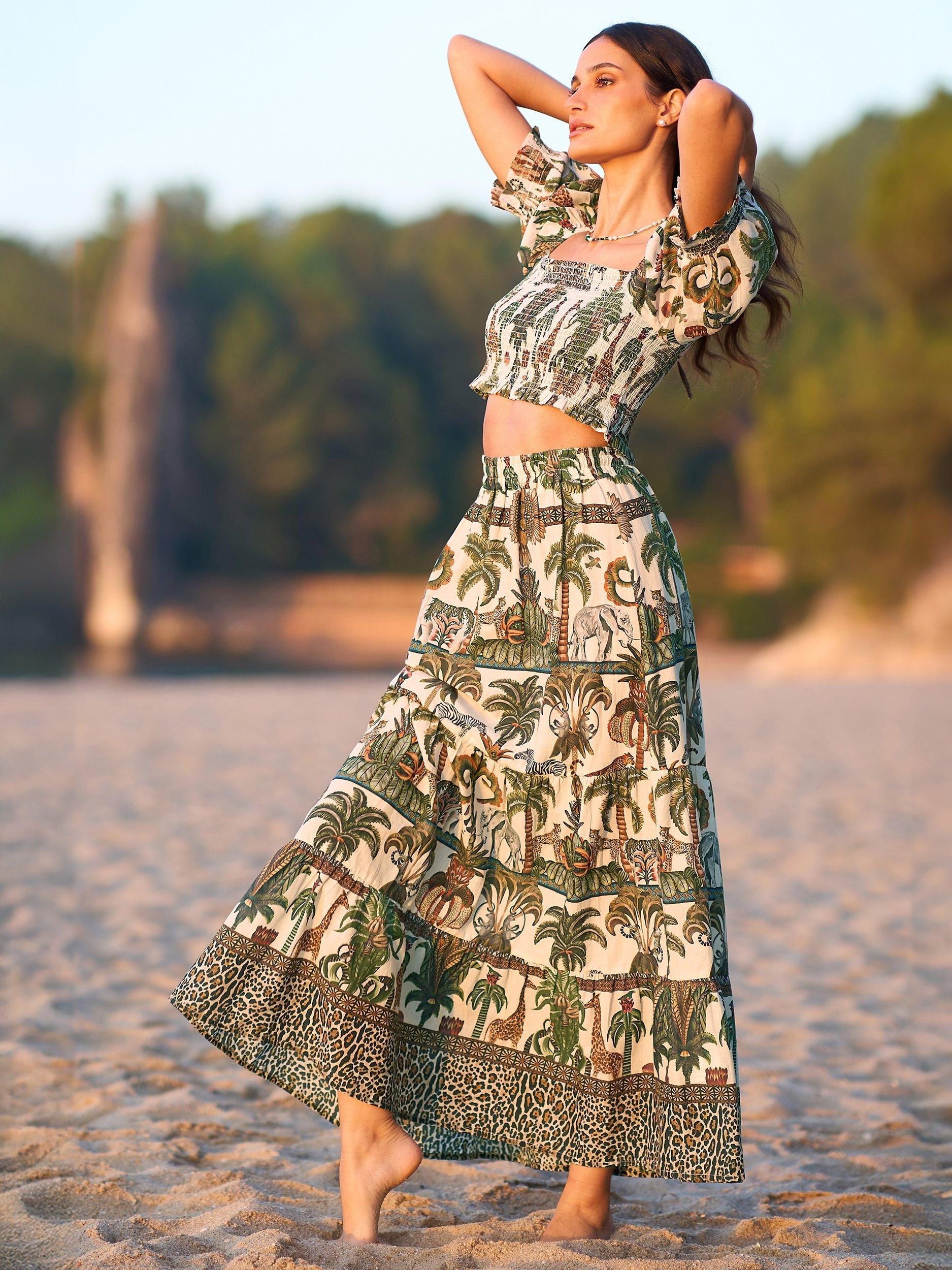 Made from lightweight cotton this midi skirt is perfect for summer time. With a safari animal print designed in house for Yumi, we love it styled with a plain t-shirt for a holiday feel.