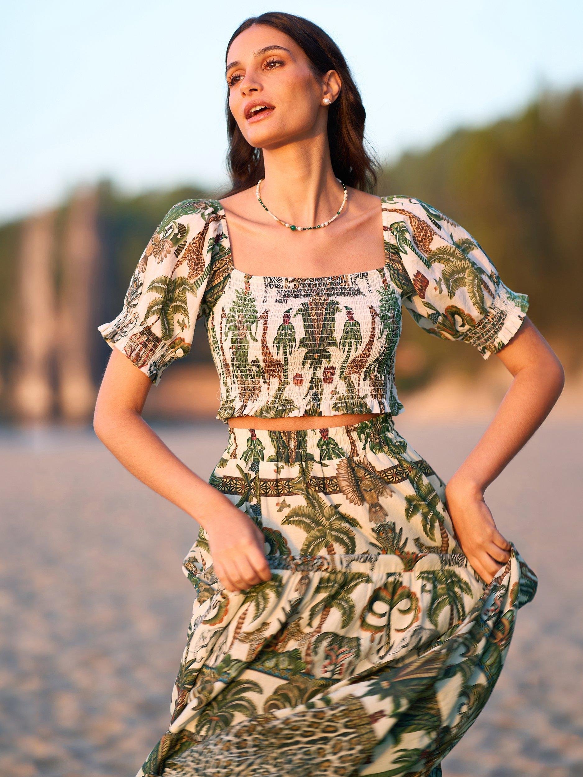 Made from lightweight organic cotton, this ruched-style crop top is perfect for summer time. With a safari animal print designed in-house for Yumi, we love it styled with wide leg trousers for a holiday feel. The cute puff sleeves and square neckline are flattering and offer a relaxed feel.