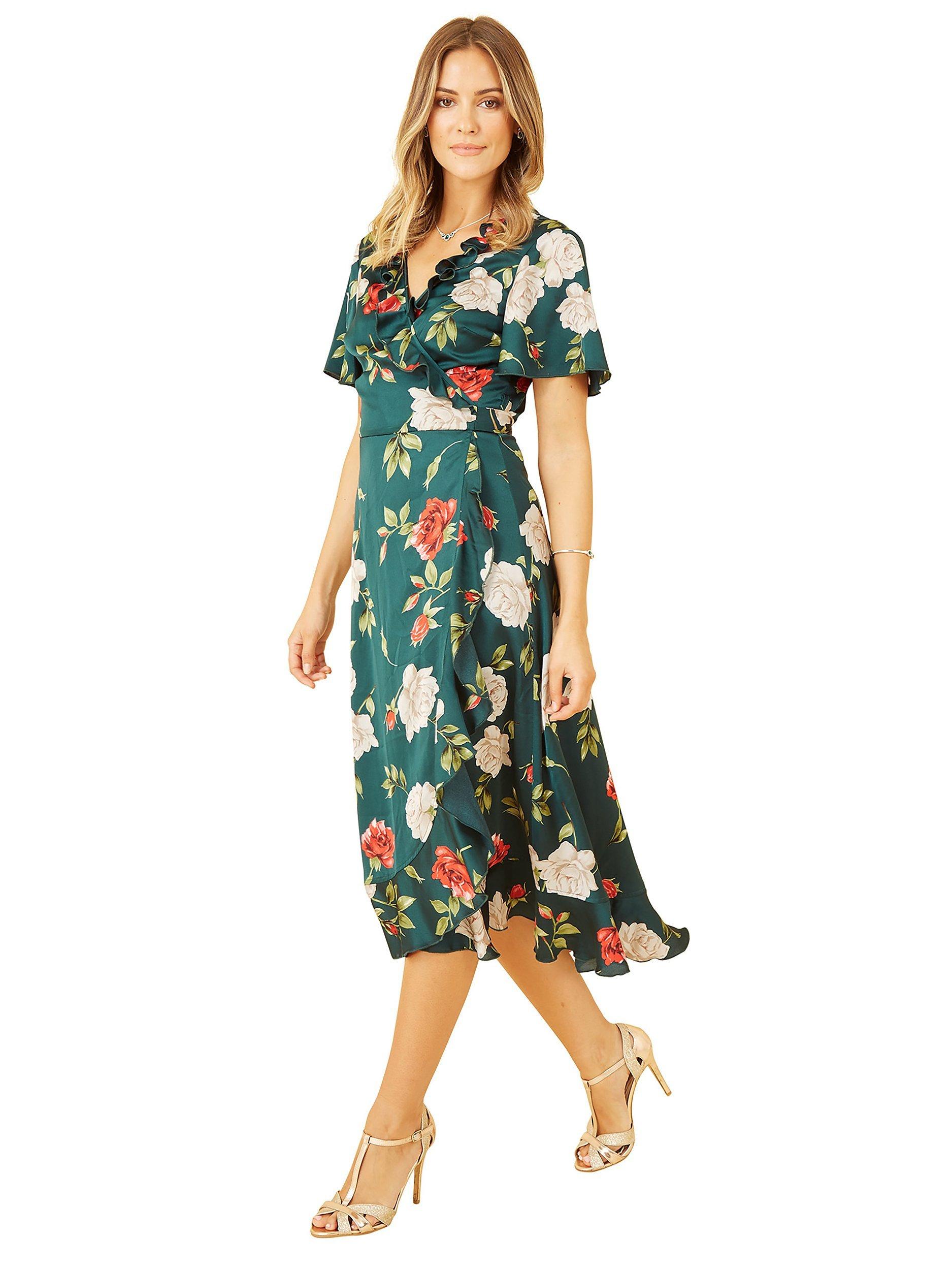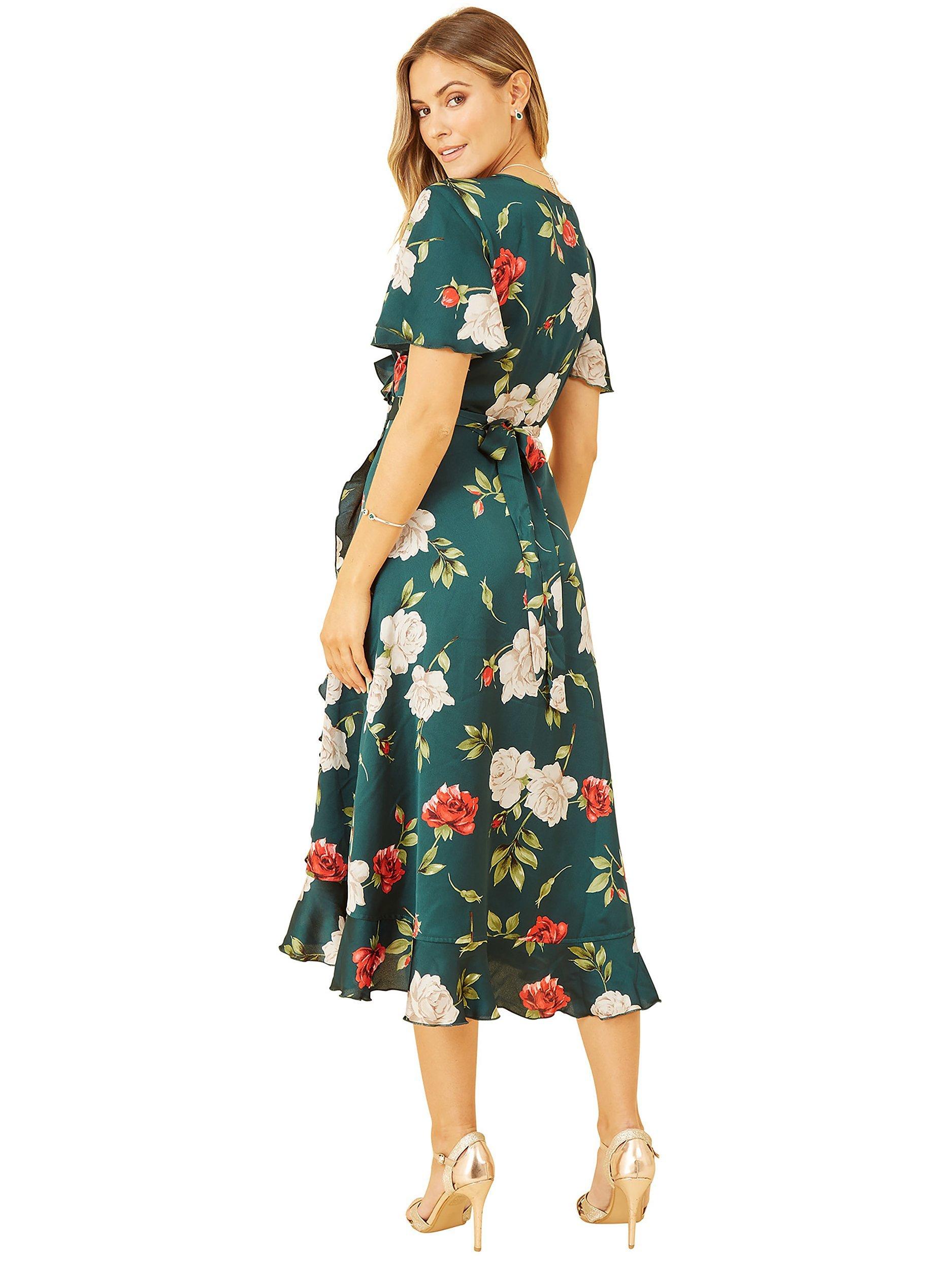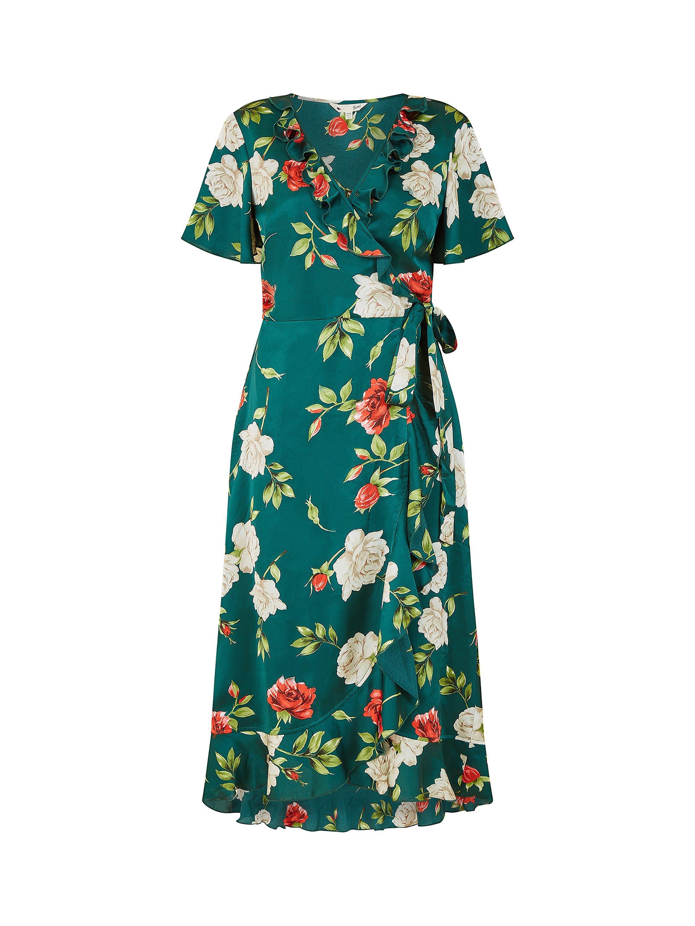 YumiSatin Rose Print Wrap Dress, Green