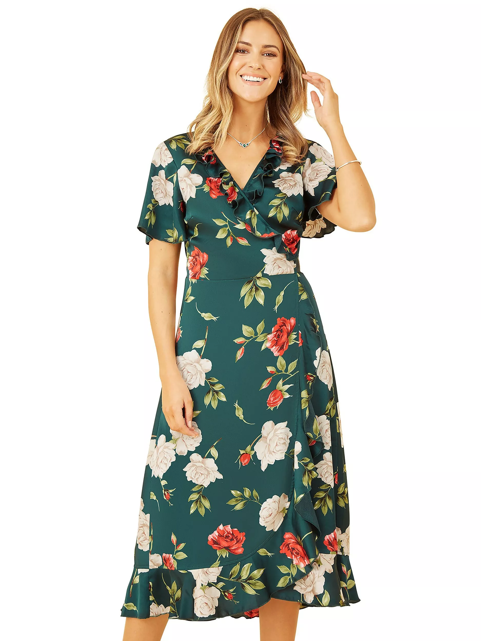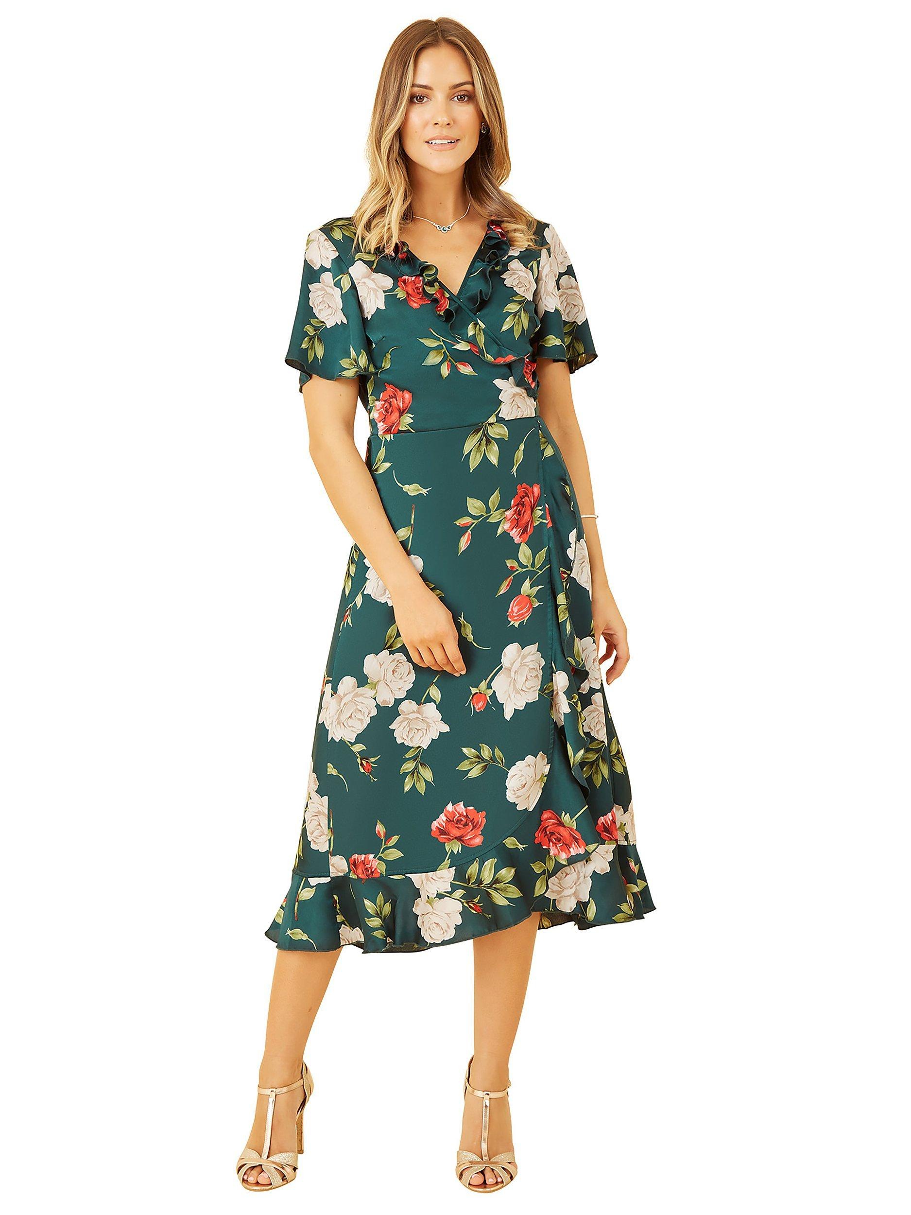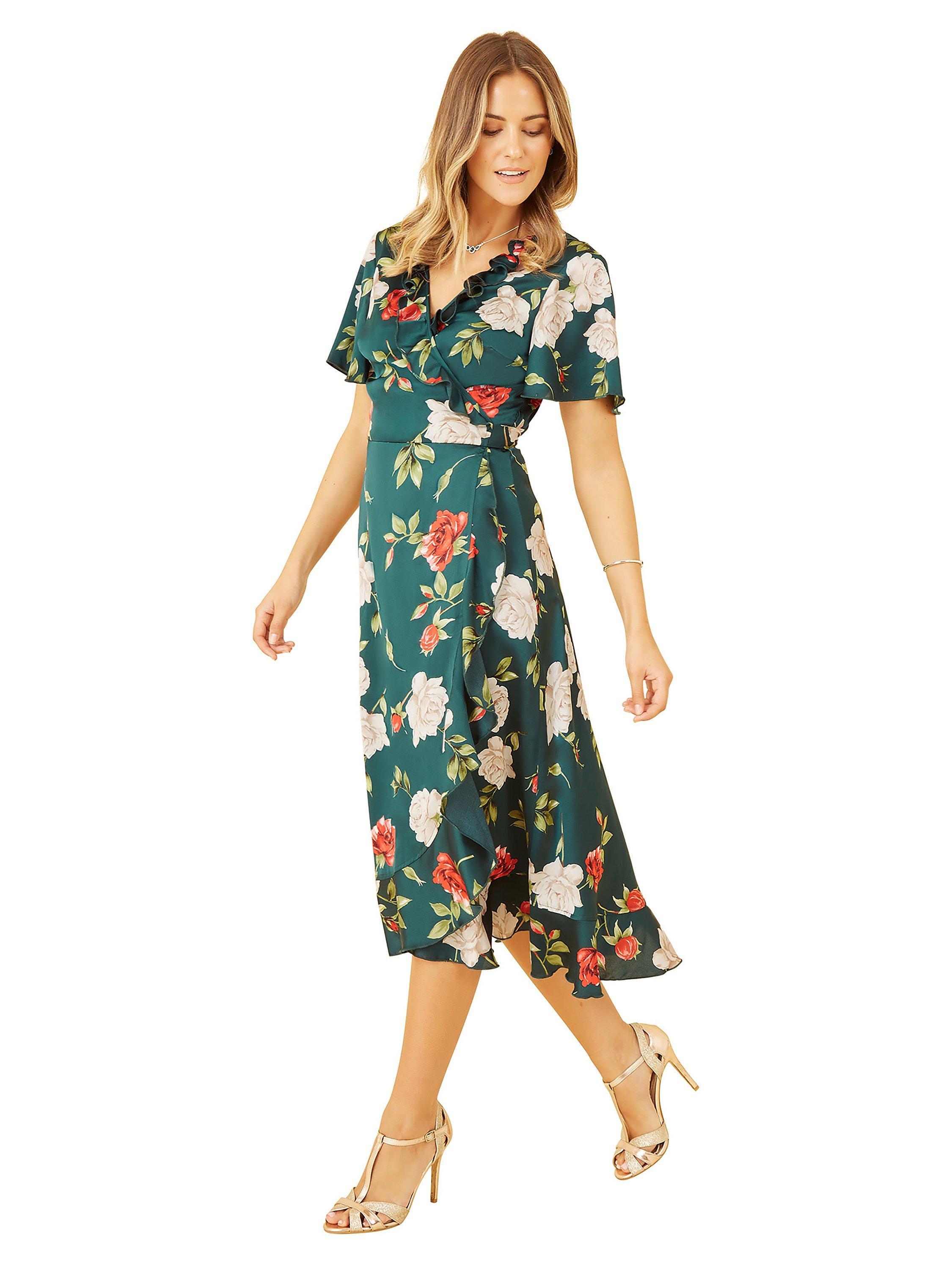 YumiSatin Rose Print Wrap Dress, Green