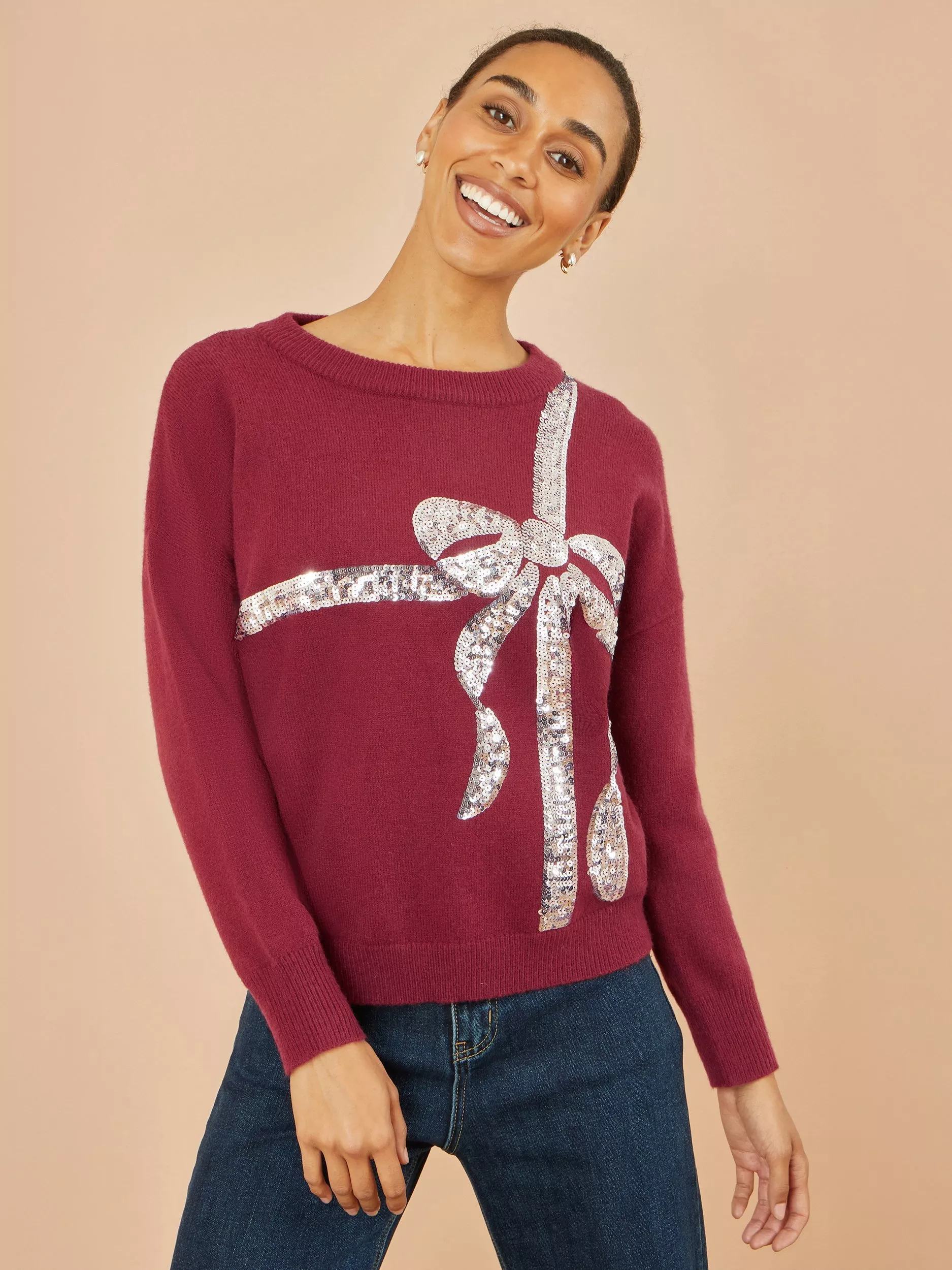 Sparkle this season in this easy-wear-anywhere fun festive jumper. This Yumi Burgundy Sequin Bow Knitted Jumper features a textured, large sequin bow, layered onto a supersoft knitted jumper. Perfect for layering, Christmas parties and gifting.