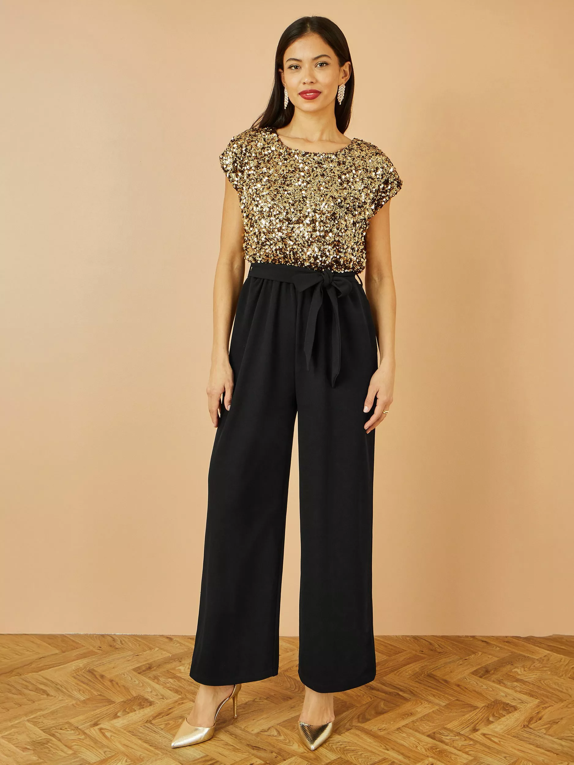 Go for glam this season in this jumpsuit from Yumi. The sequin top design offers a relaxed fit, with a stretch wide leg trouser to keep the look fun but formal. The tie at the waist offers a gorgeous shape, with the round neckline and dropped shoulder sleeves dazzle with sparkle.