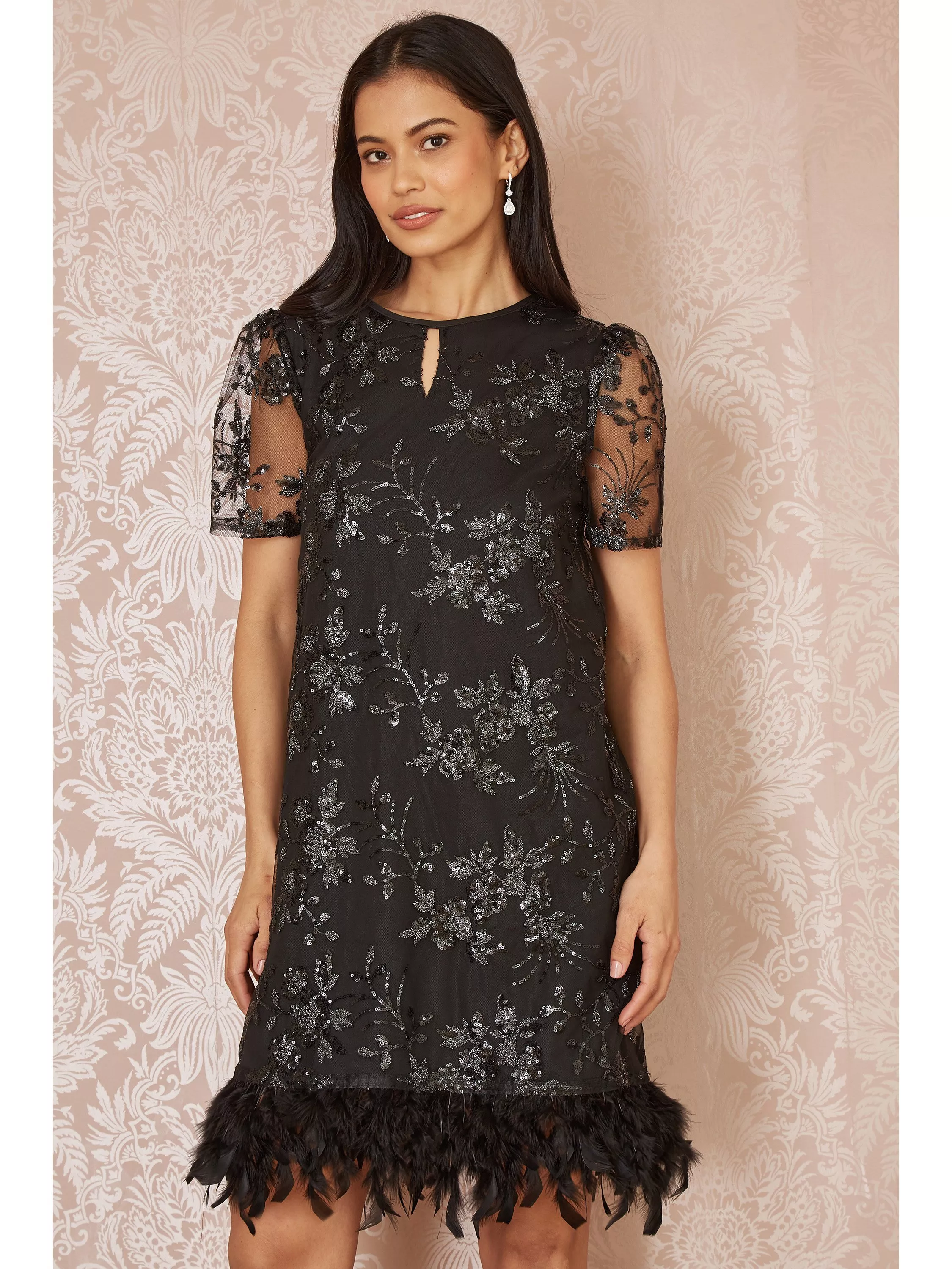 This elaborate little number is perfect for the upcoming Christmas season. In a simple tunic shape, it's the details that really make this dress the spectacular stunner that it is. With all over sequinned embroidery, cute little puffed sleeves and the stand out, that feather trimmed hemline!